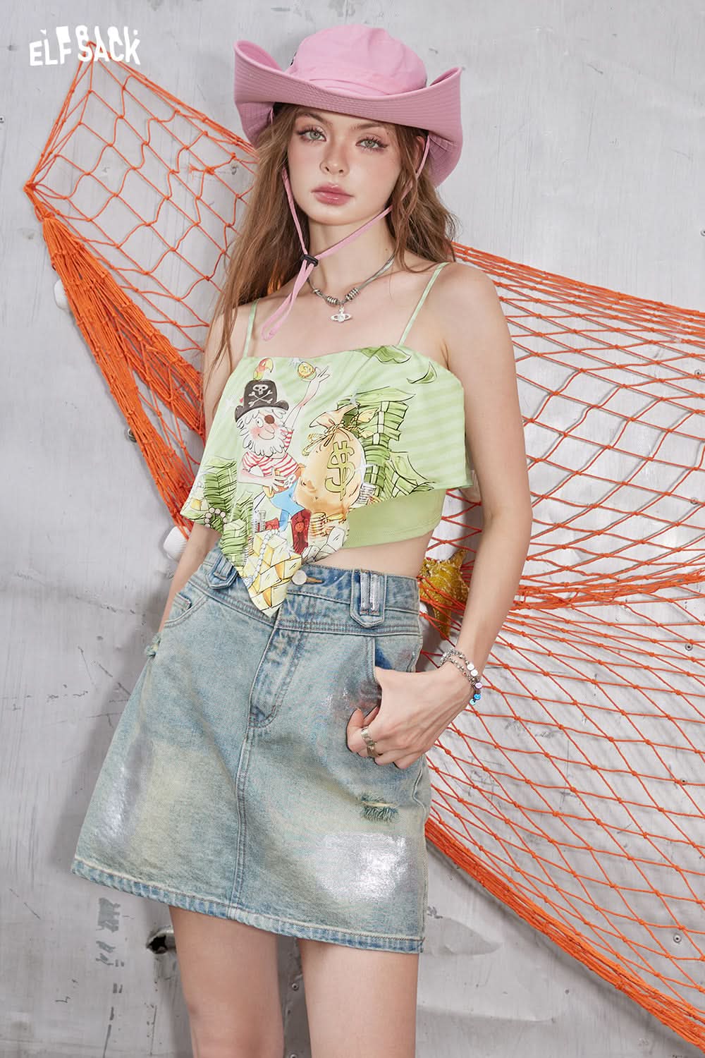 Brushed silver hole high waist A-line skirt, women's versatile denim short skirt