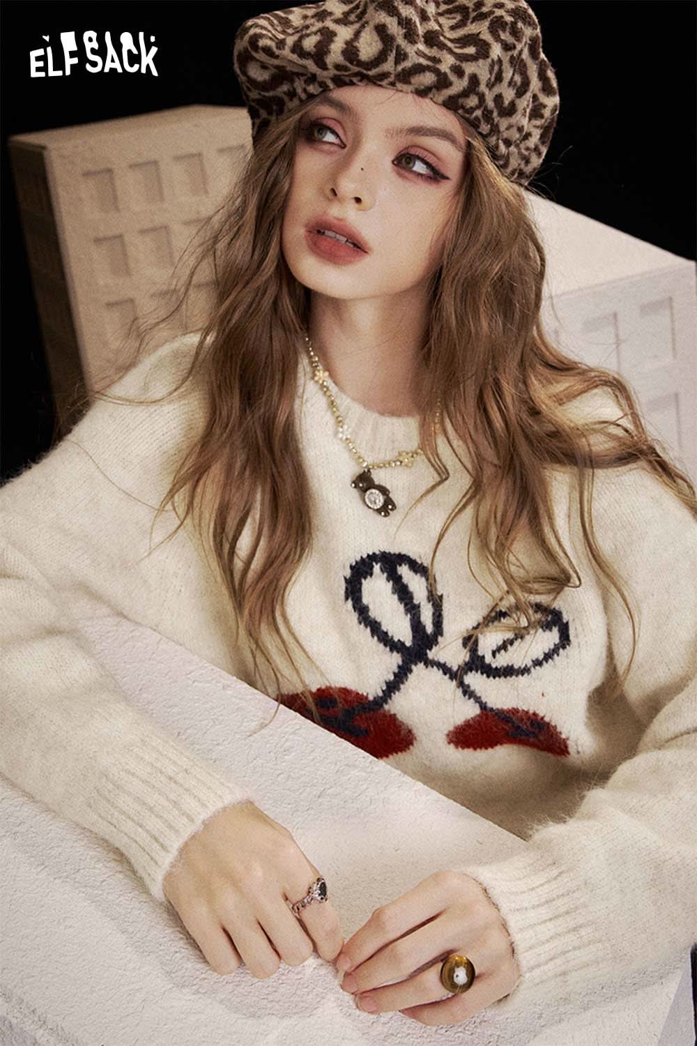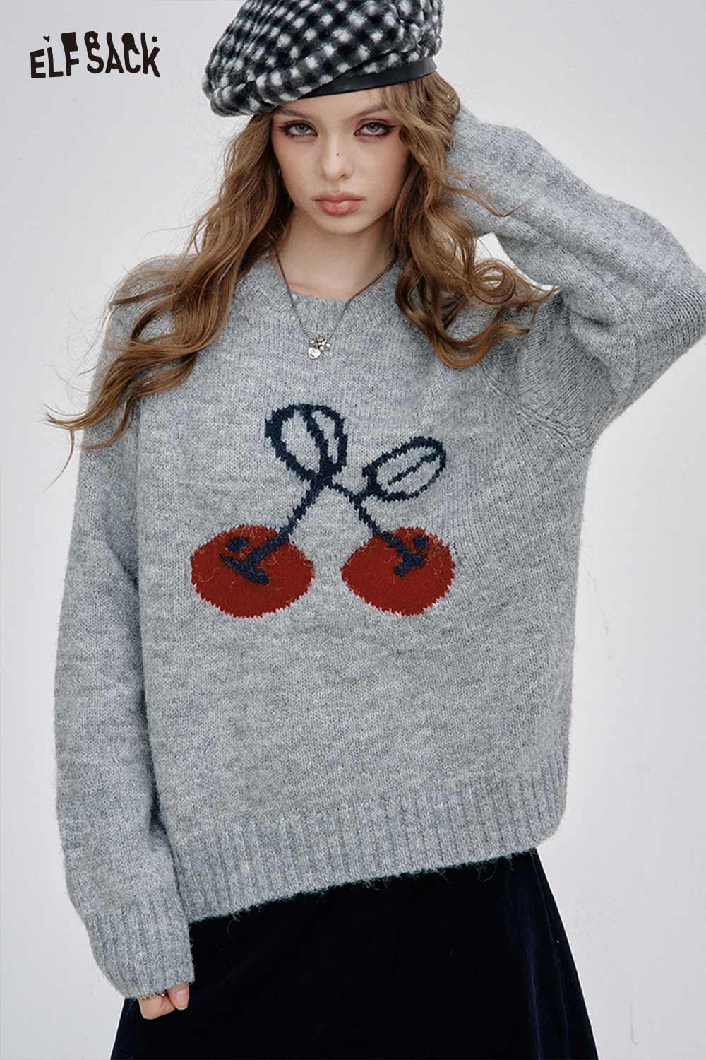 Soft Knit Cartoon Cherry Print Round Neck Sweater