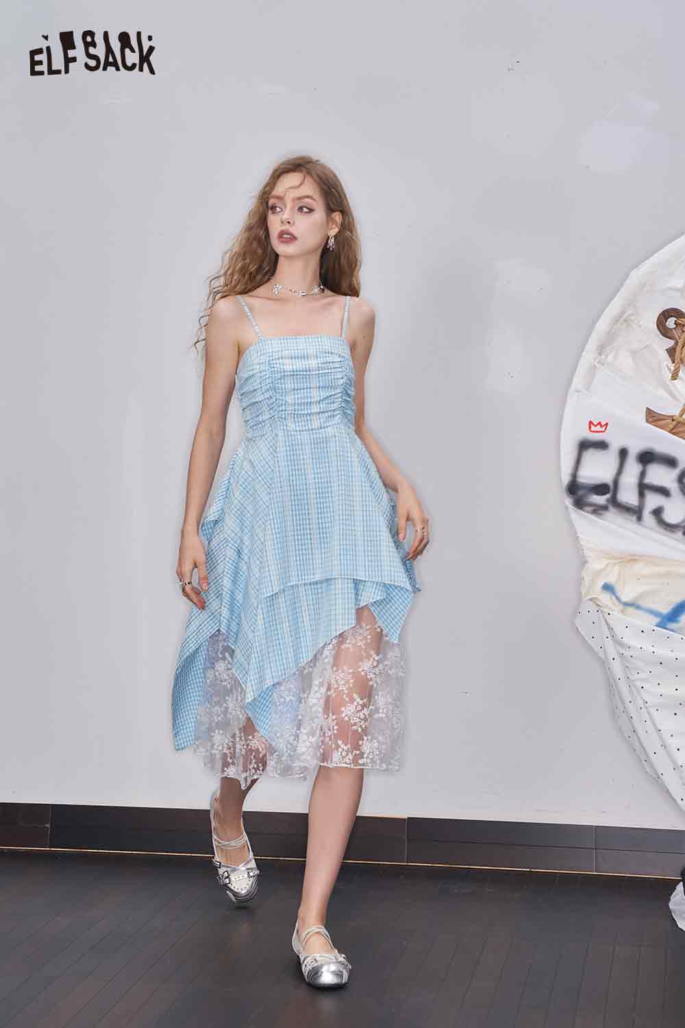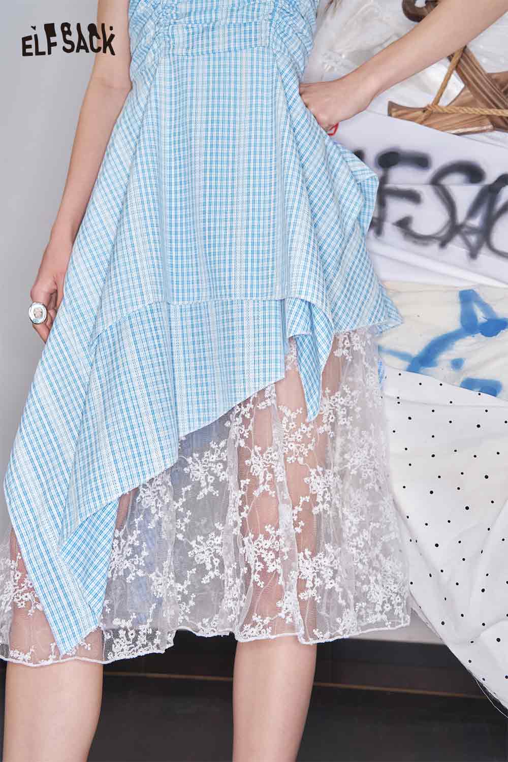 Cute Lace Plaid Asymmetric Slip Design Dress