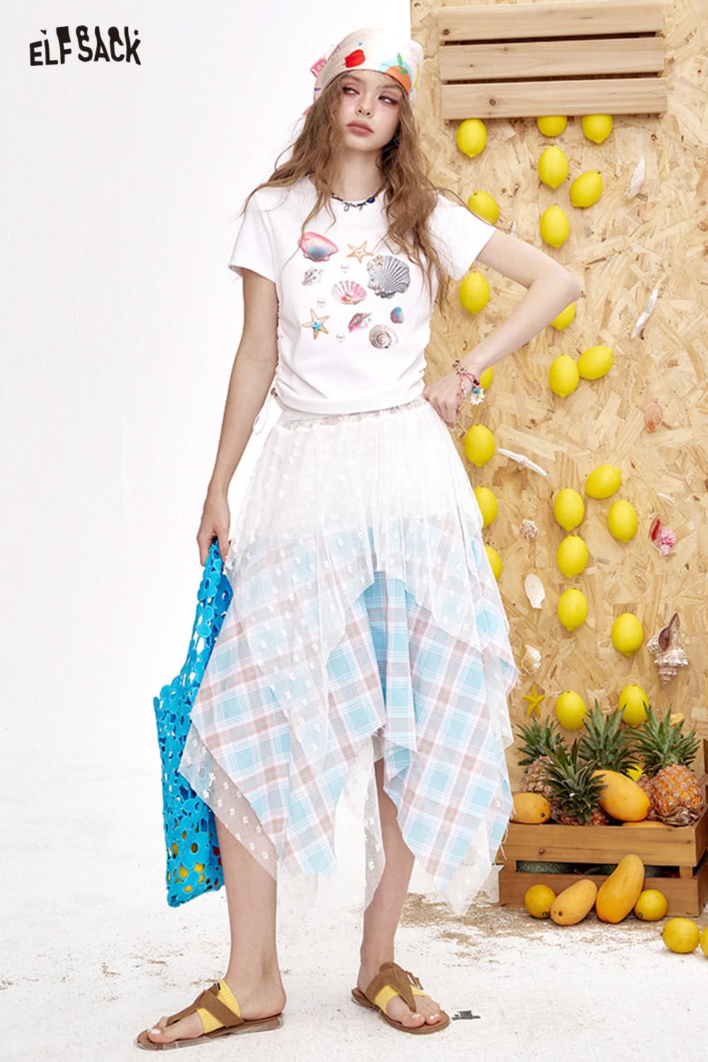 Plaid Patchwork Lace Mesh Irregular Chic Skirt