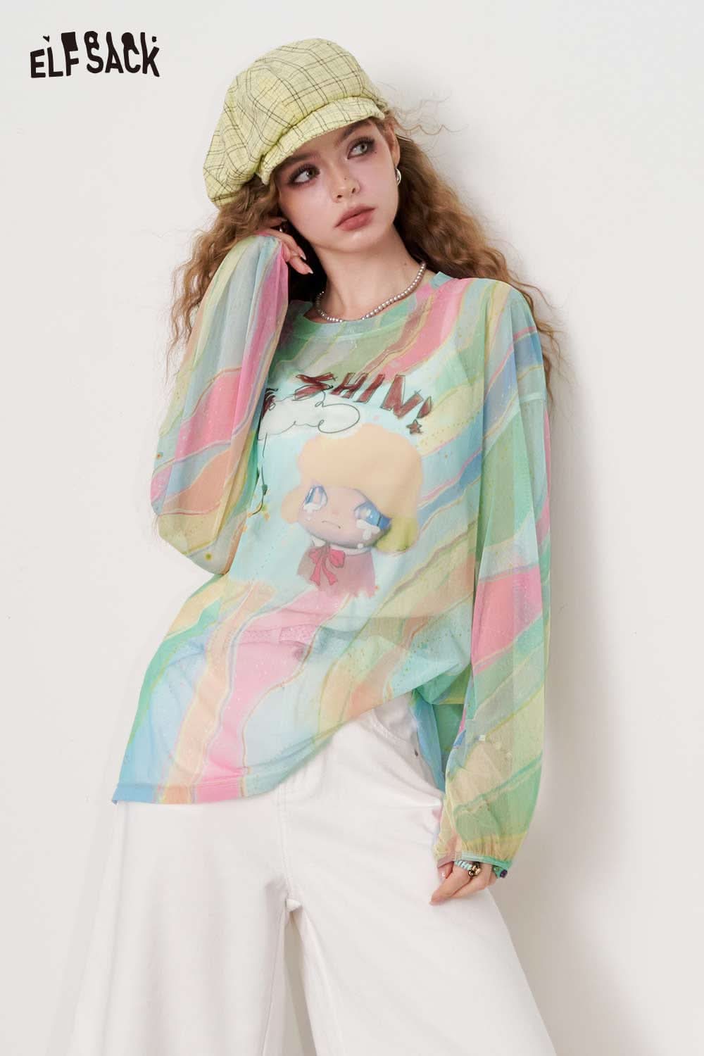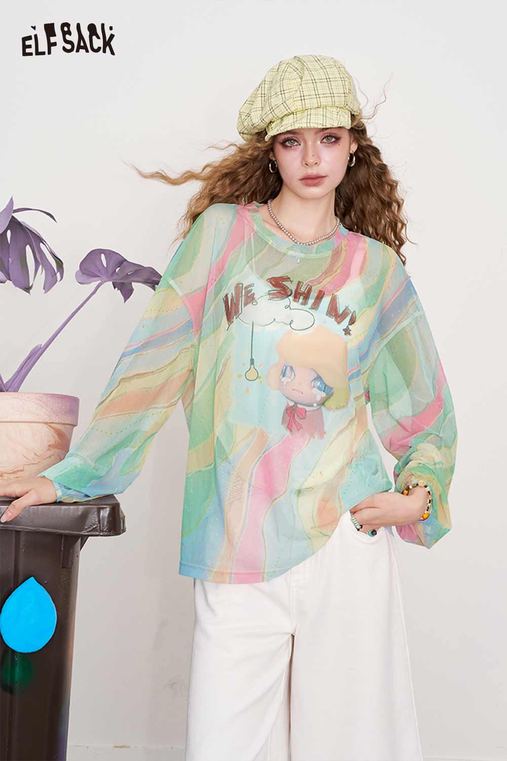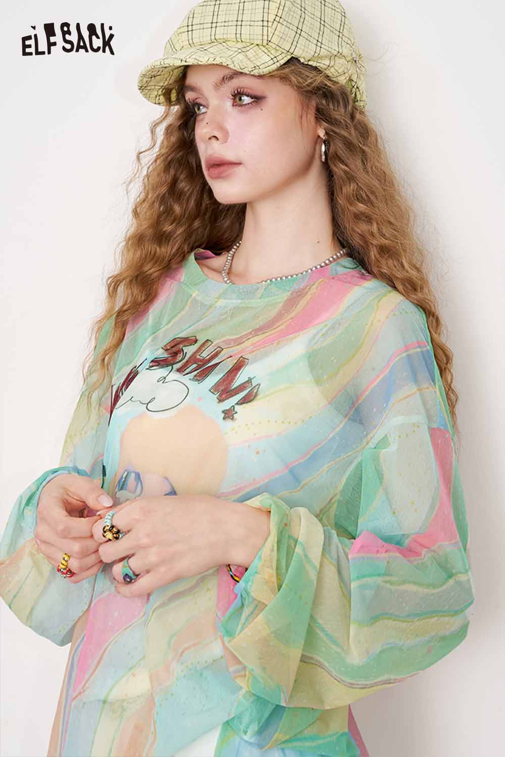 Light Dopamine Graphic Mesh Long Sleeve Oversized Cover-Up Top Lagenlook Style
