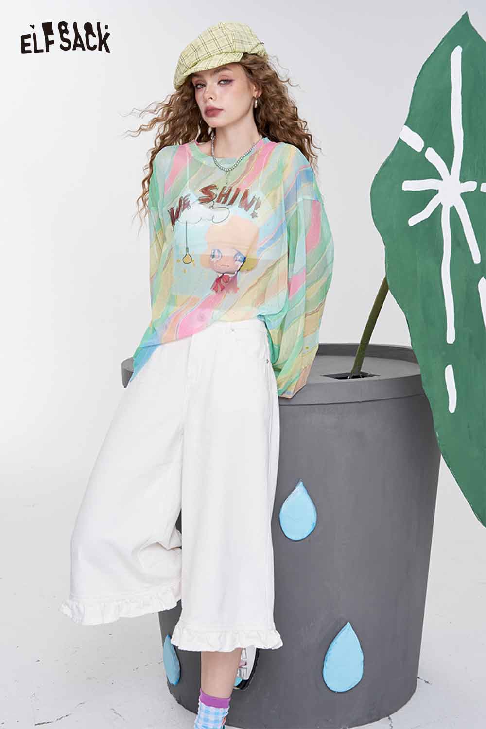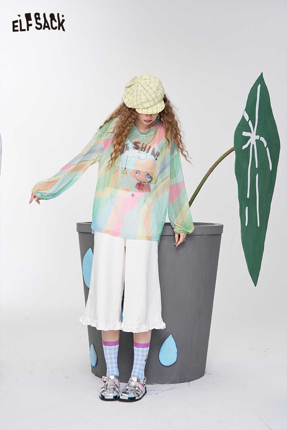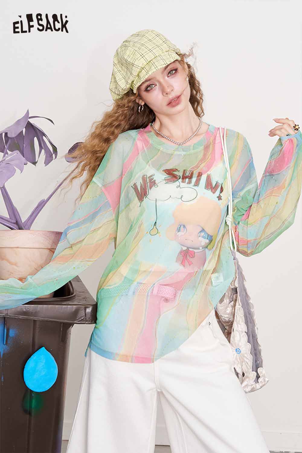 Light Dopamine Graphic Mesh Long Sleeve Oversized Cover-Up Top Lagenlook Style
