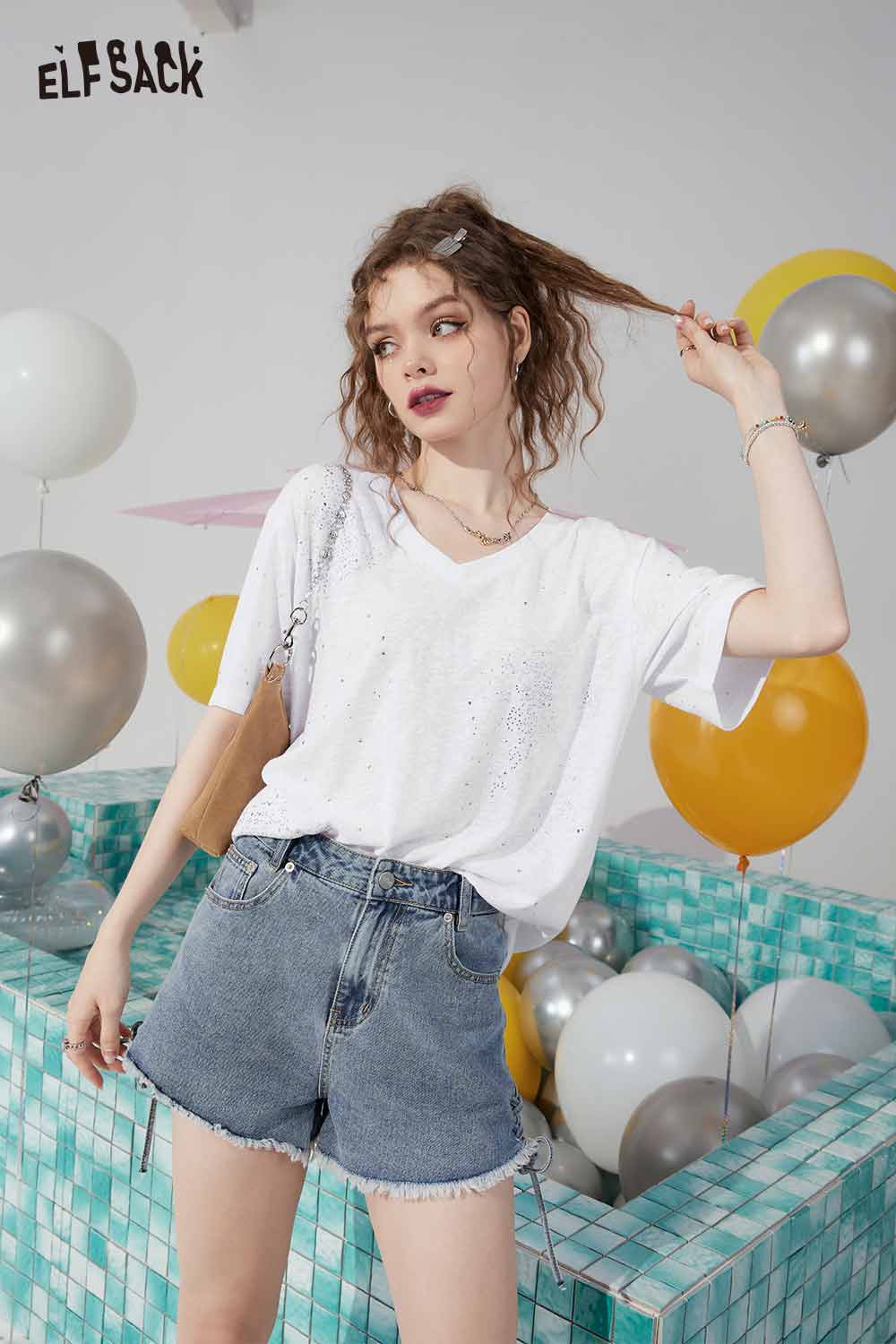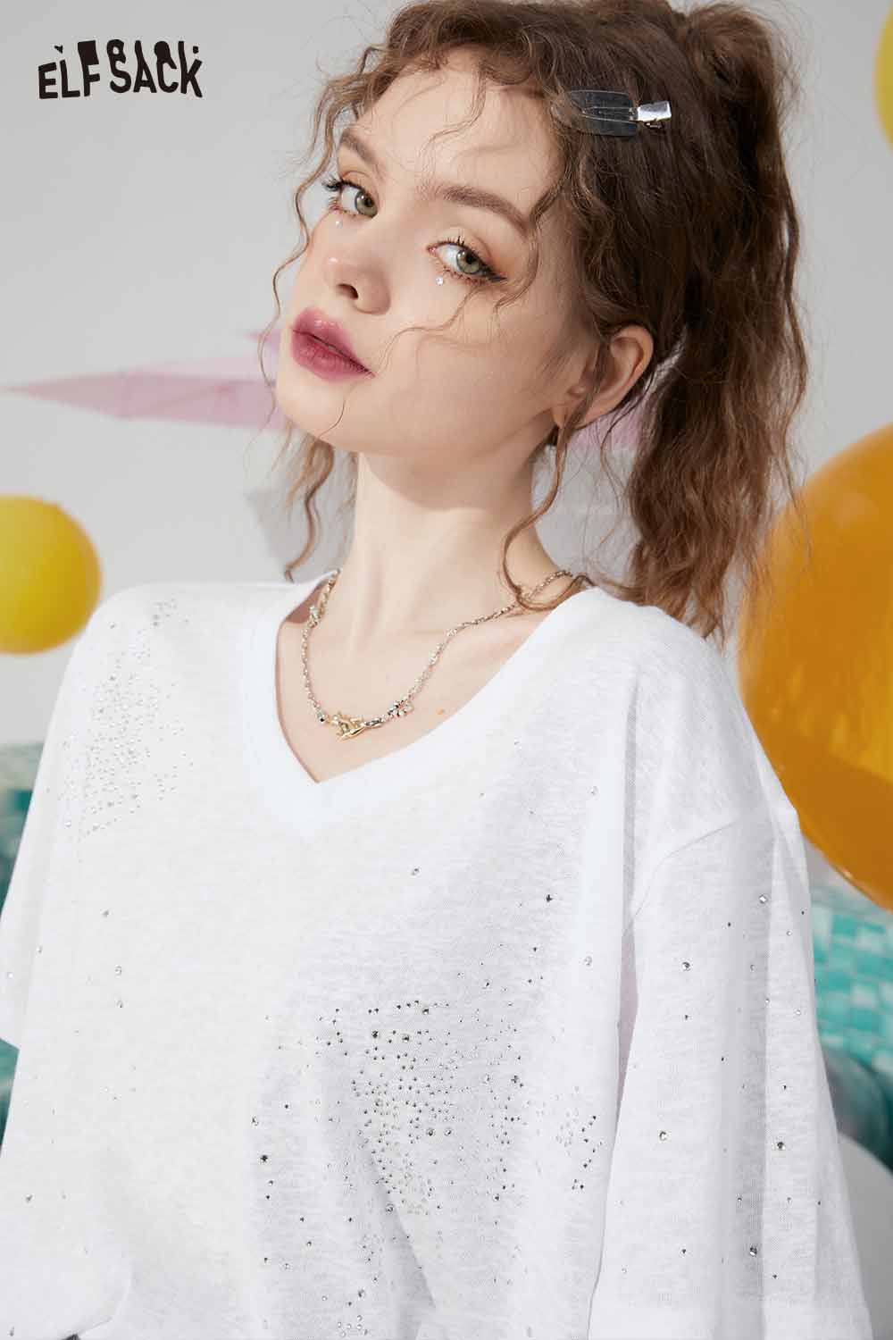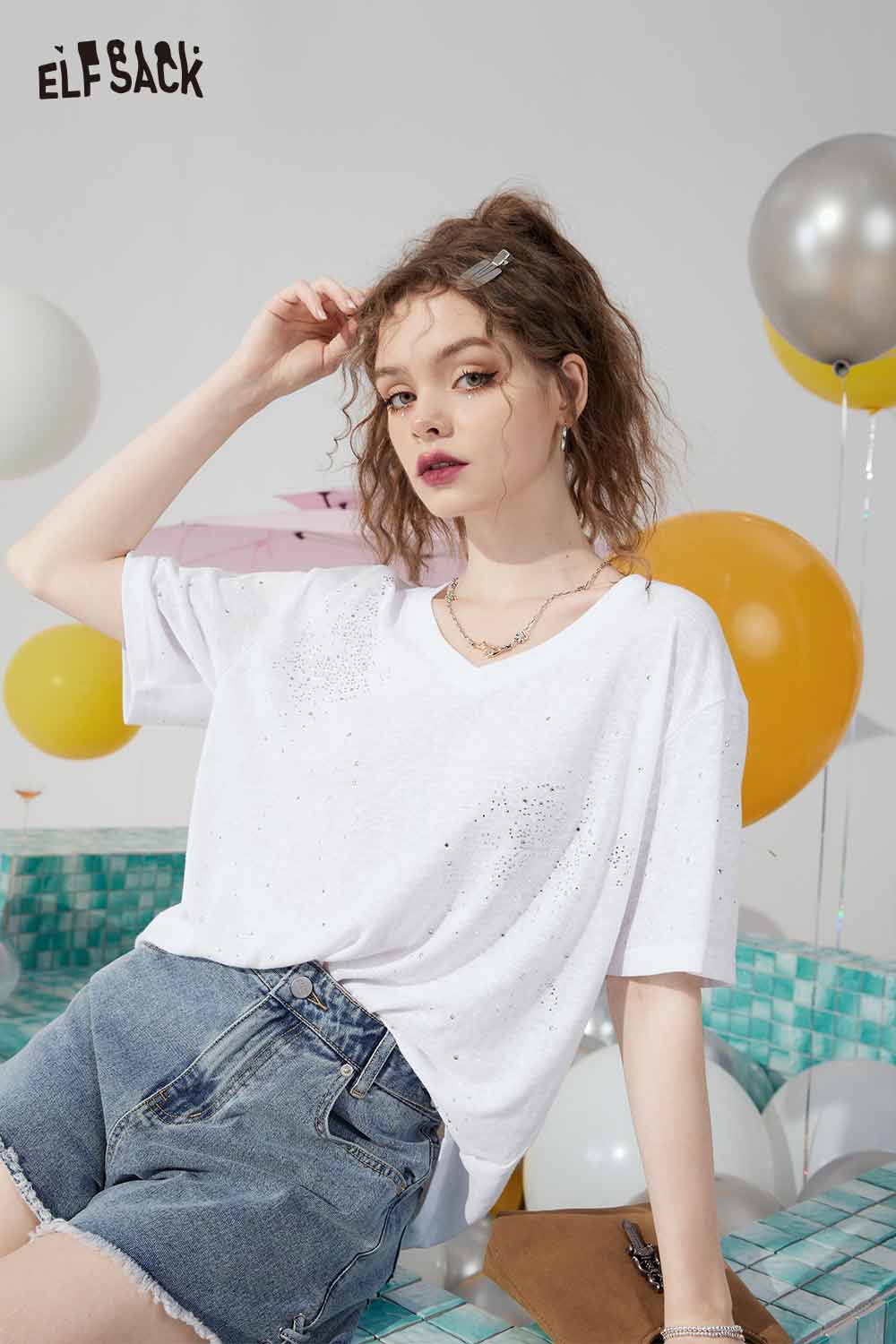 Minimalist Solid V Neck Rhinestone Short Sleeve Tshirt