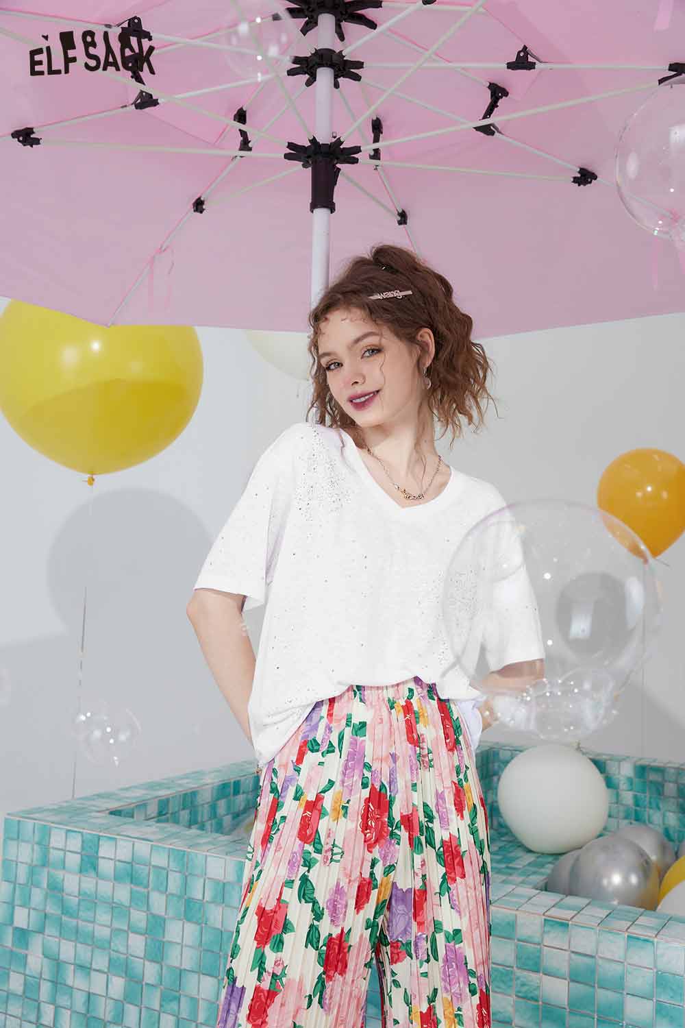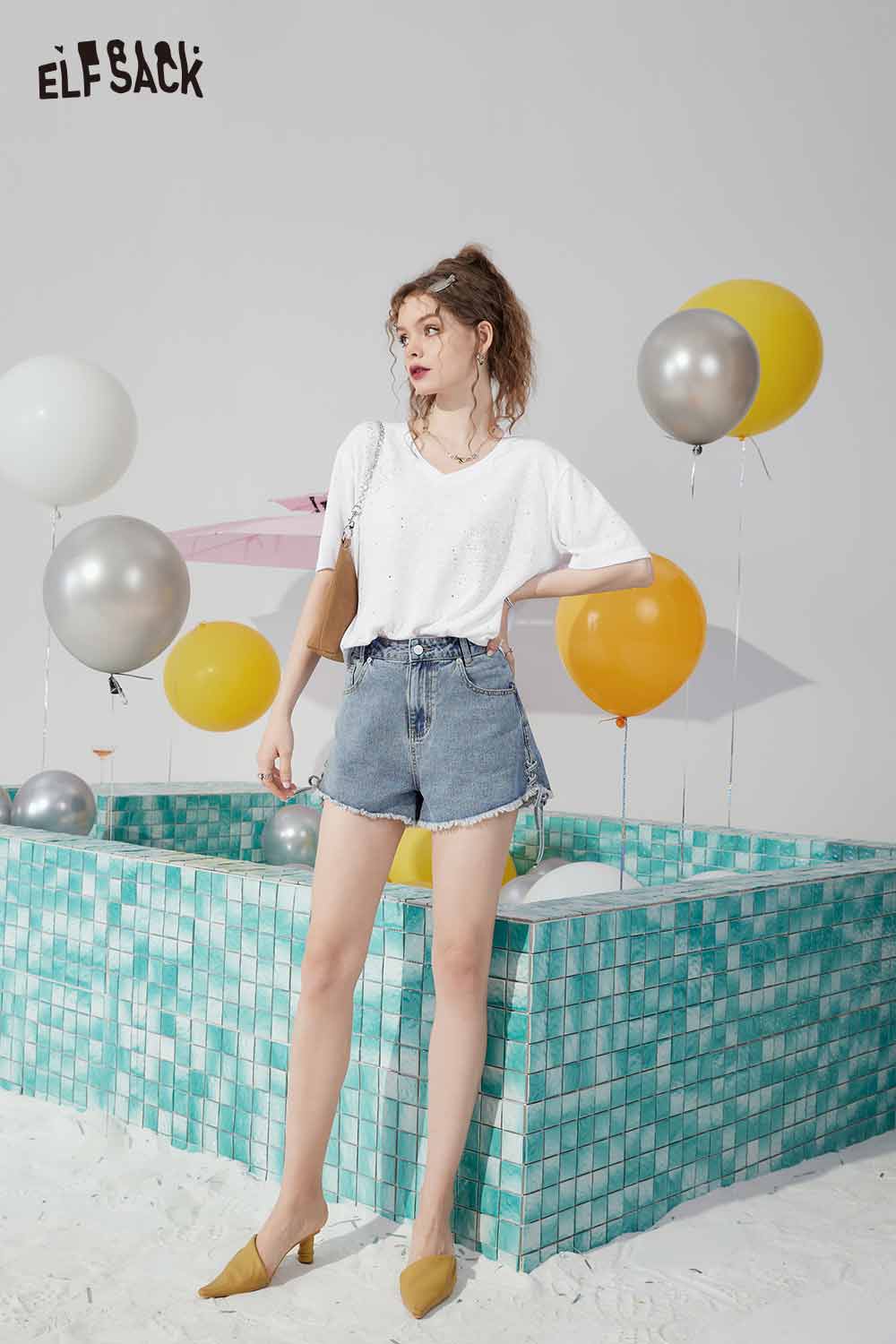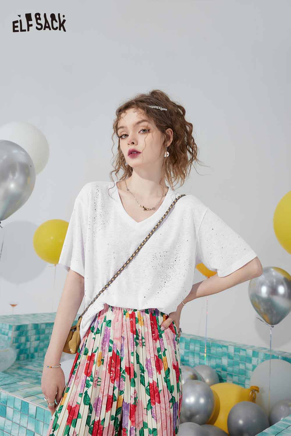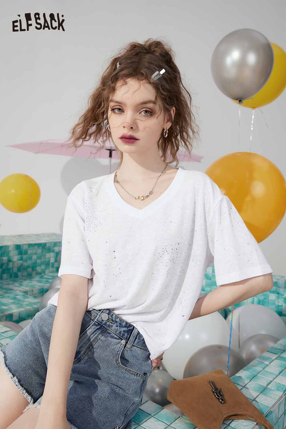 Minimalist Solid V Neck Rhinestone Short Sleeve Tshirt