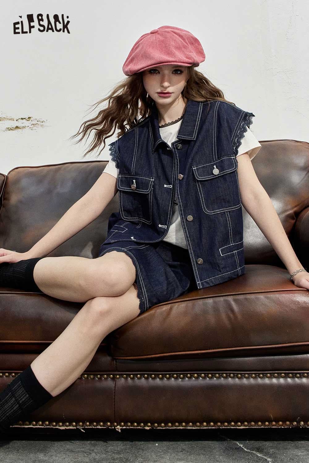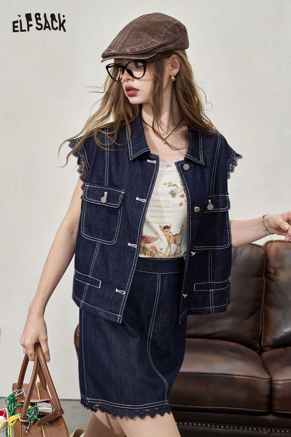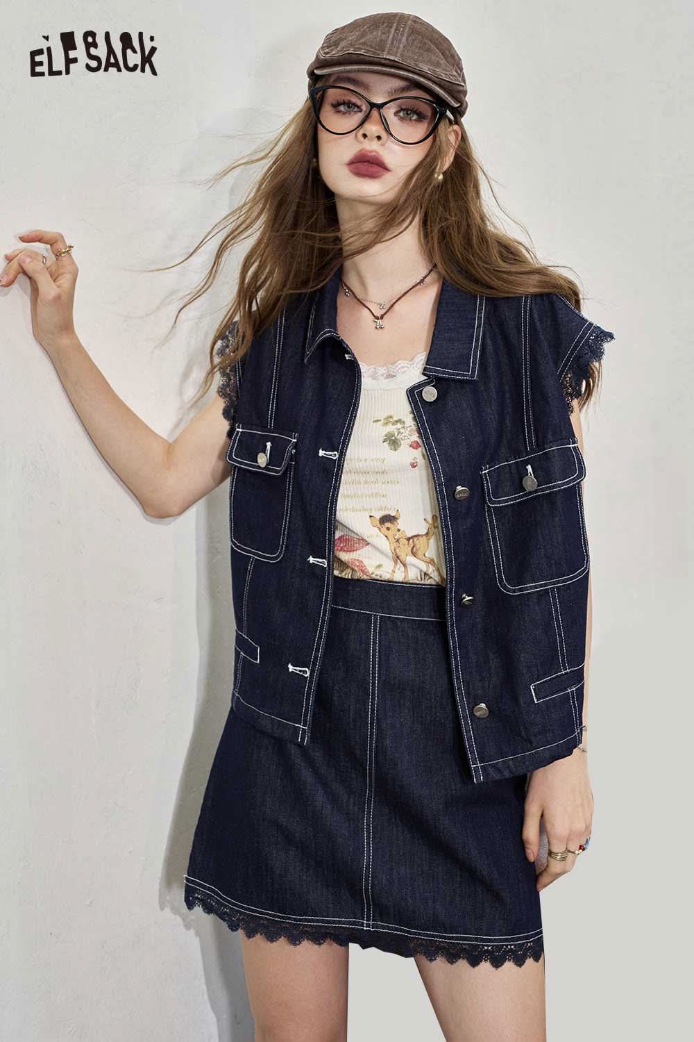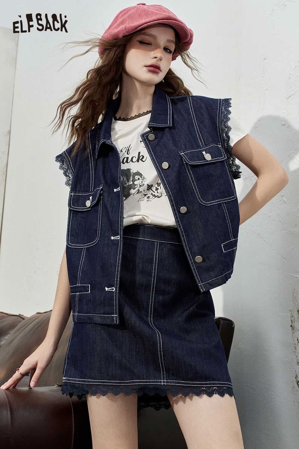 Soft Lace Patchwork Denim Vest Half Skirt Set