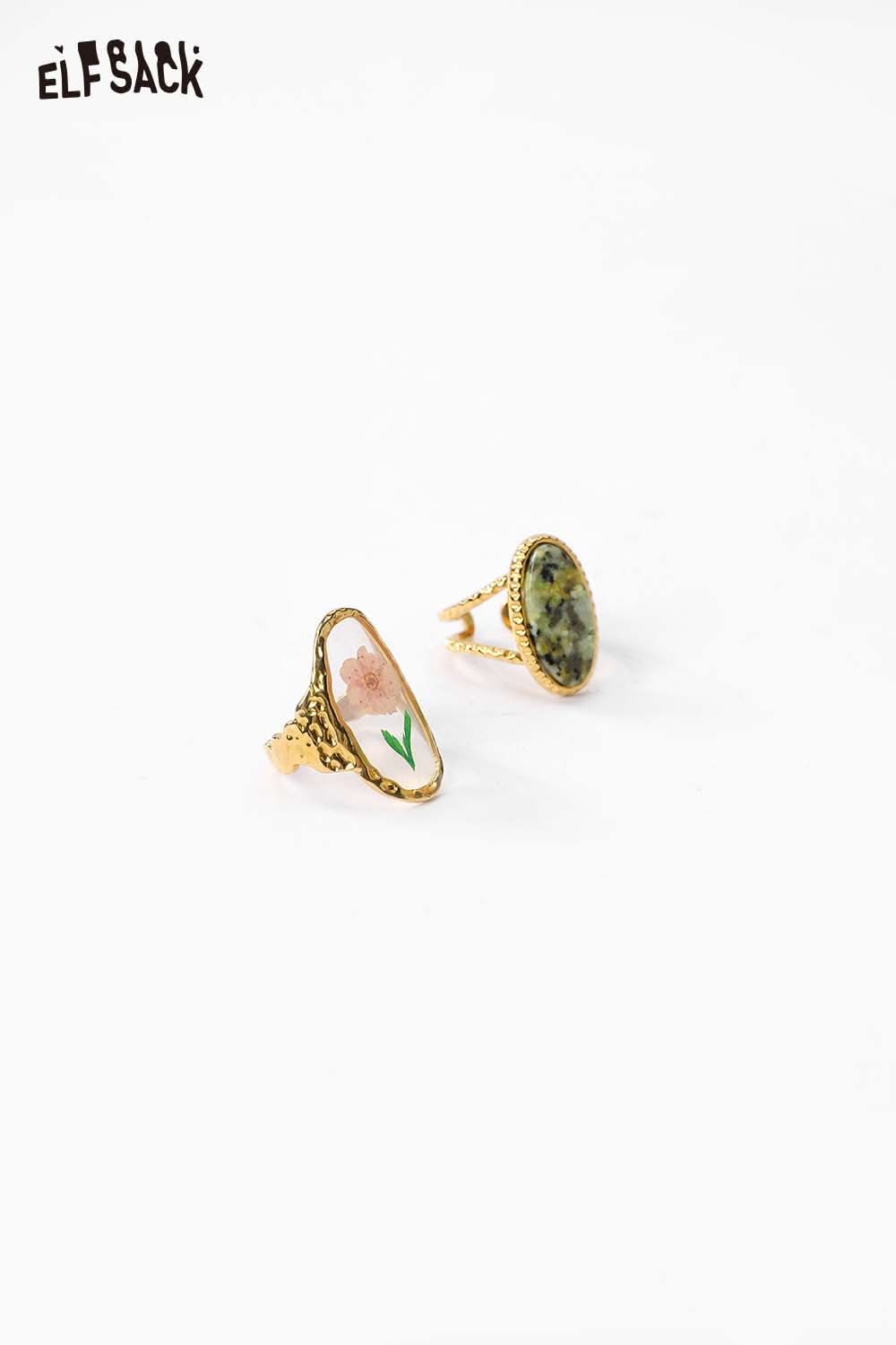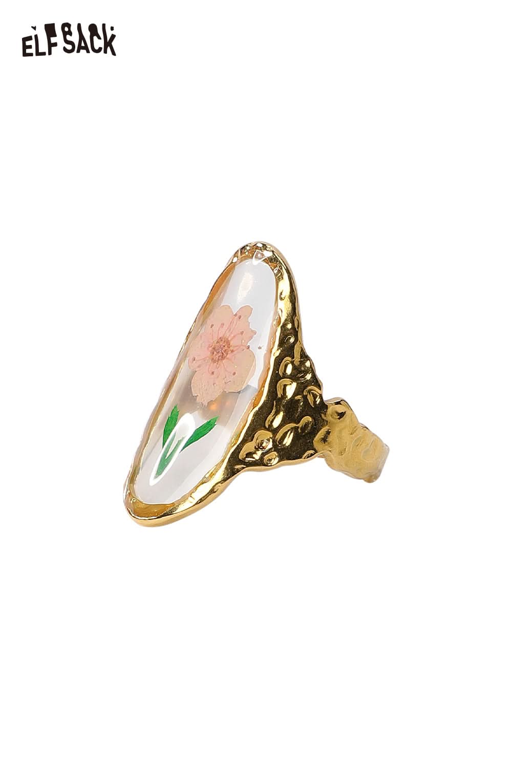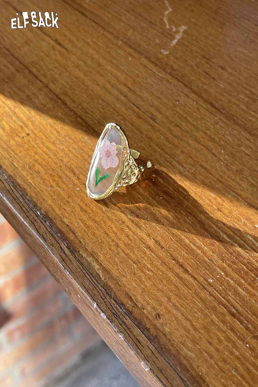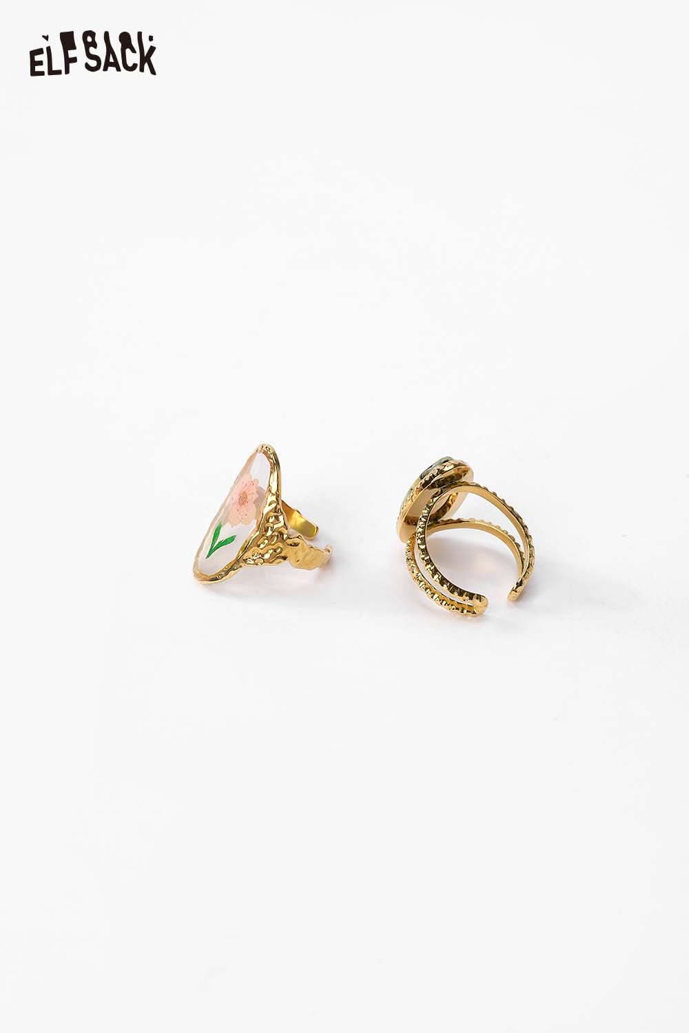 Transparent Epoxy Tulip Print Gold Retro Open Ring