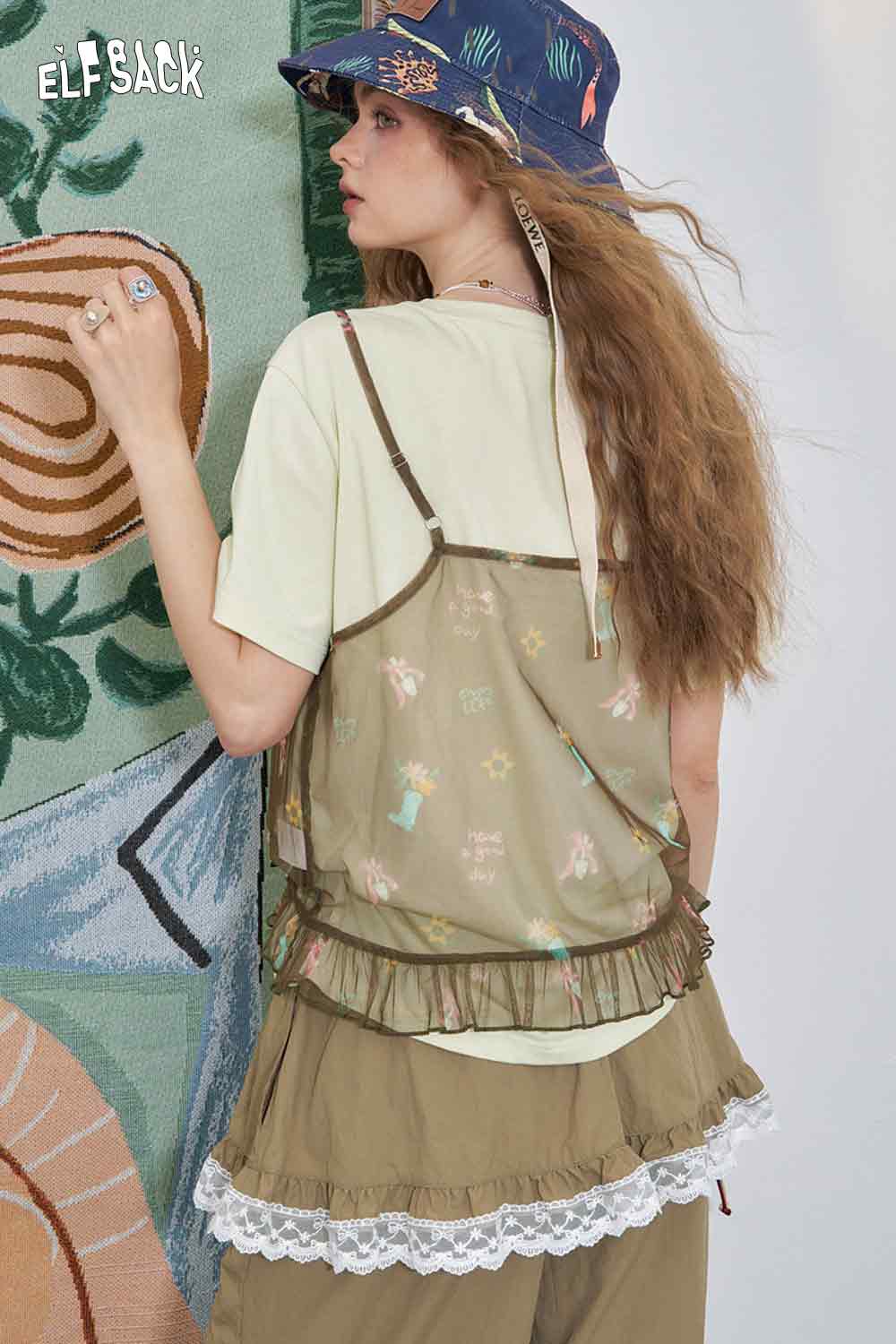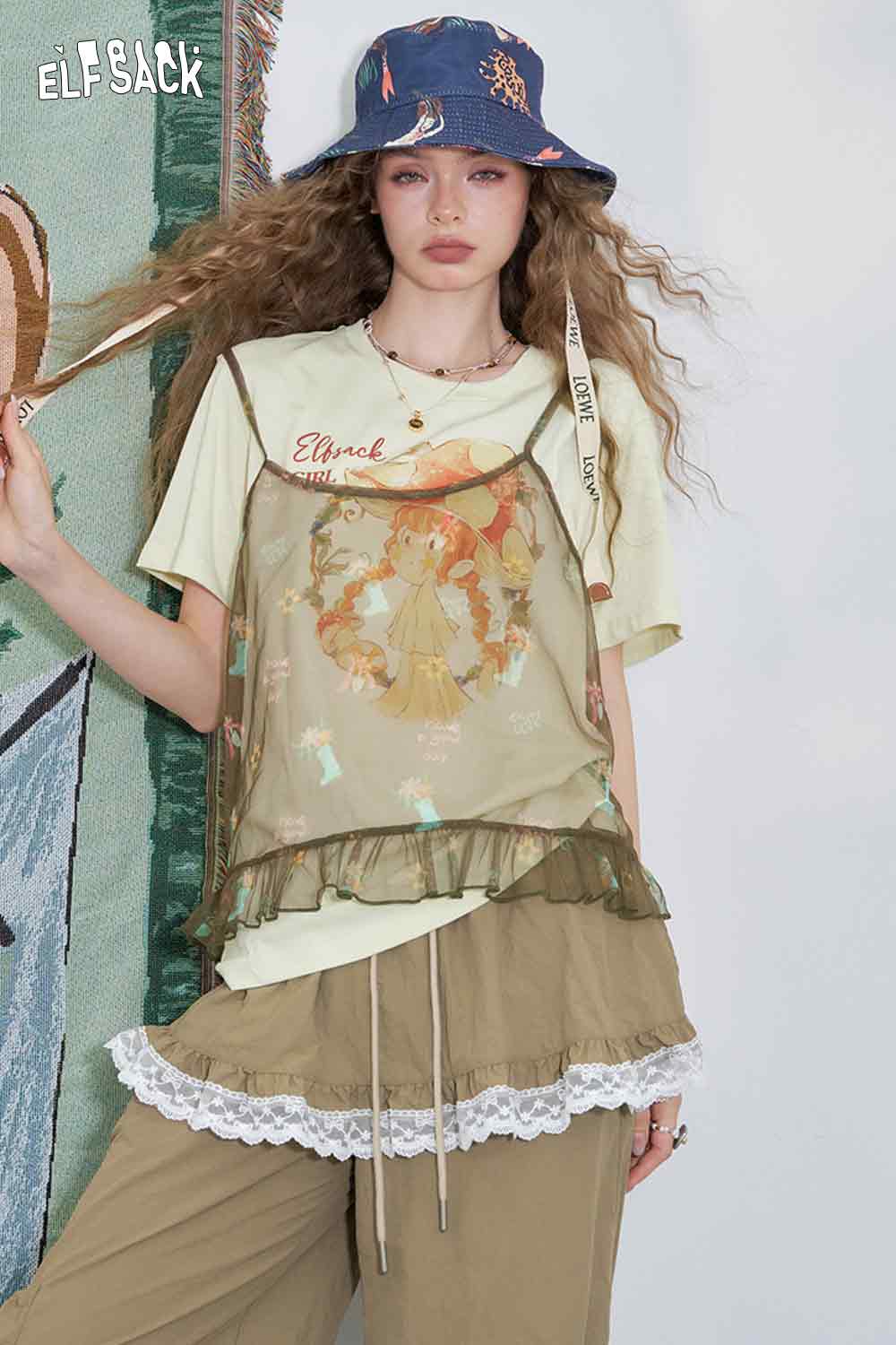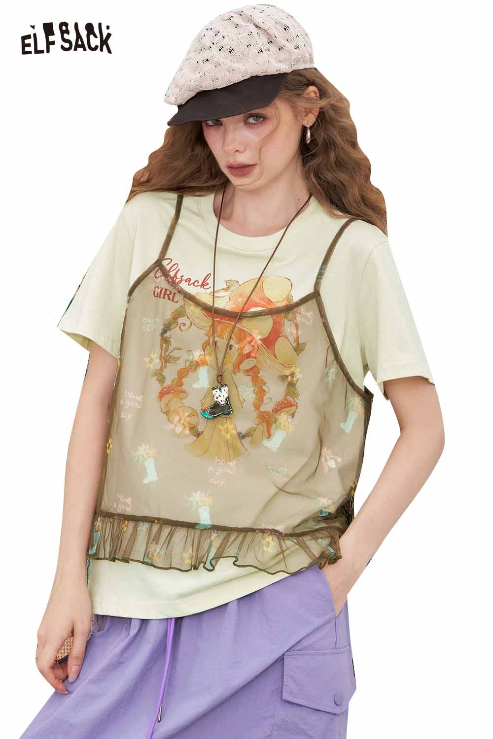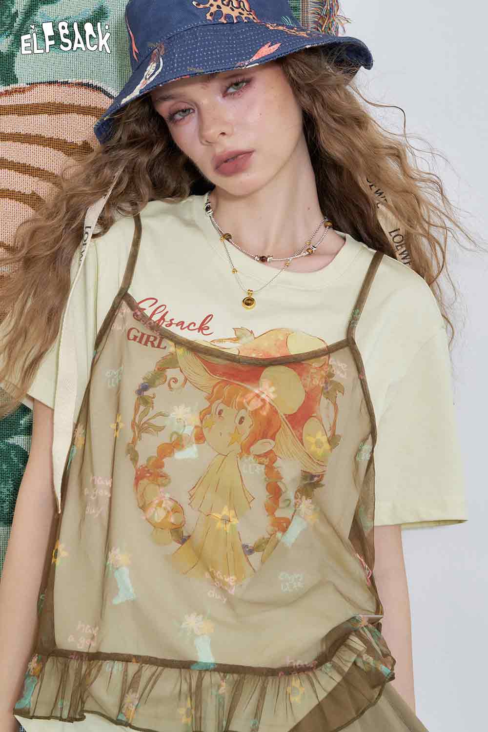 Mesh Cotton Loose Halter Printed Two-Piece T-Shirt