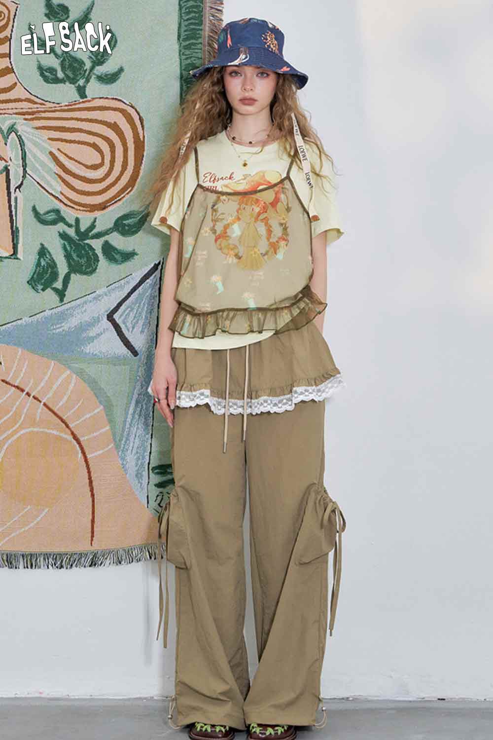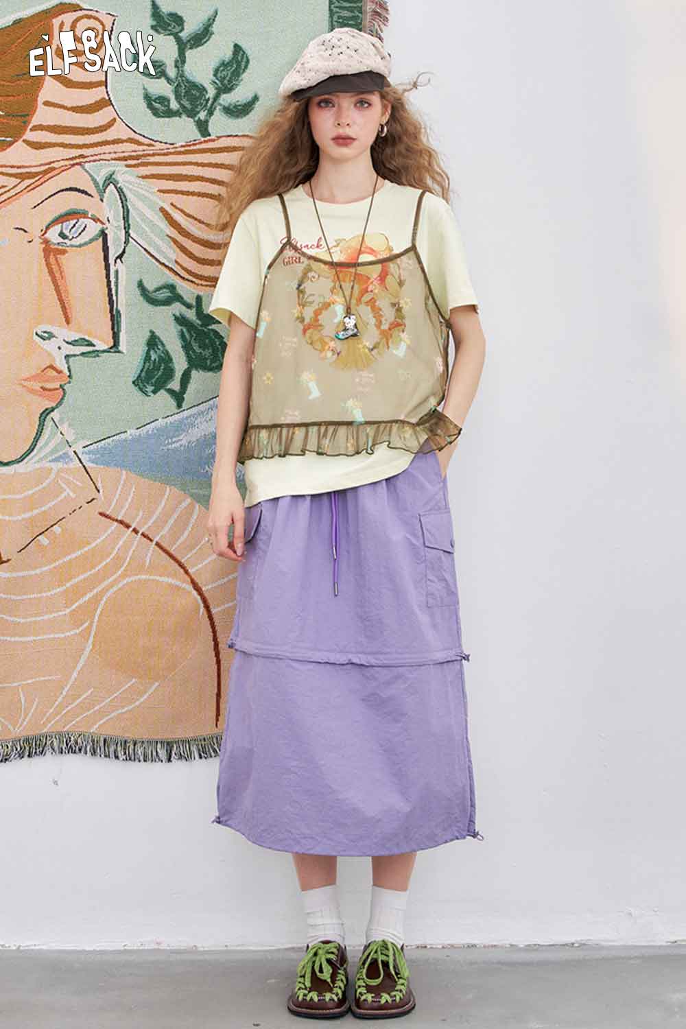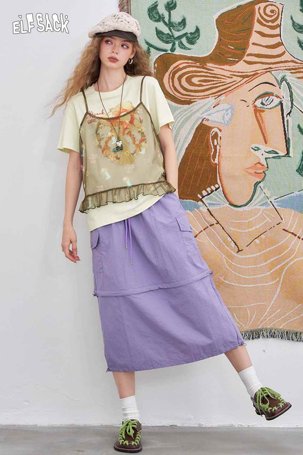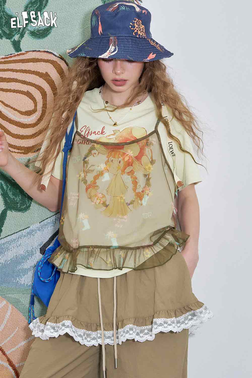 Mesh Cotton Loose Halter Printed Two-Piece T-Shirt
