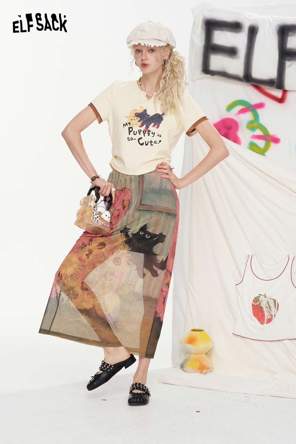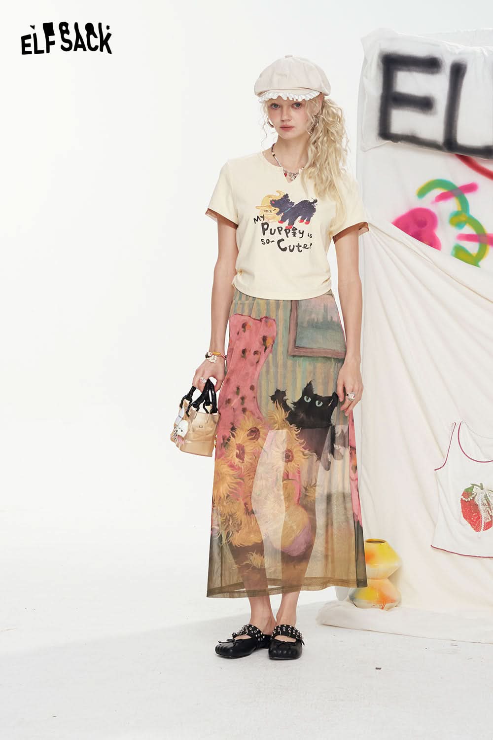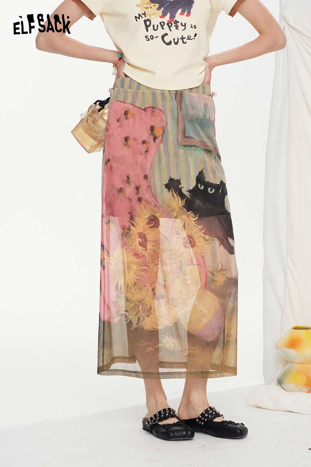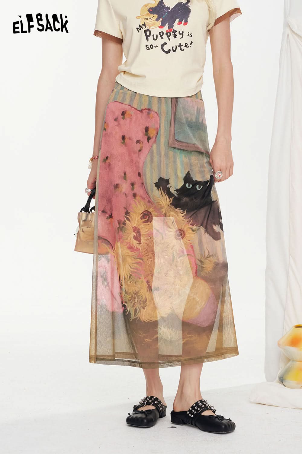 Cat Print Mesh Design A-Line High-Waist Skirt