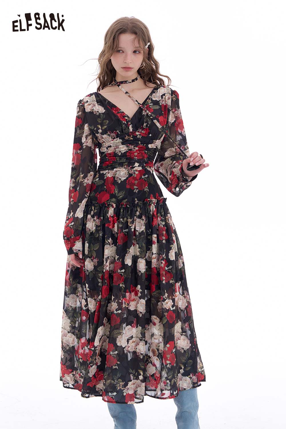 French Floral V Neck Slim Waist Elegant Bodycon Dress