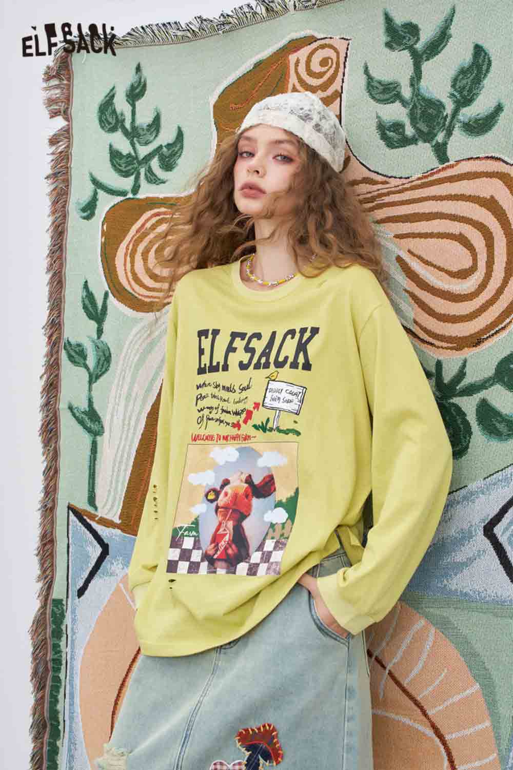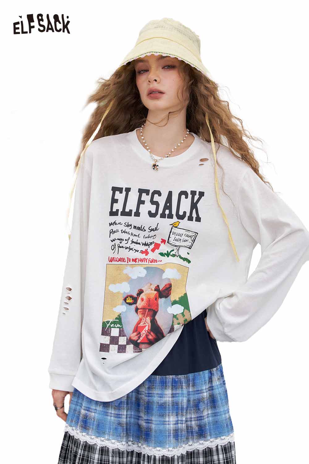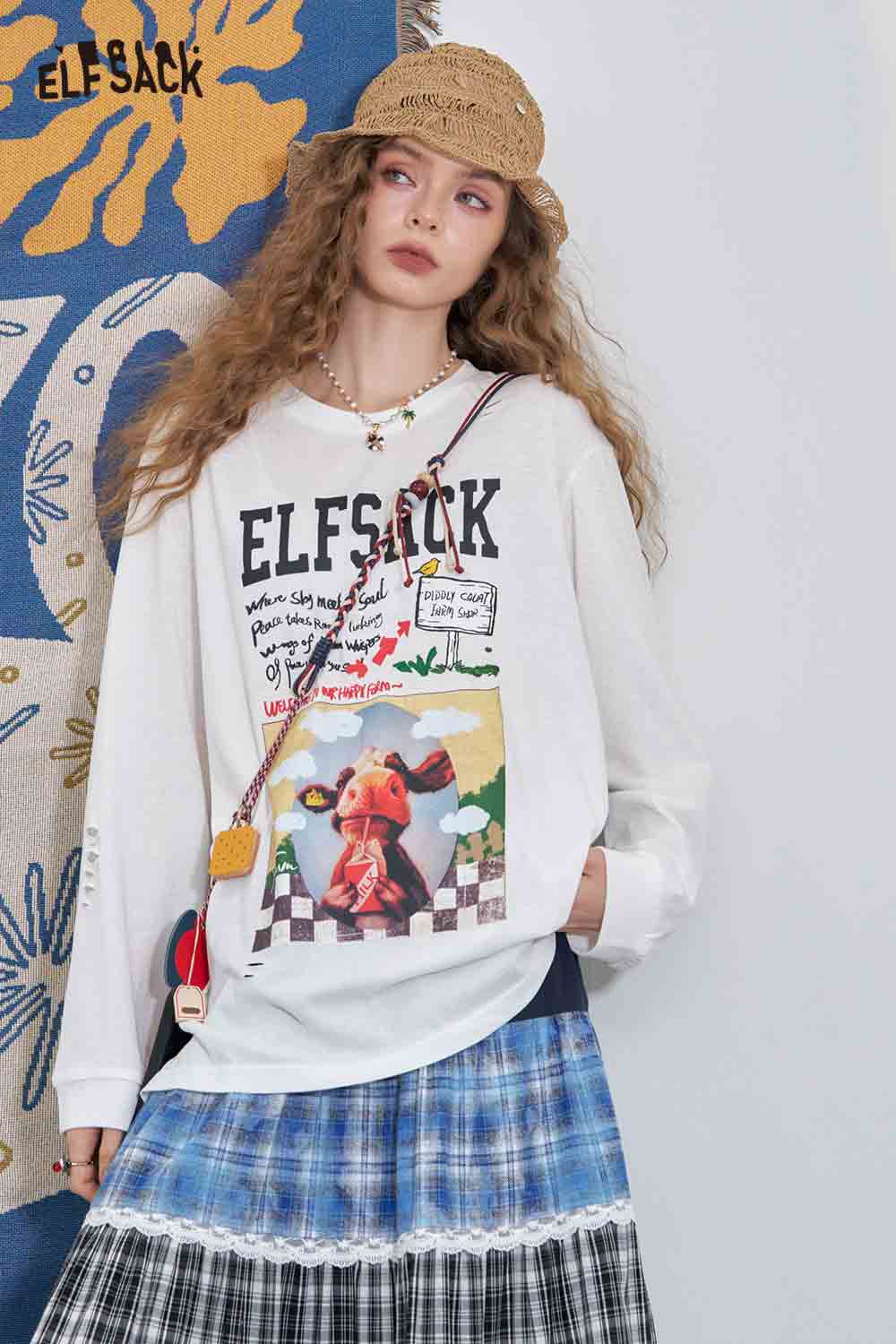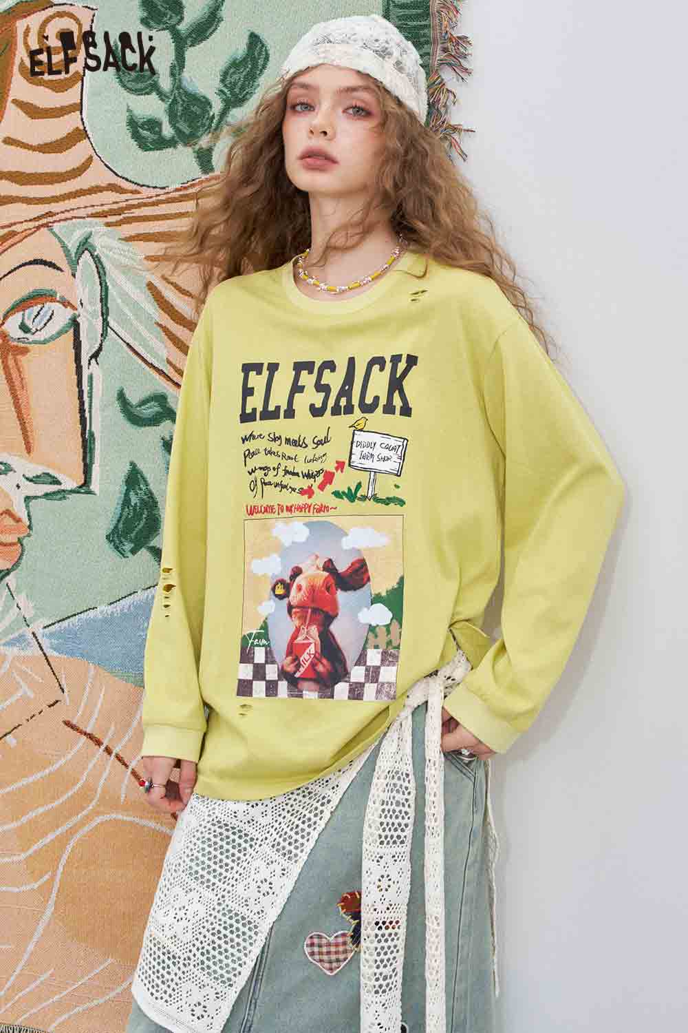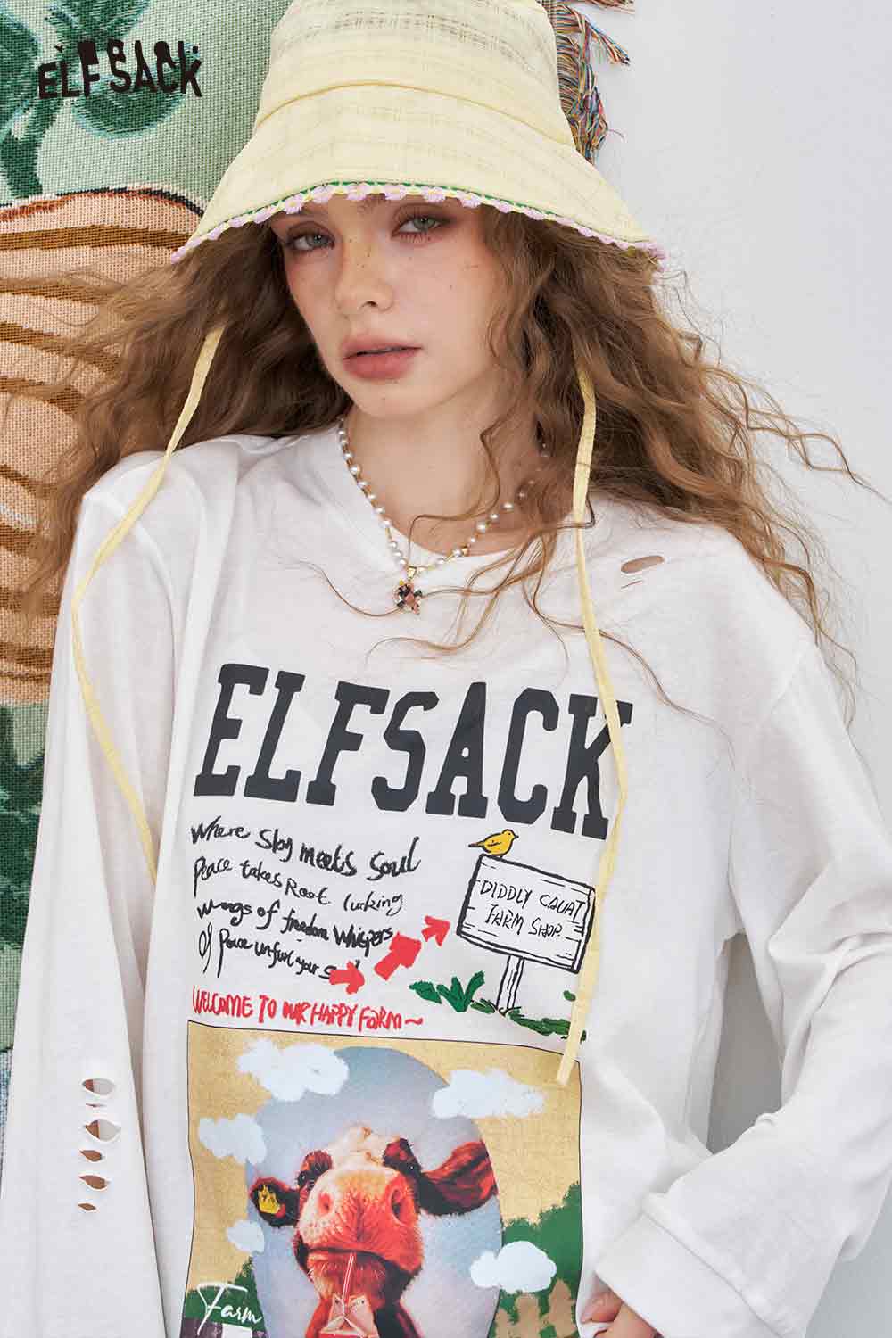 Cotton-Blend Loose Cow Printed Long-Sleeved T-Shirt