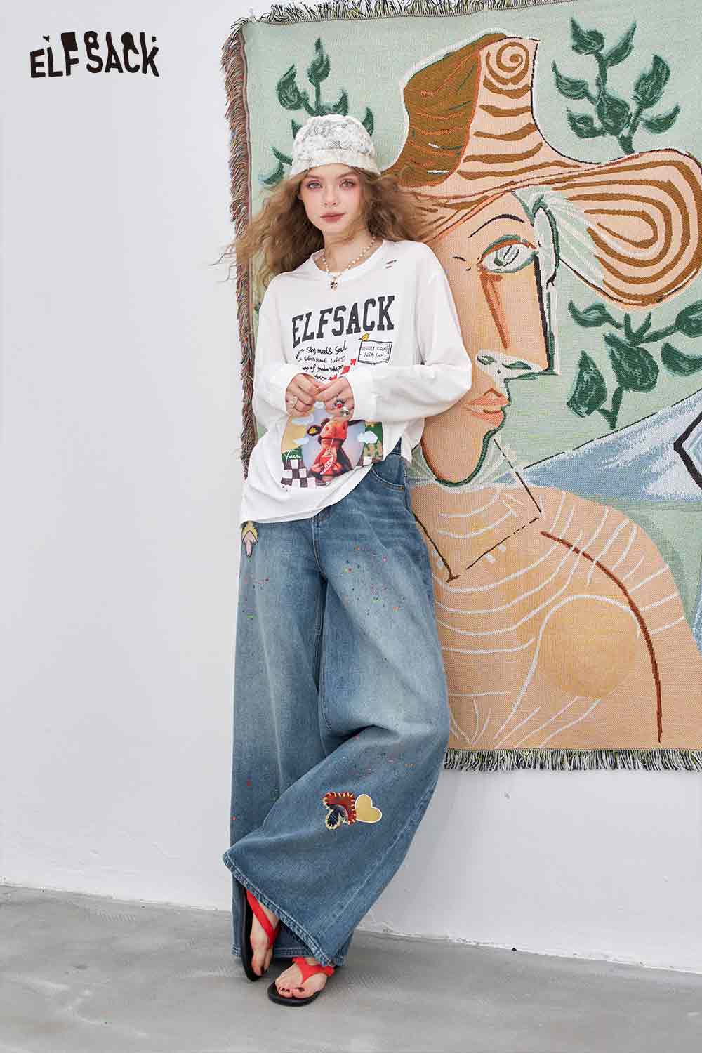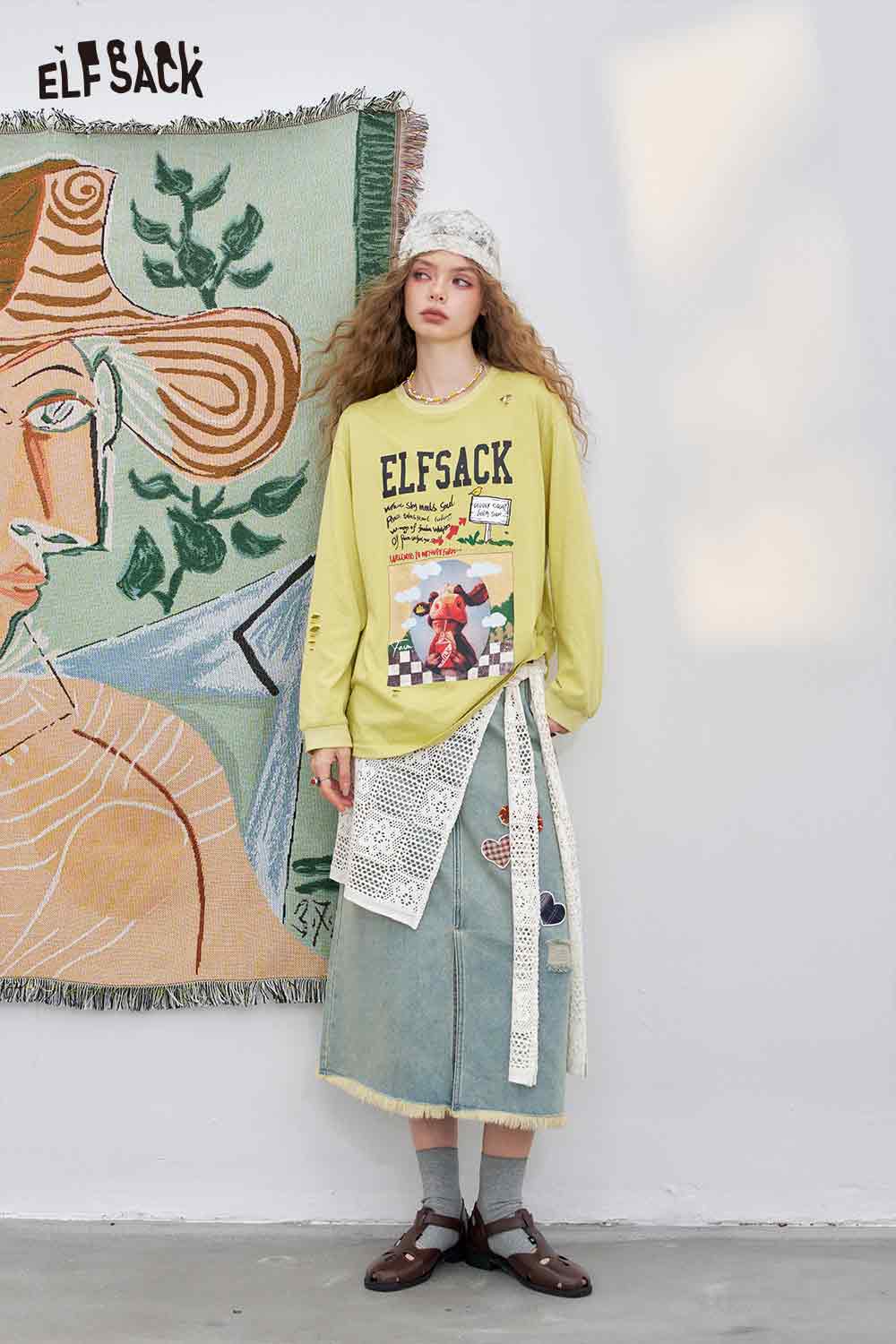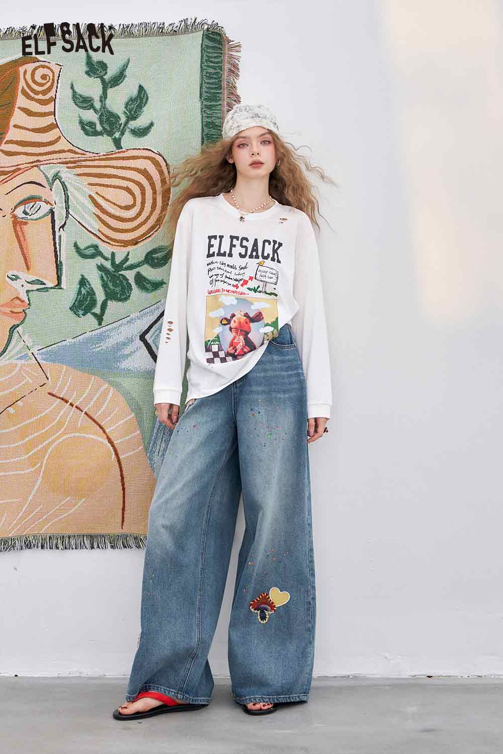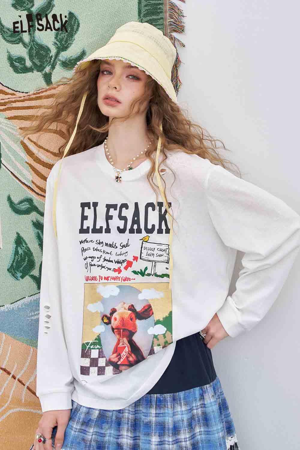 Cotton-Blend Loose Cow Printed Long-Sleeved T-Shirt