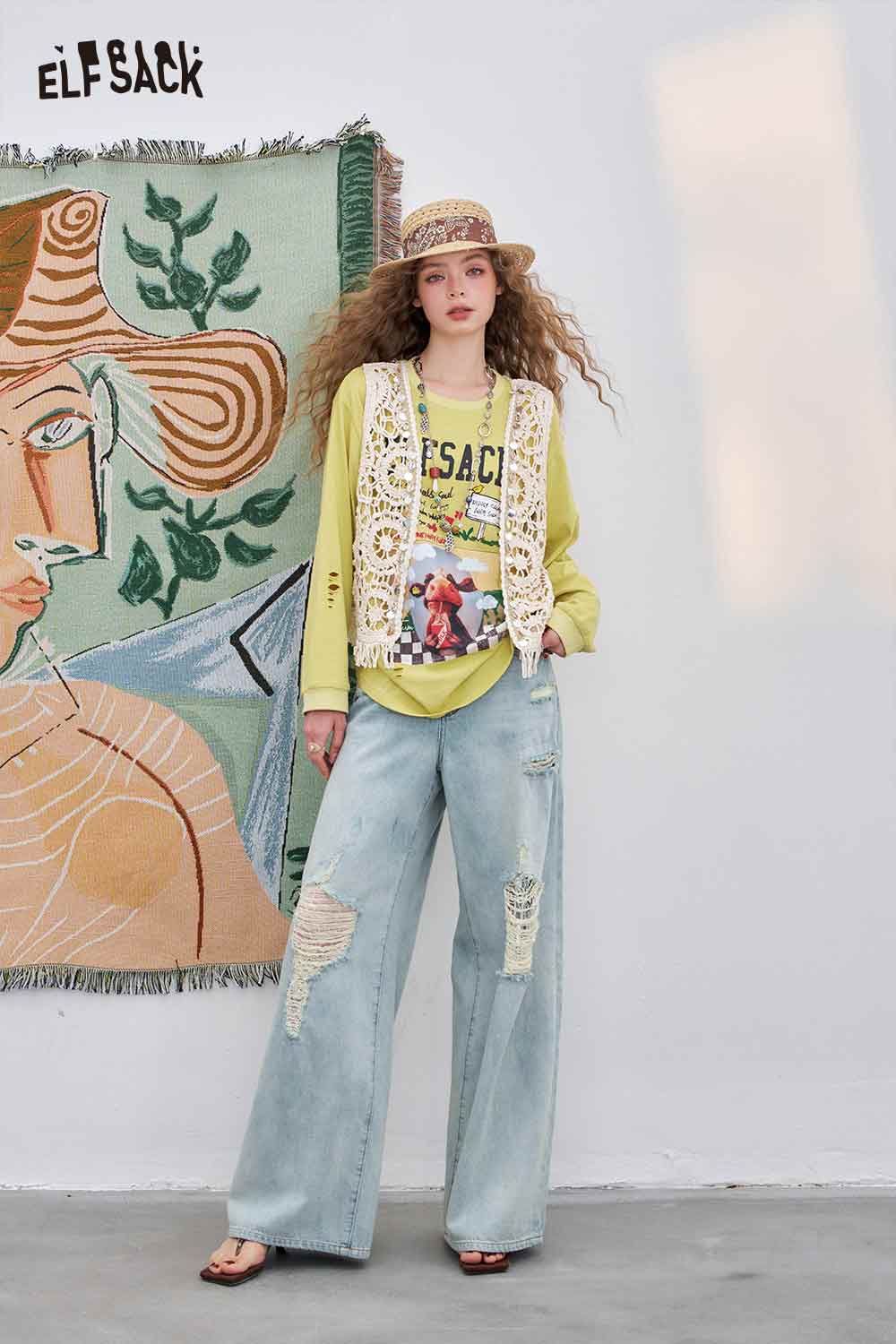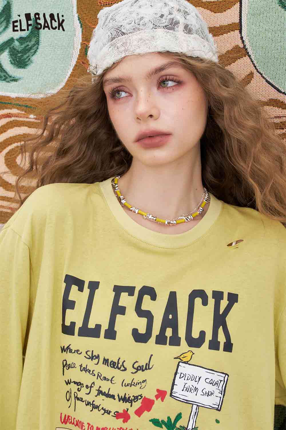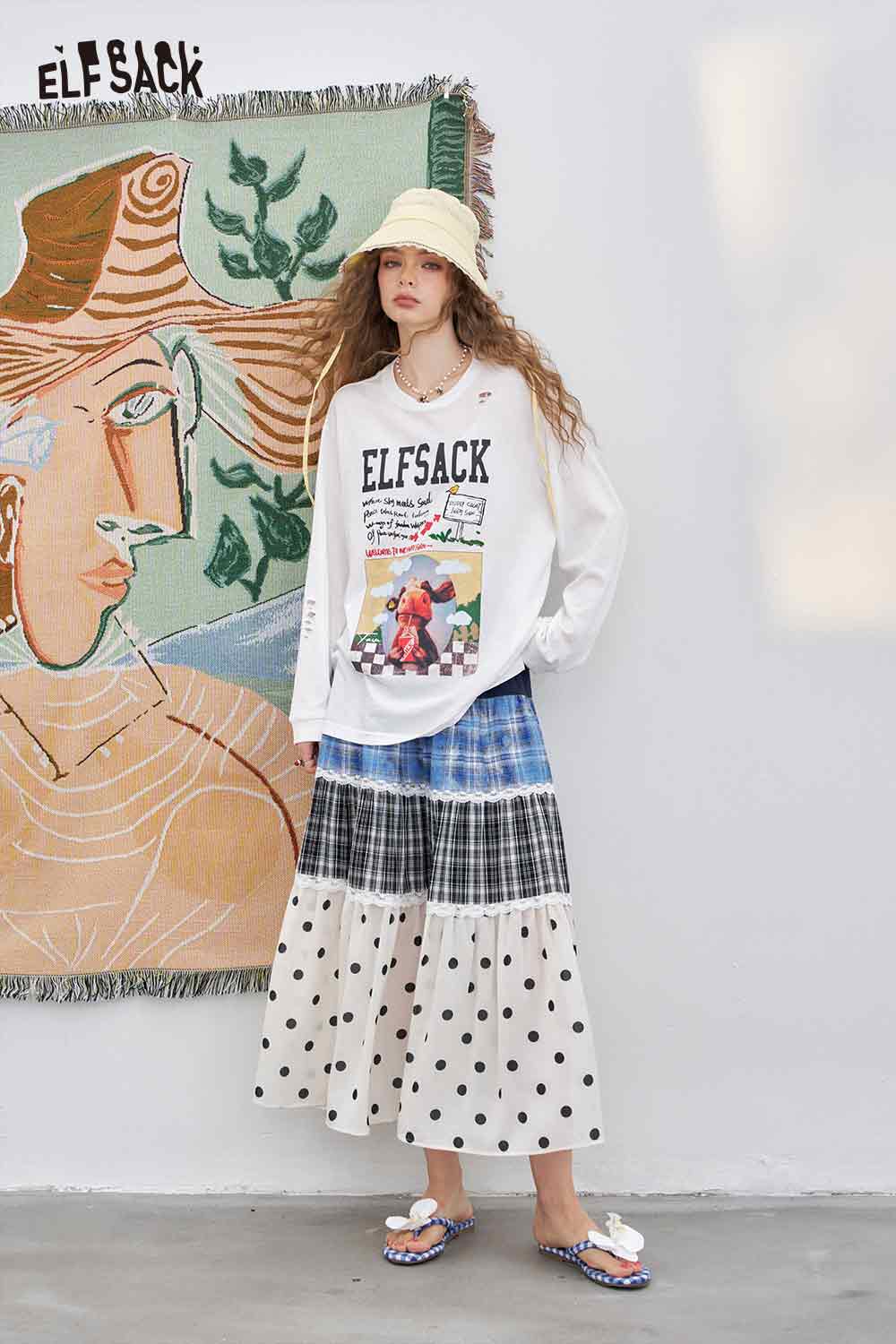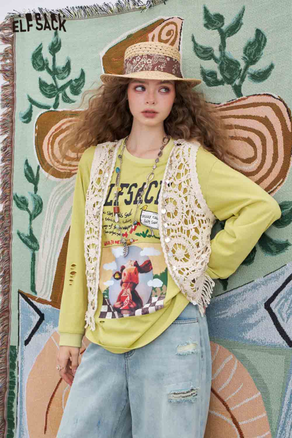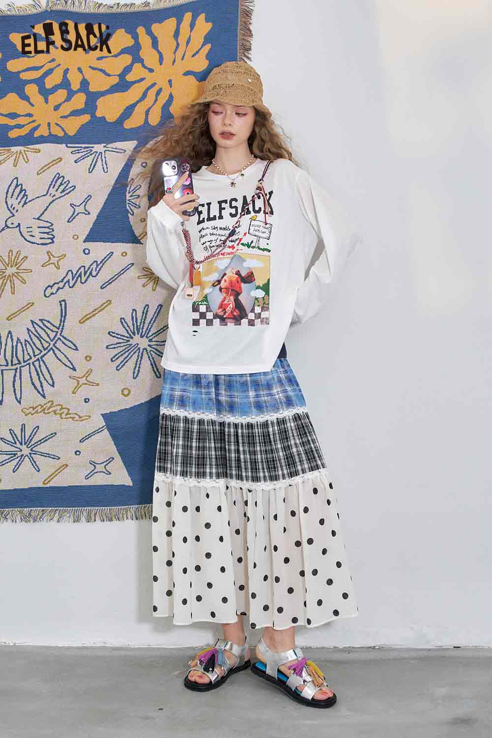 Cotton-Blend Loose Cow Printed Long-Sleeved T-Shirt