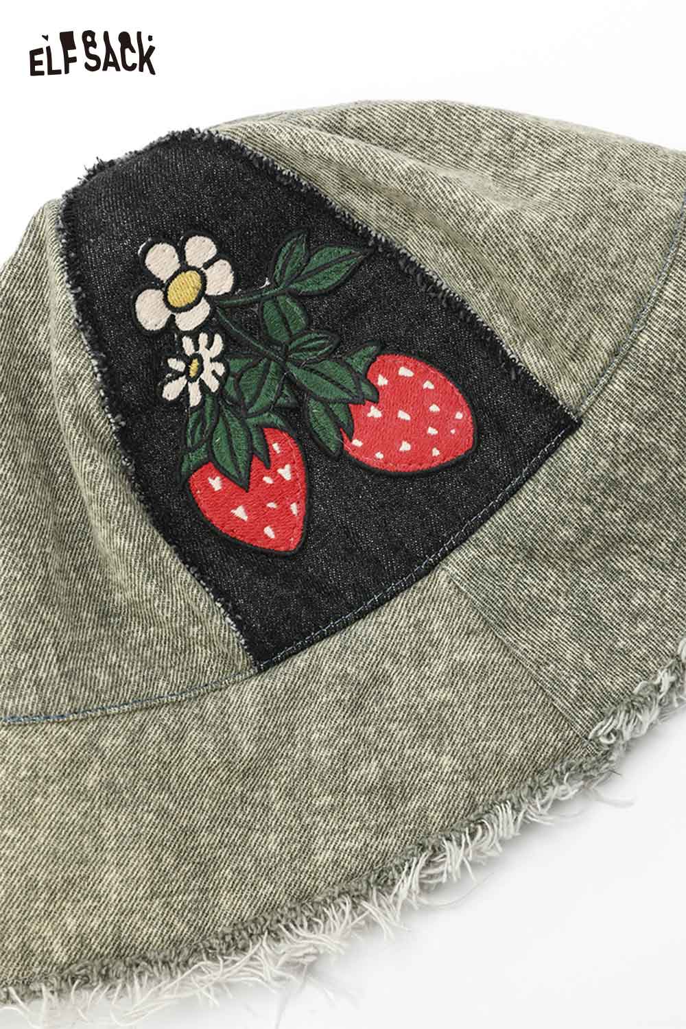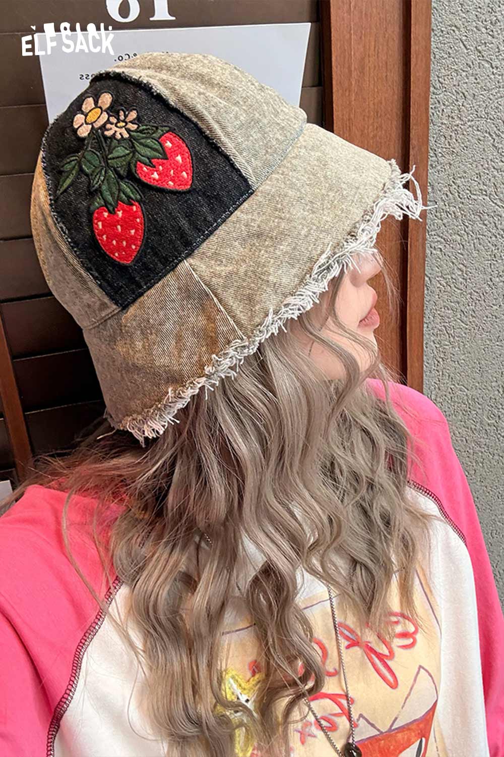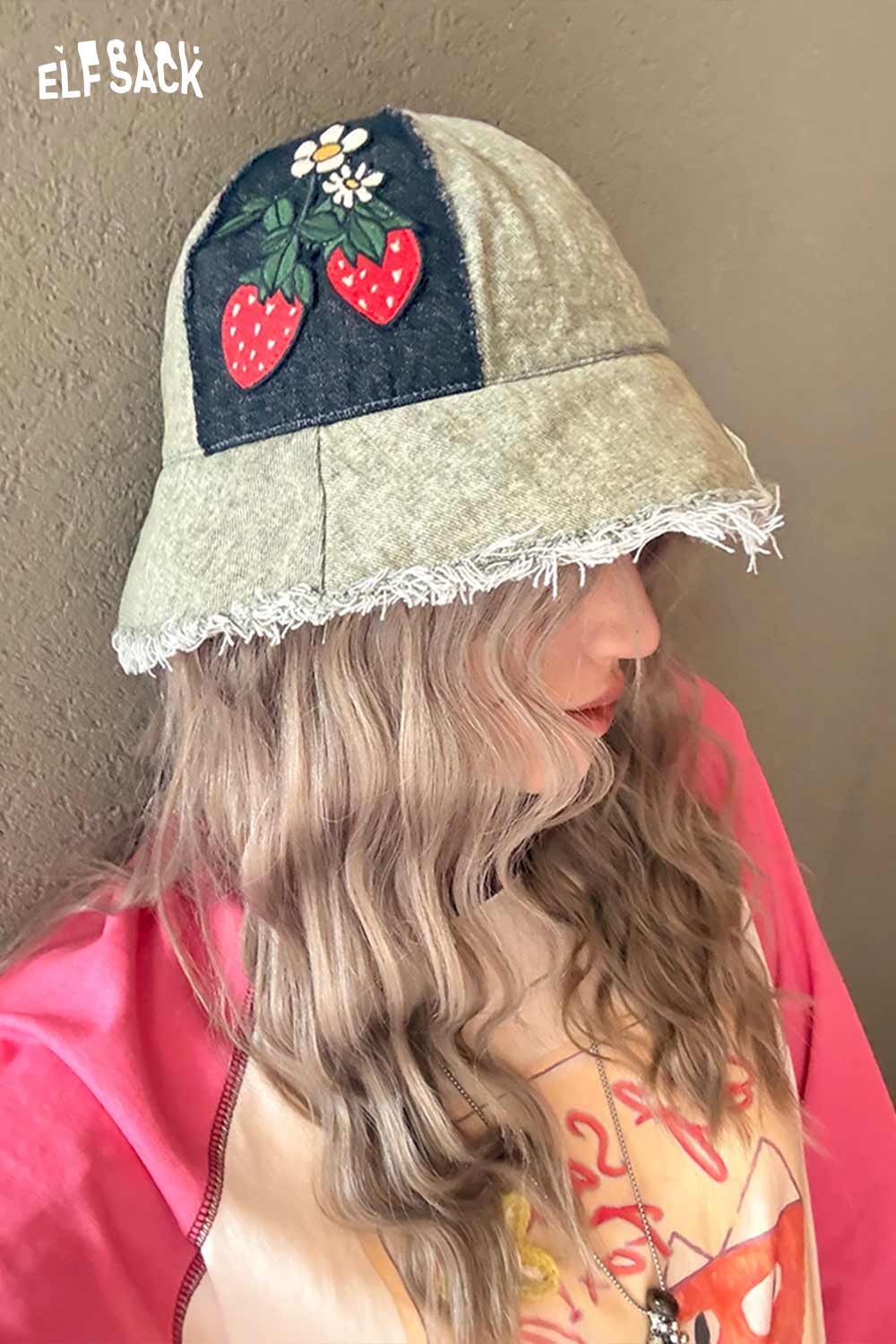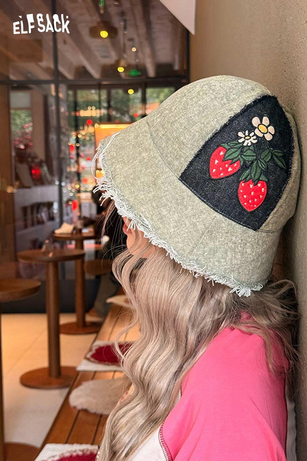 Strawberry Embroidery Frayed Denim Bucket Hat With Daisies