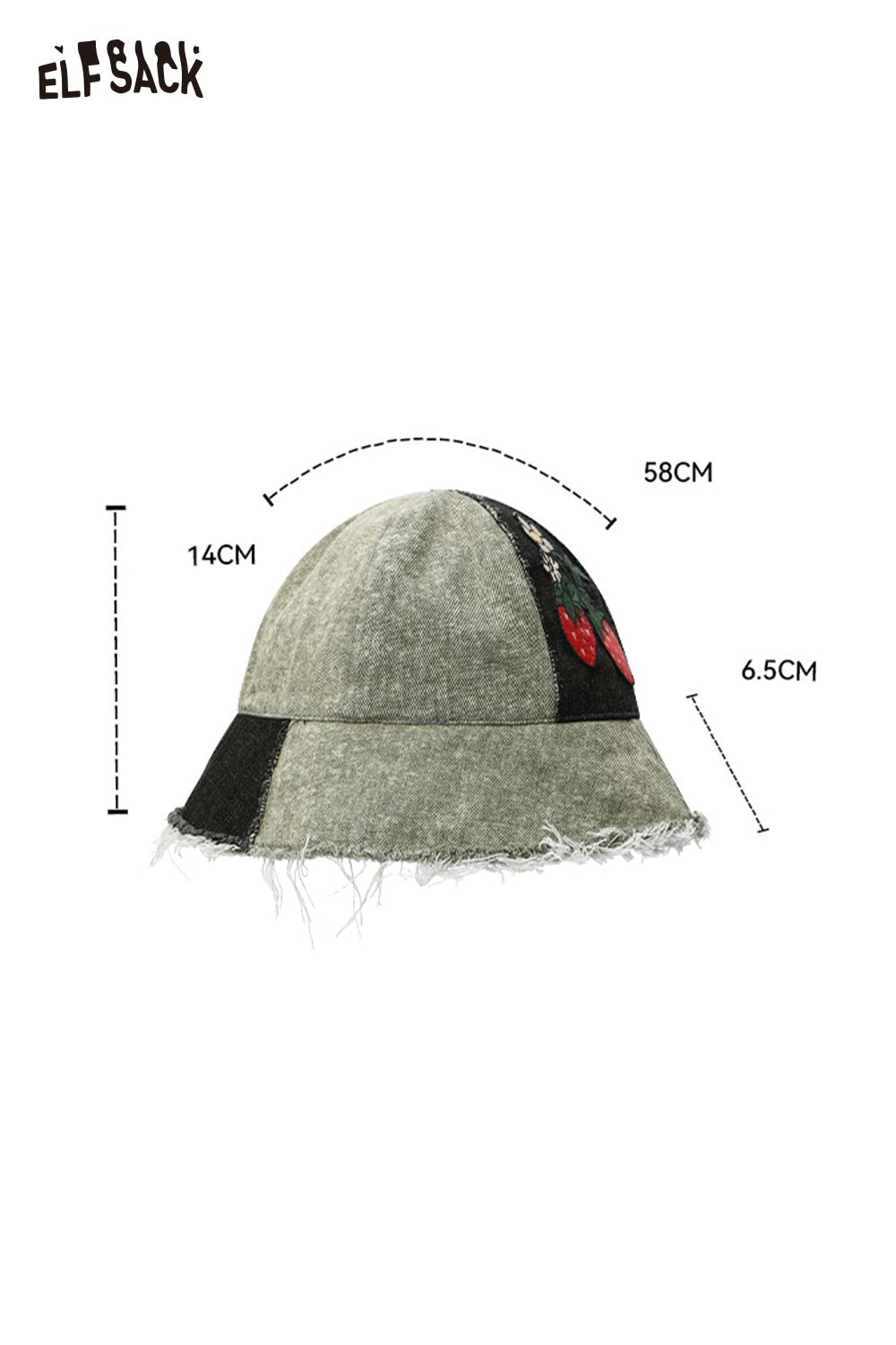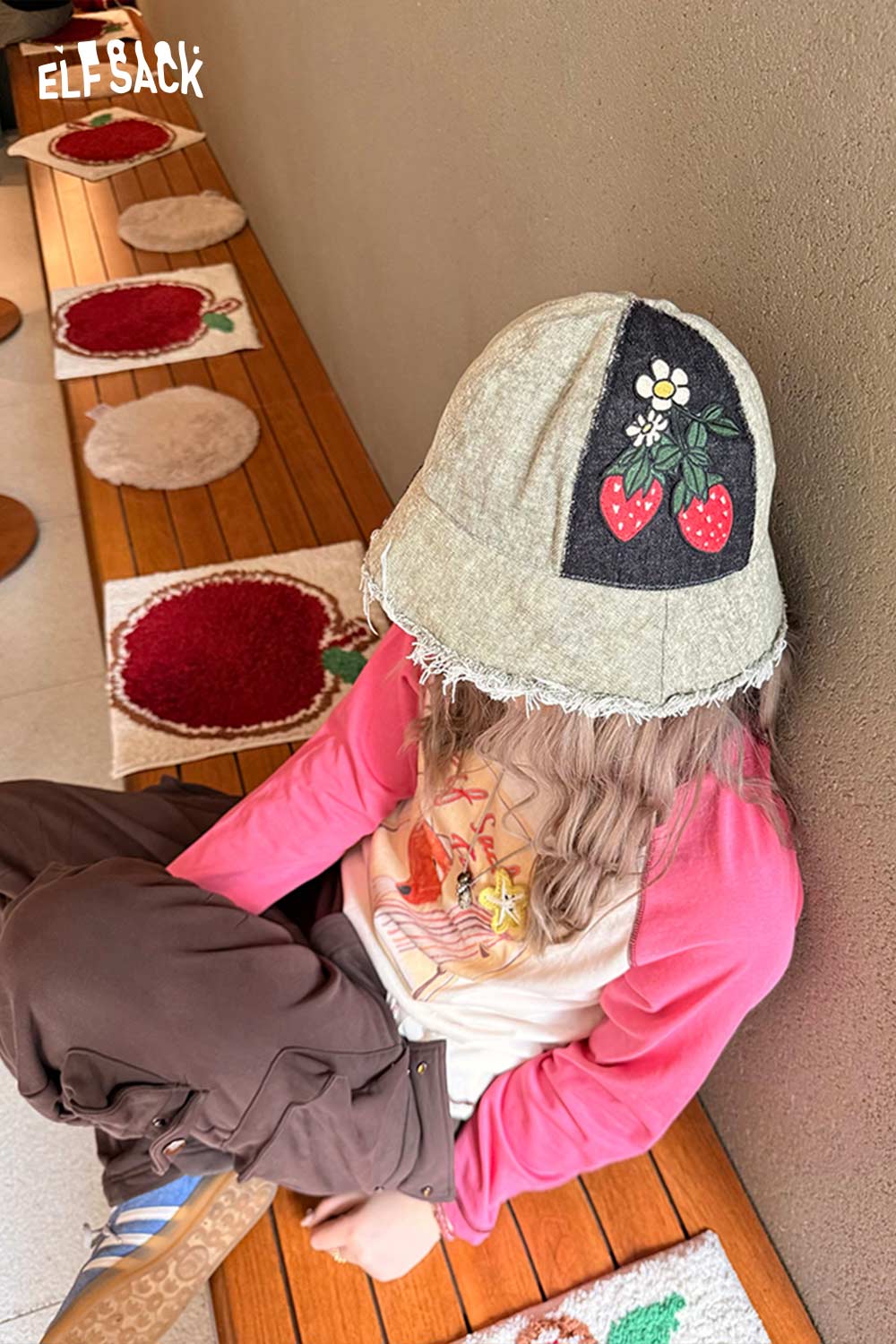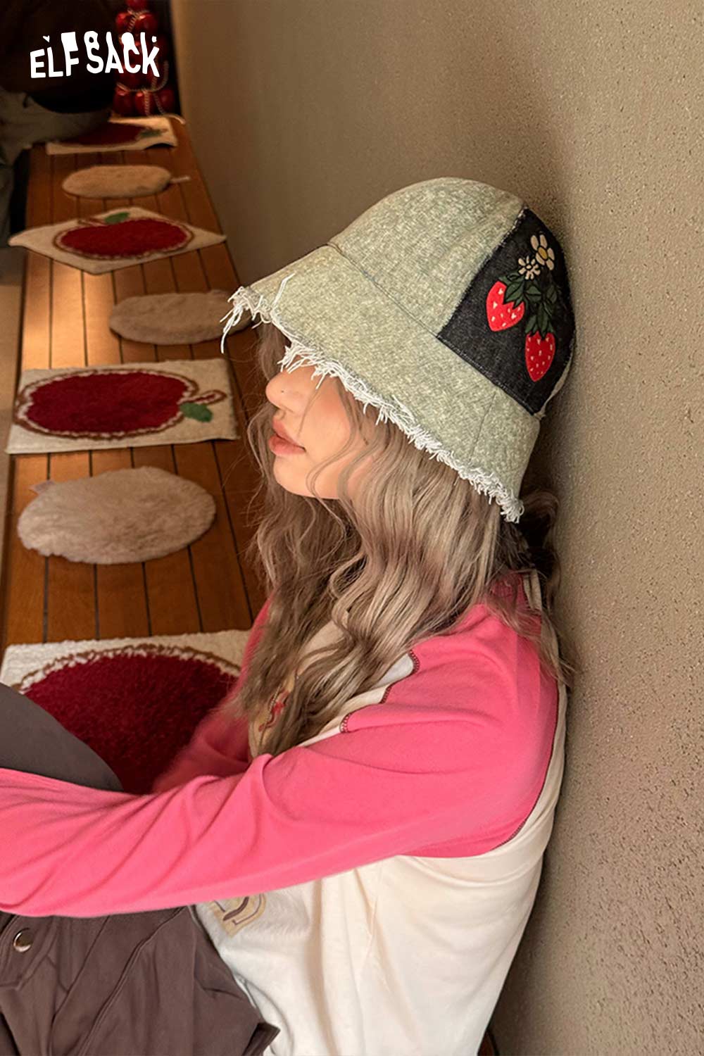 Strawberry Embroidery Frayed Denim Bucket Hat With Daisies