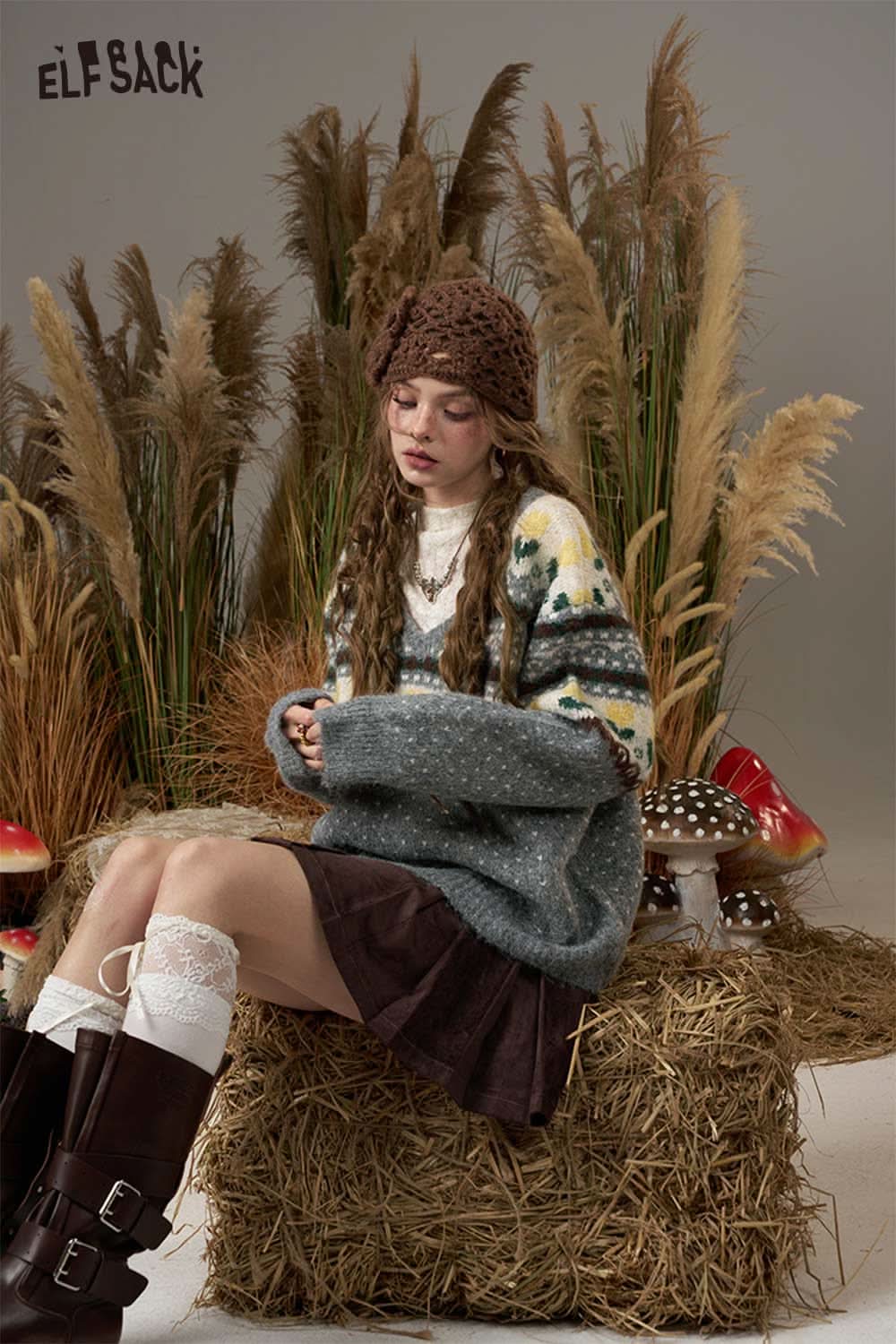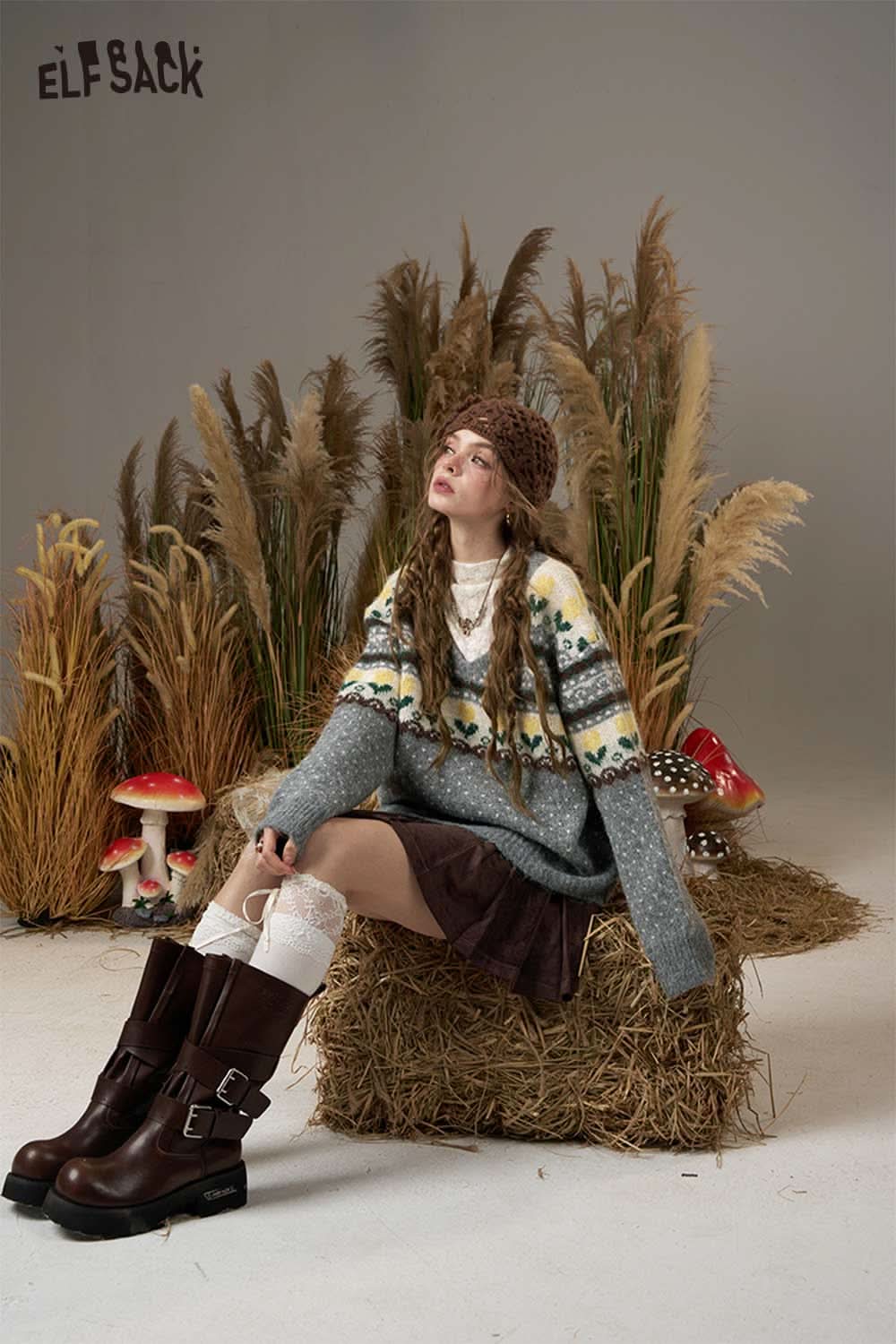 ELFSACK polka dot floral knit sweater in brown with festive patterns, perfect for cozy autumn looks