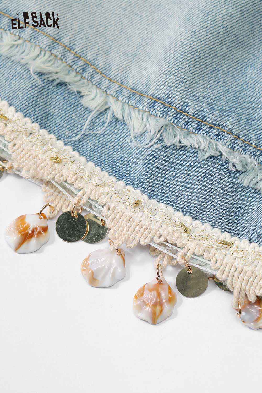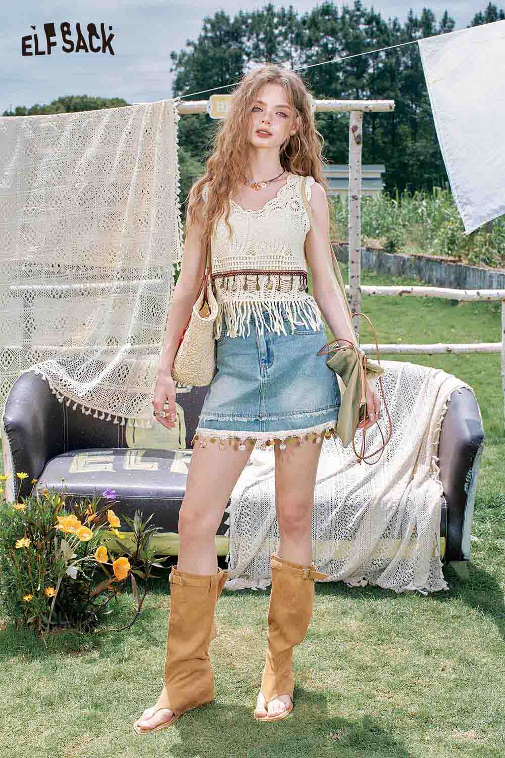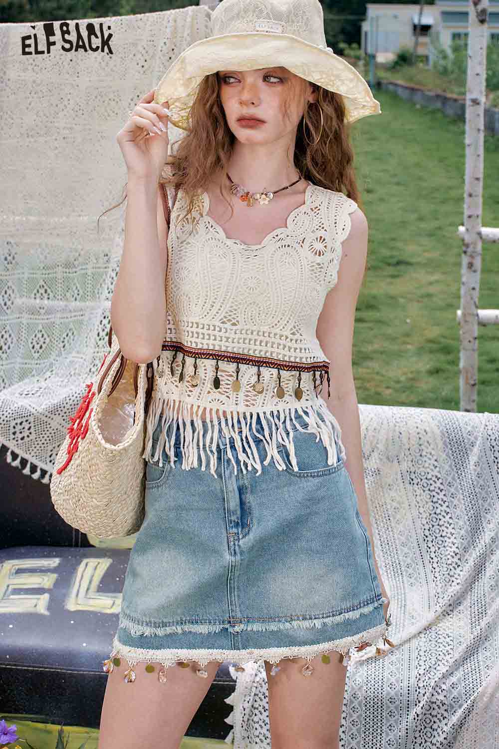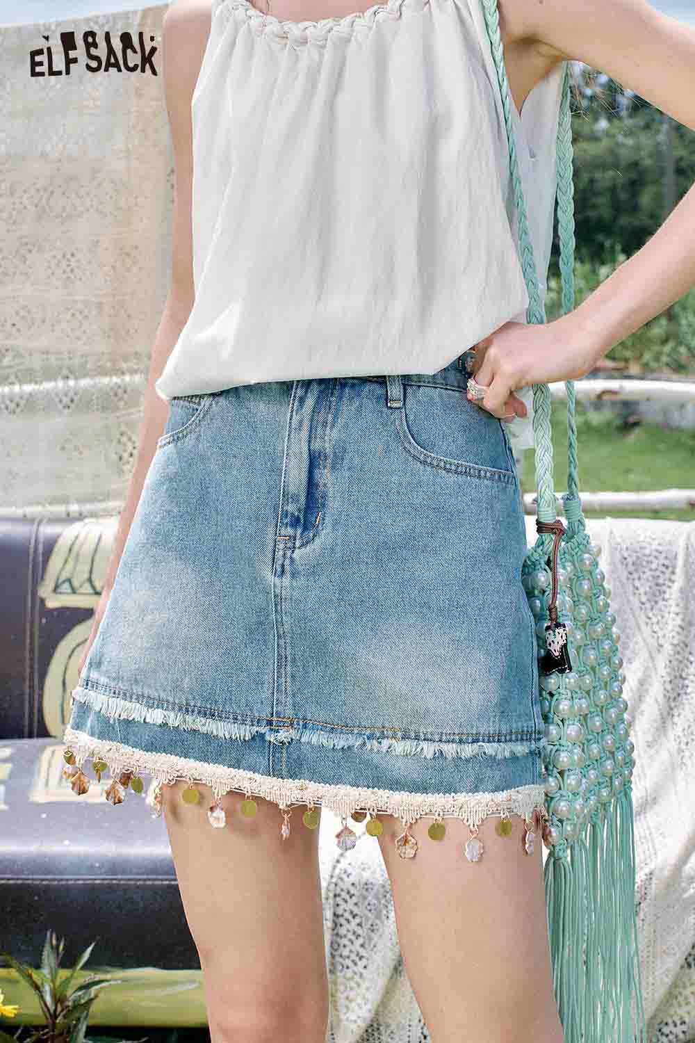 Shell Fringe Denim Mini Skirt High Waist A Line Resort