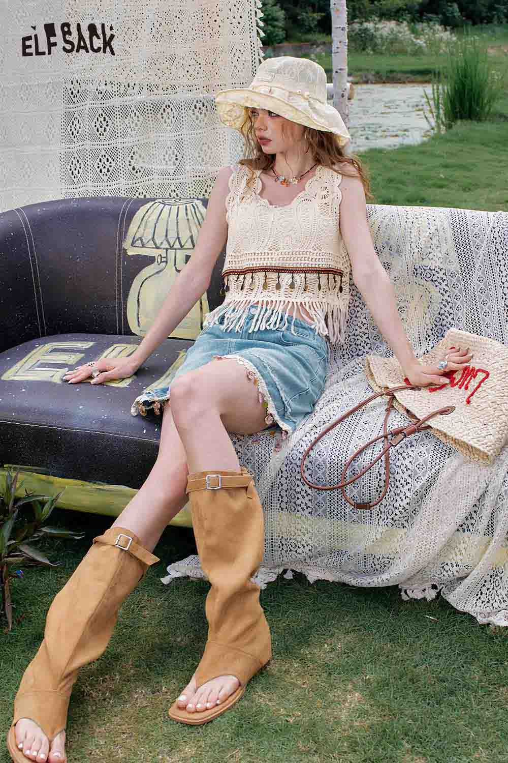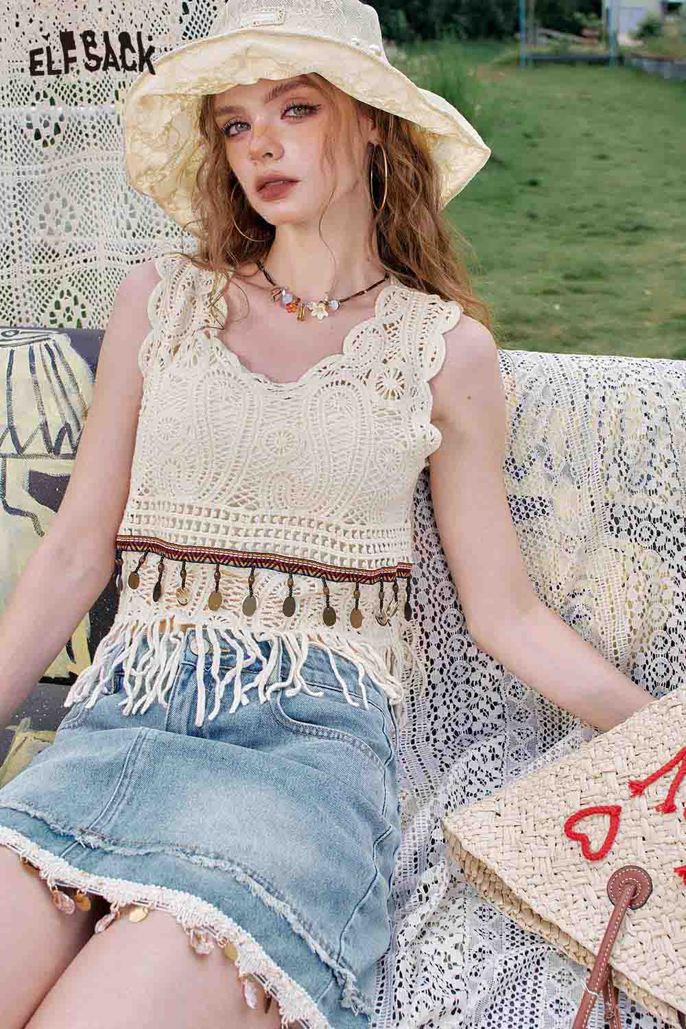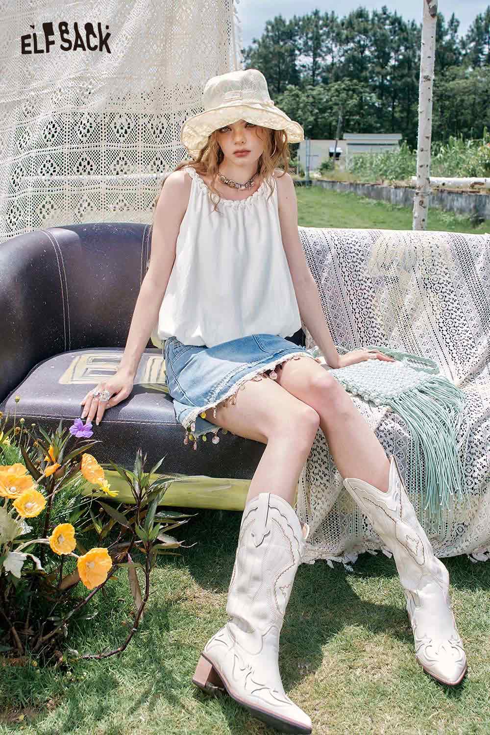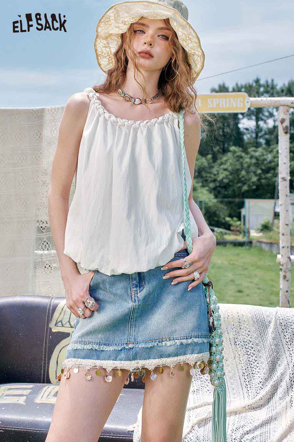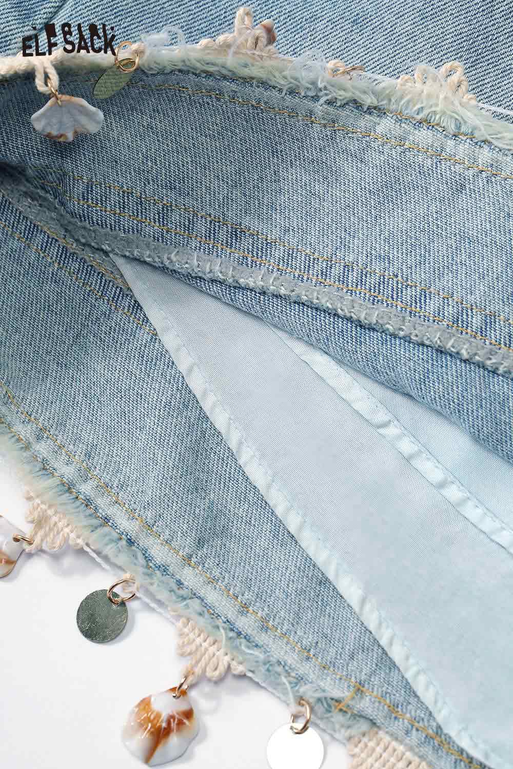Shell Fringe Denim Mini Skirt High Waist A Line Resort