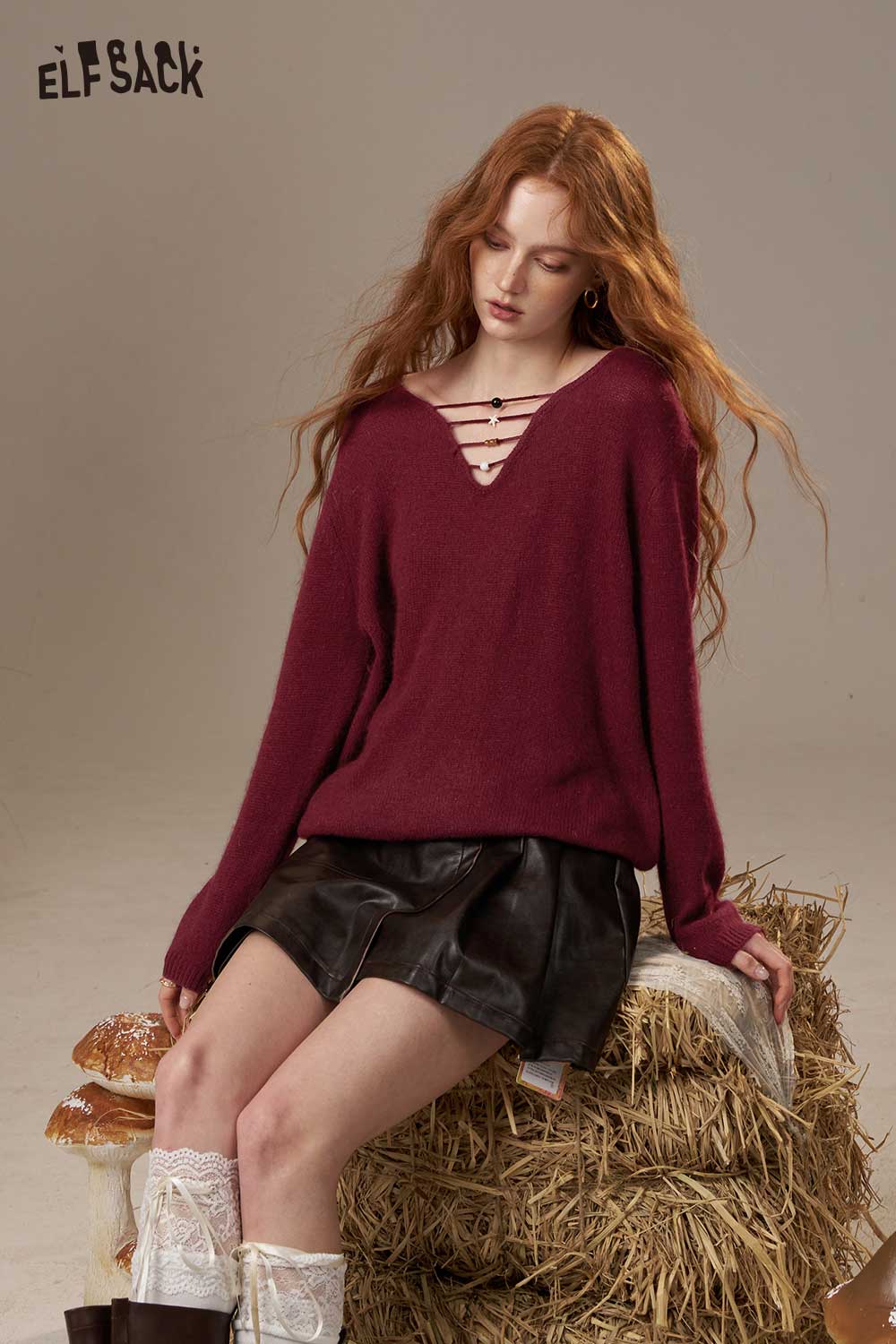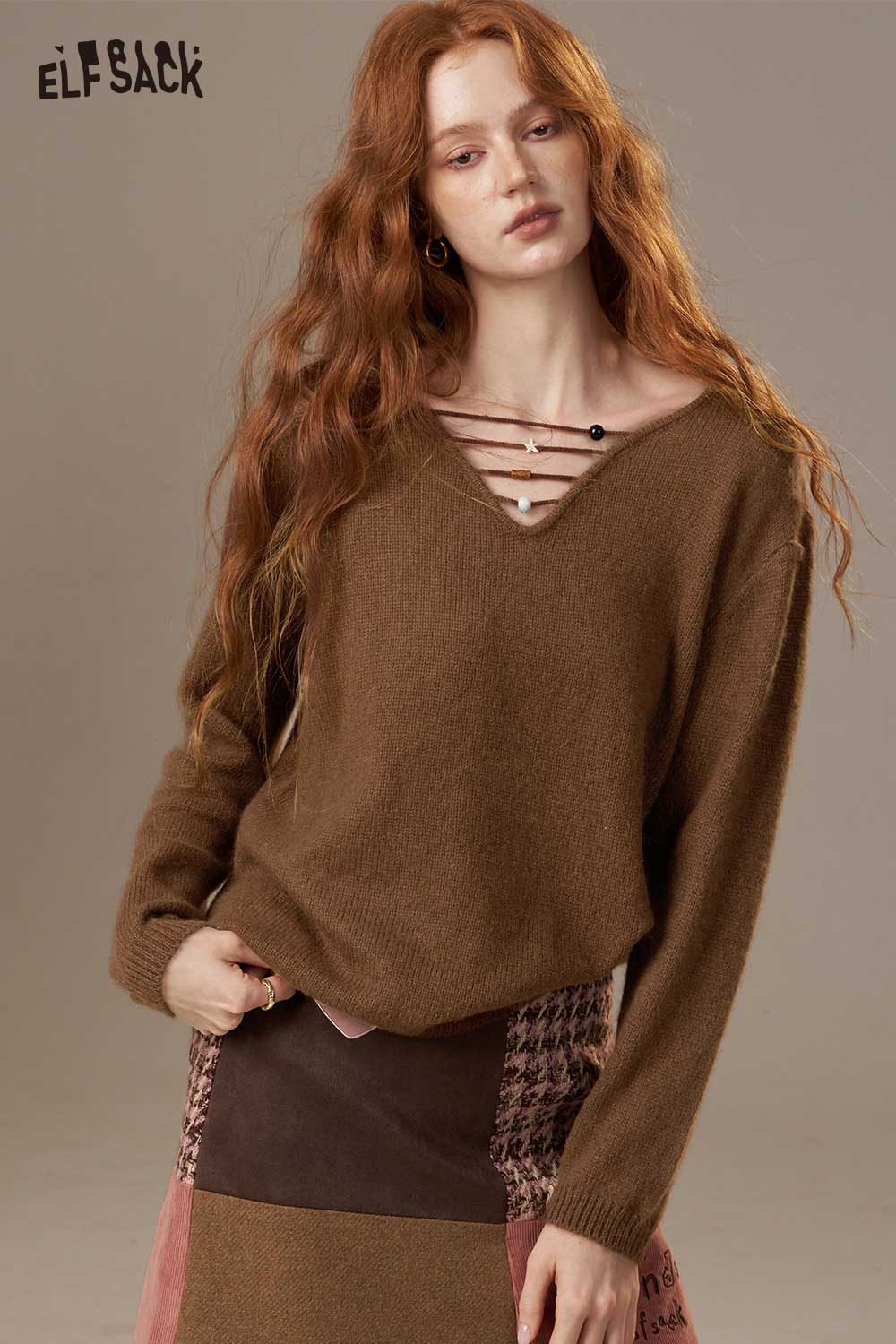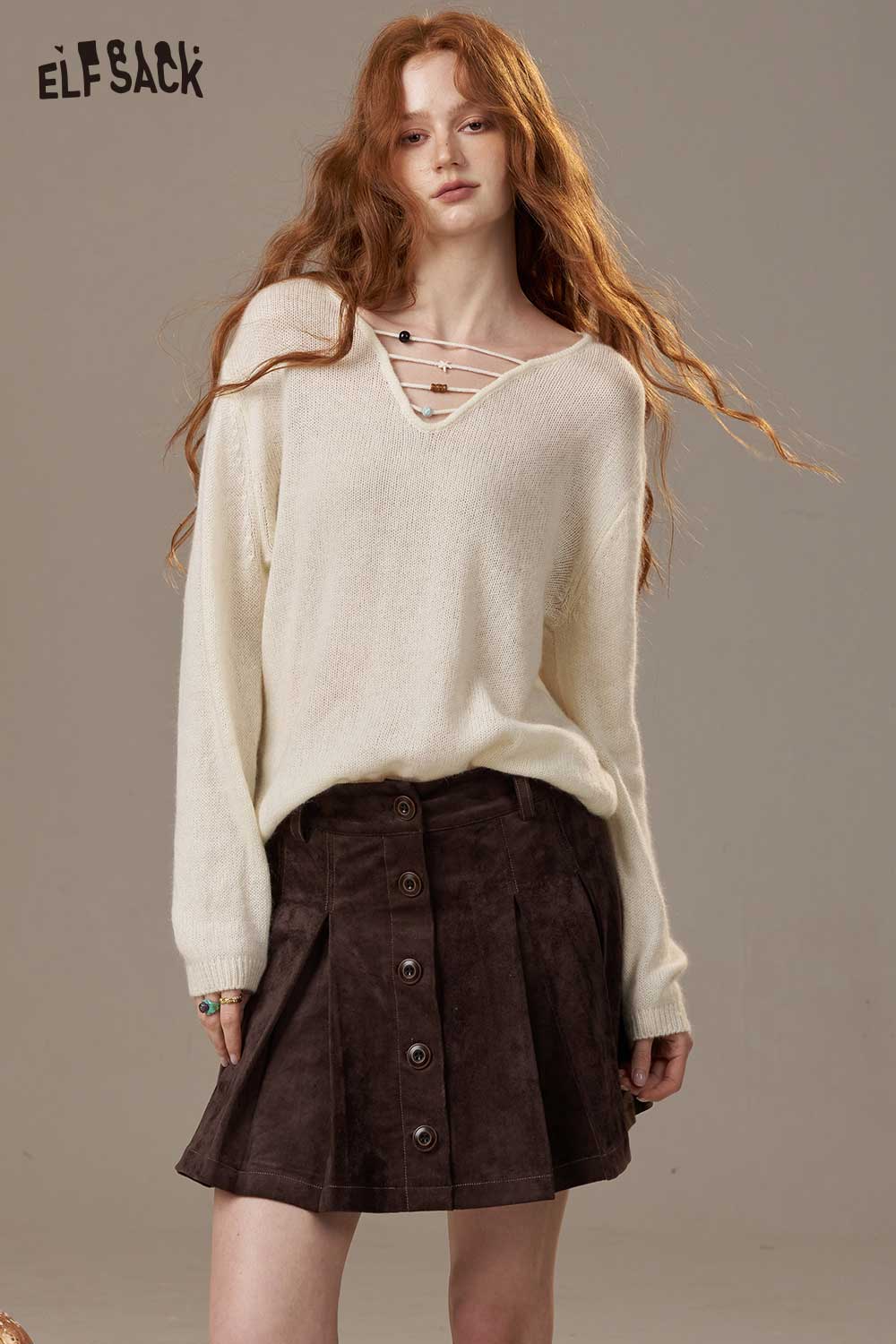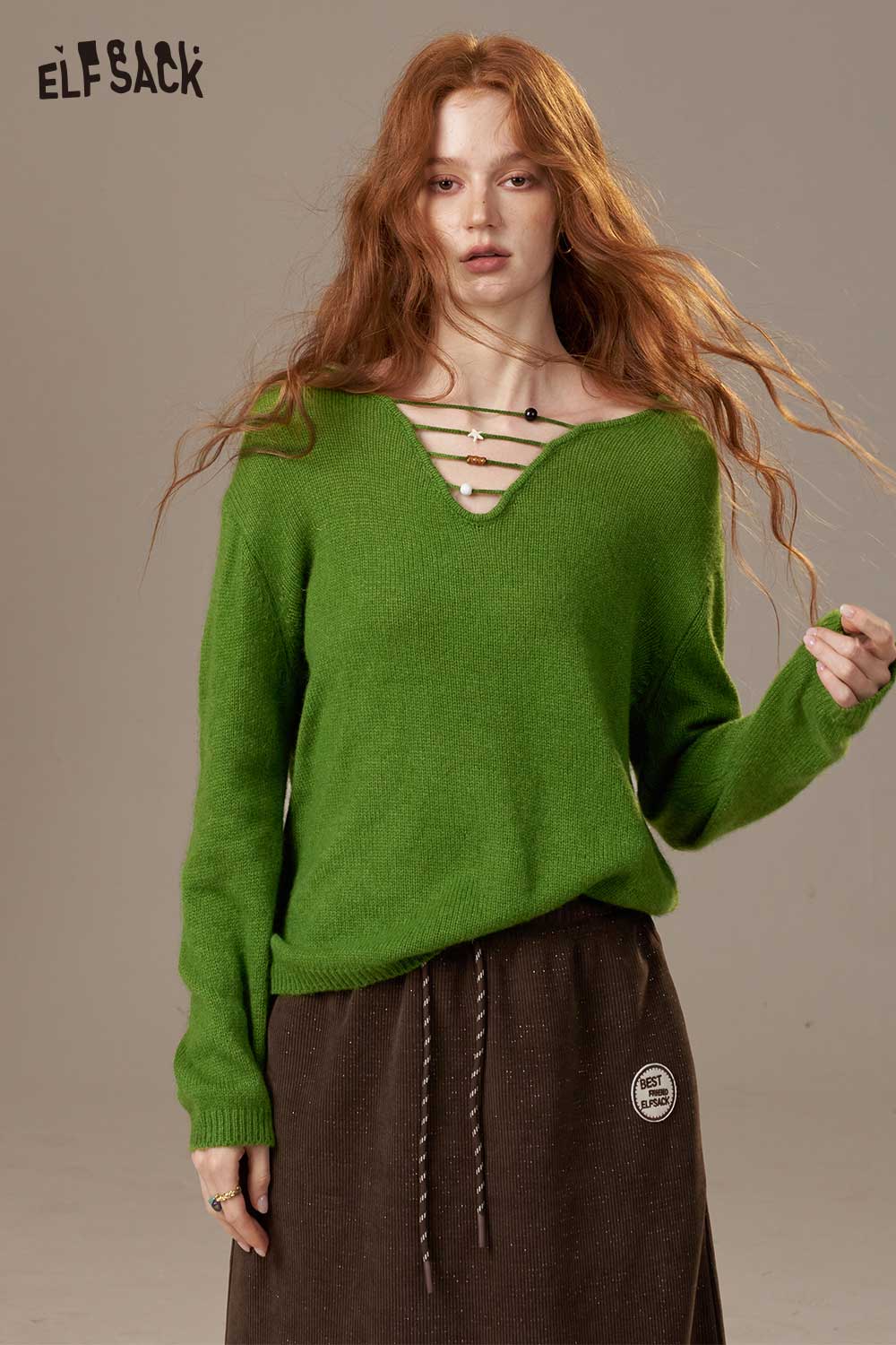 Soft Knit Lace-up Beaded V-Neck Loose Fit Sweater