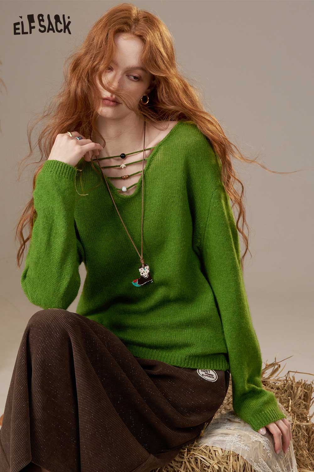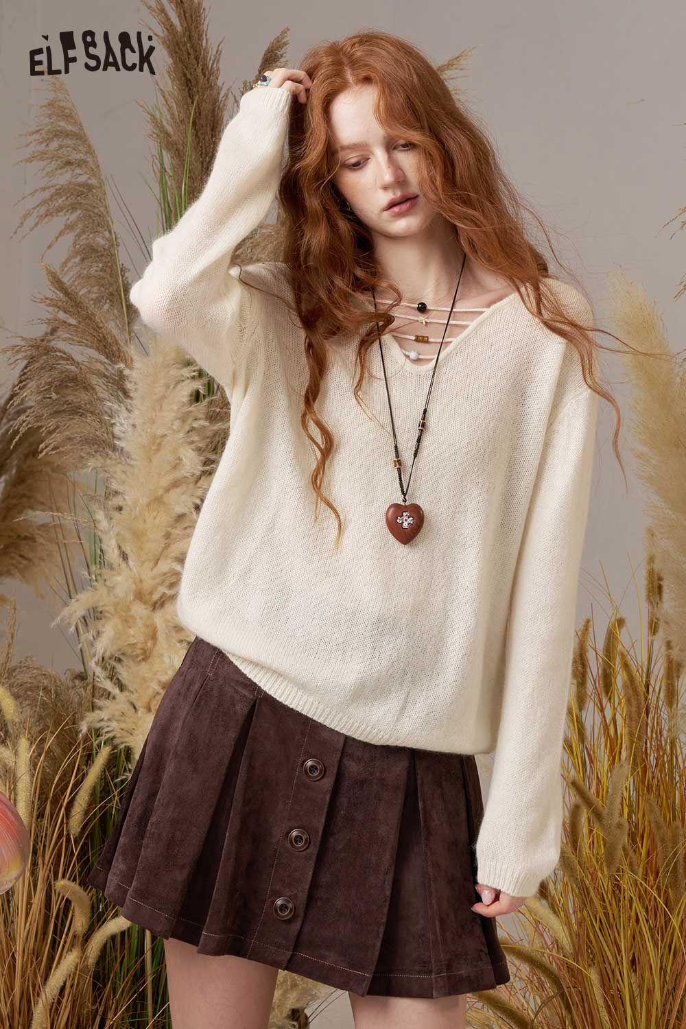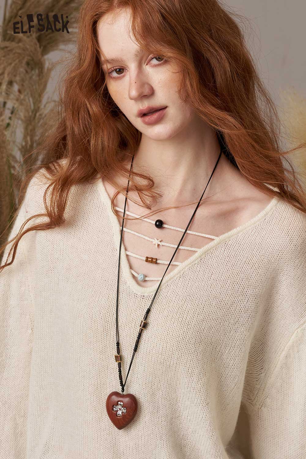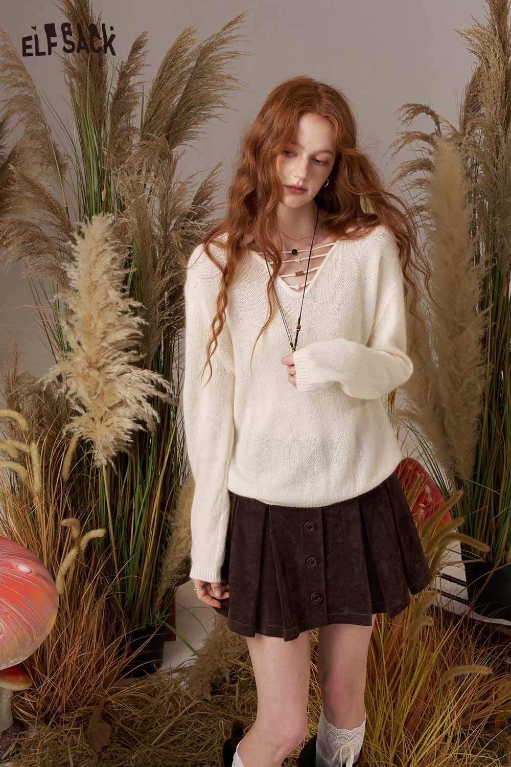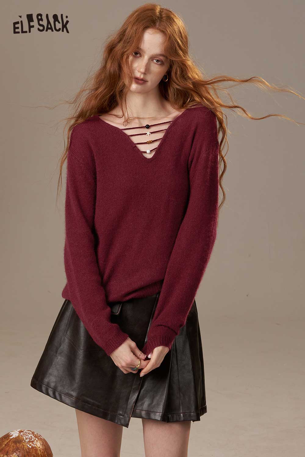 Soft Knit Lace-up Beaded V-Neck Loose Fit Sweater