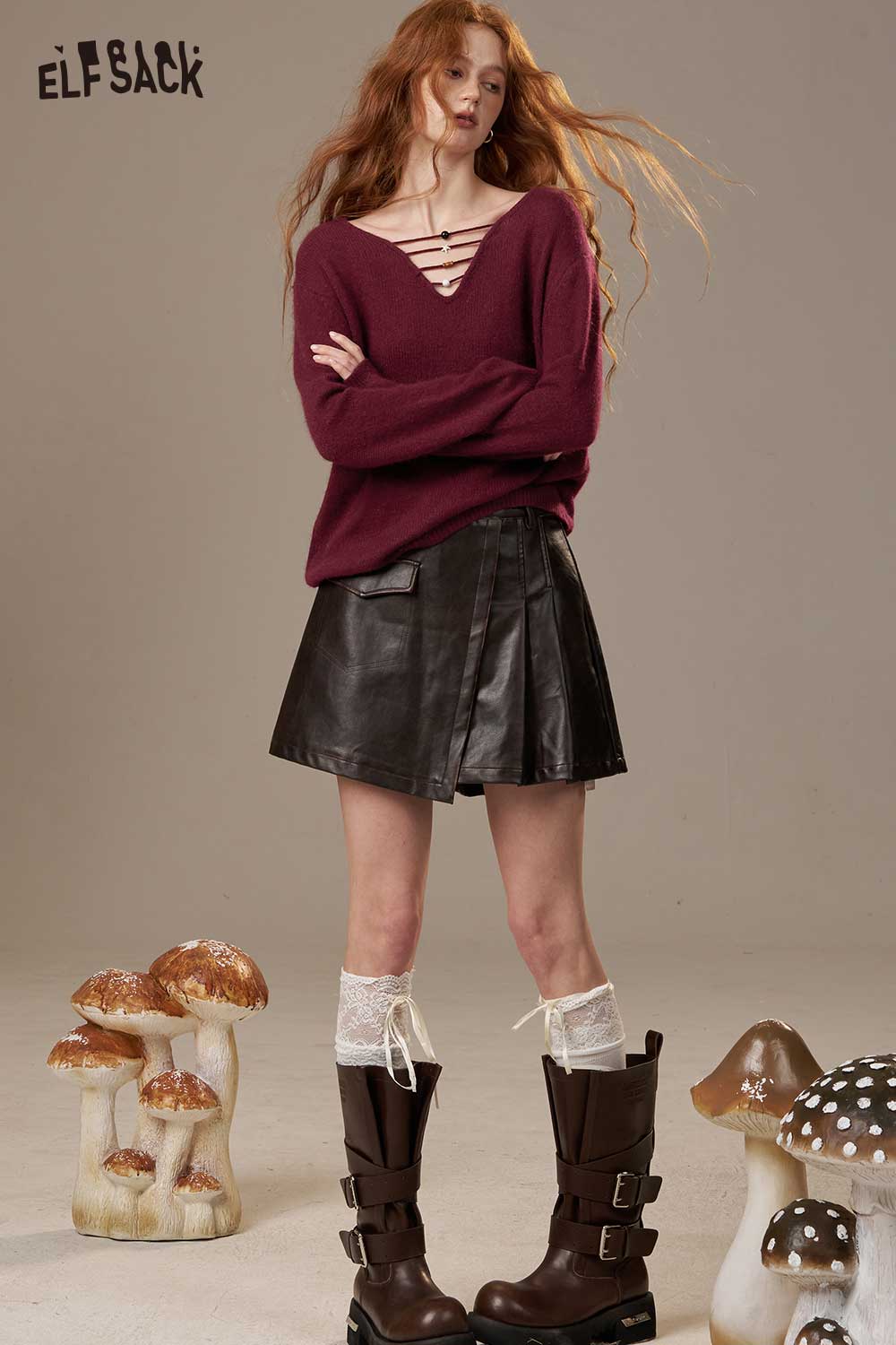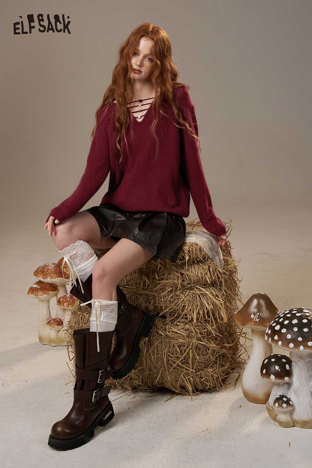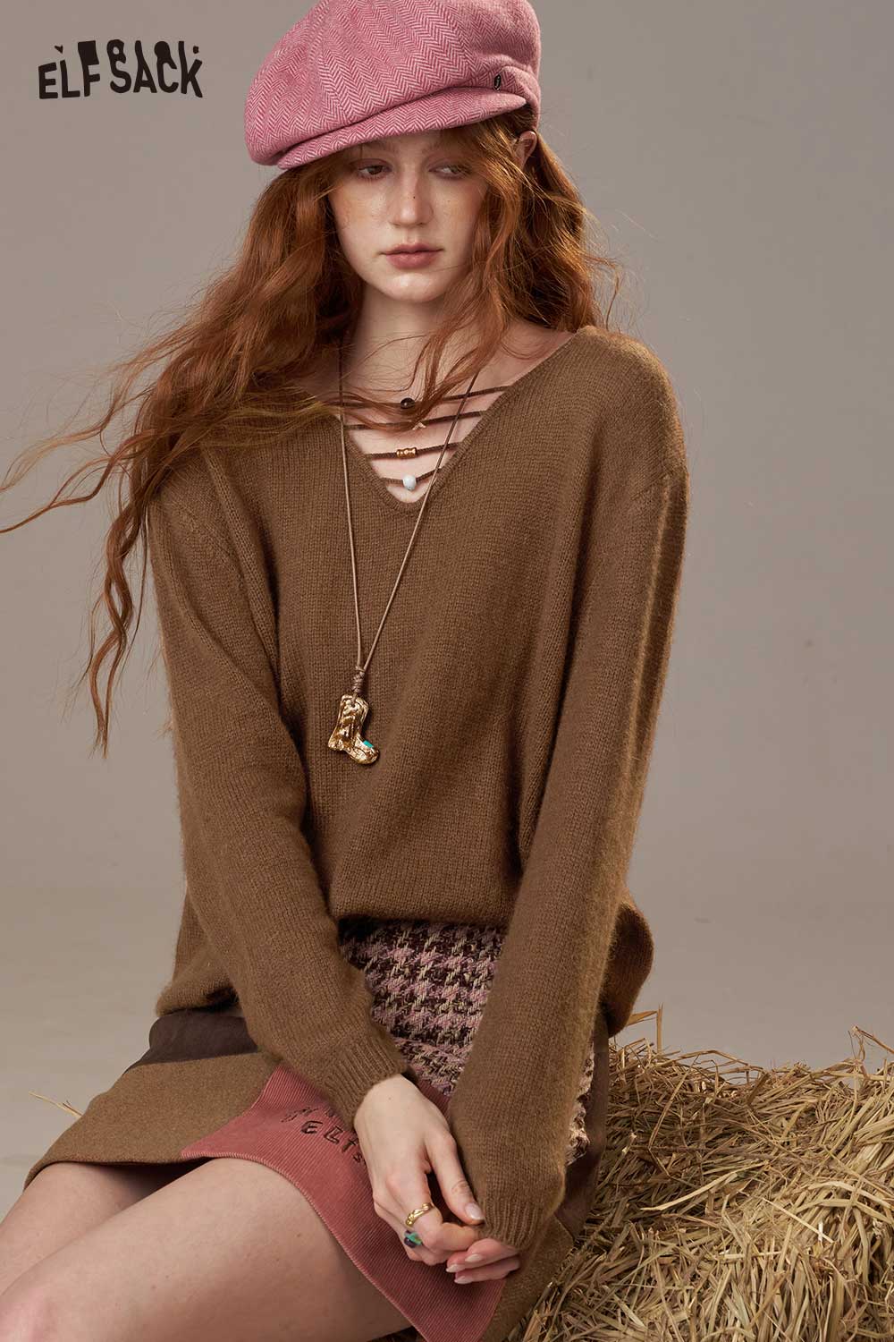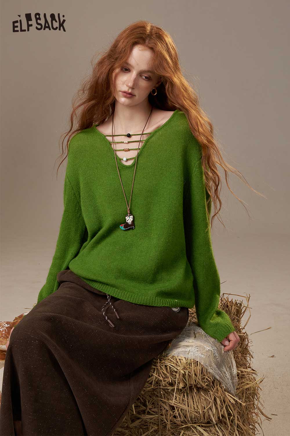 Soft Knit Lace-up Beaded V-Neck Loose Fit Sweater