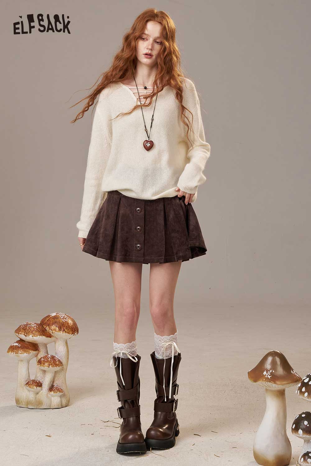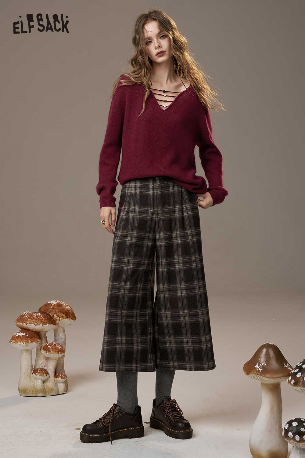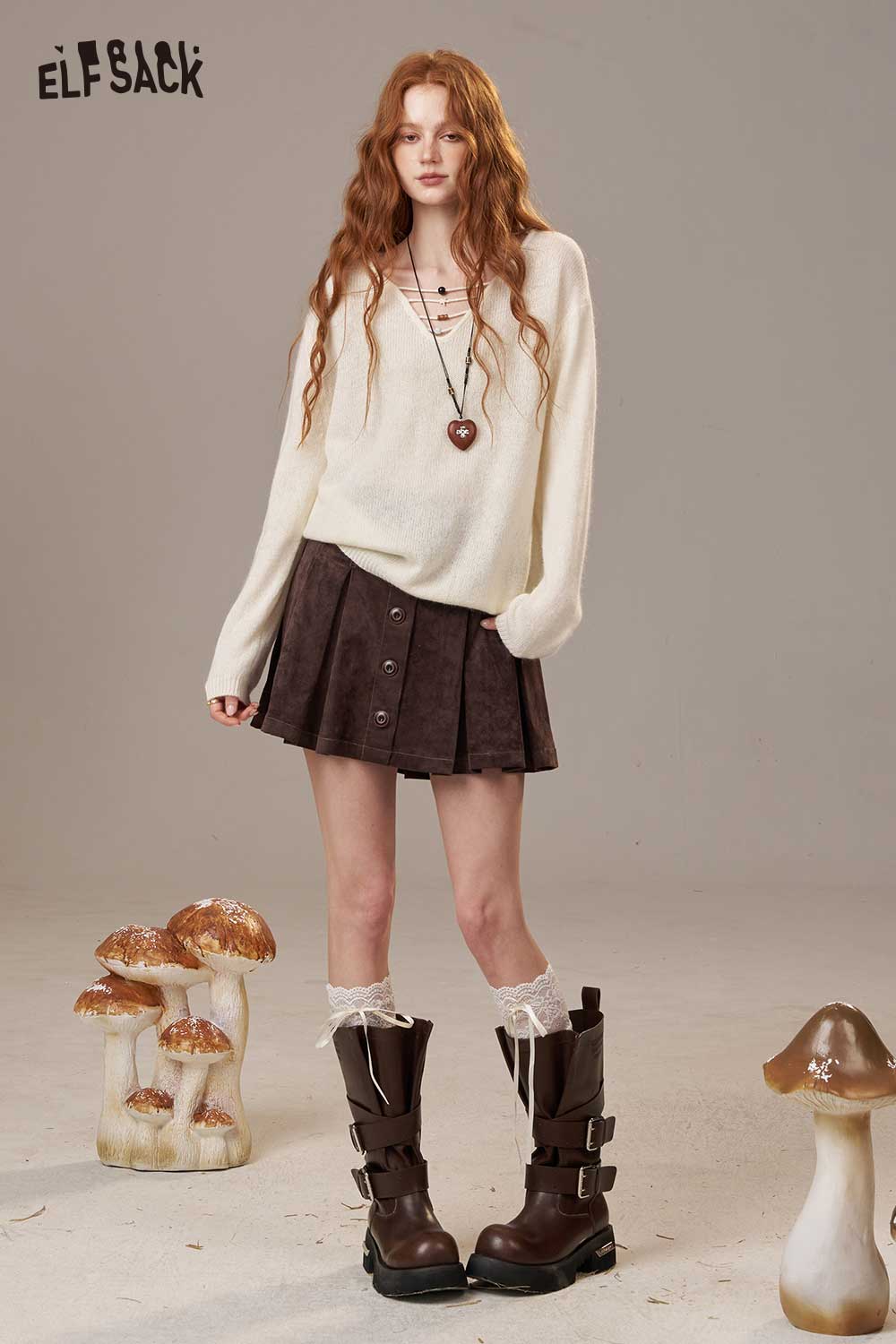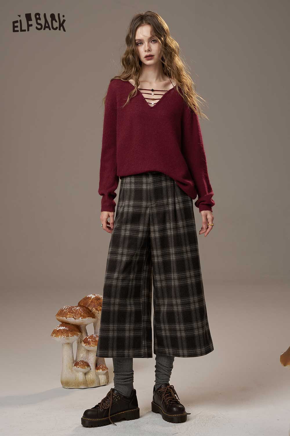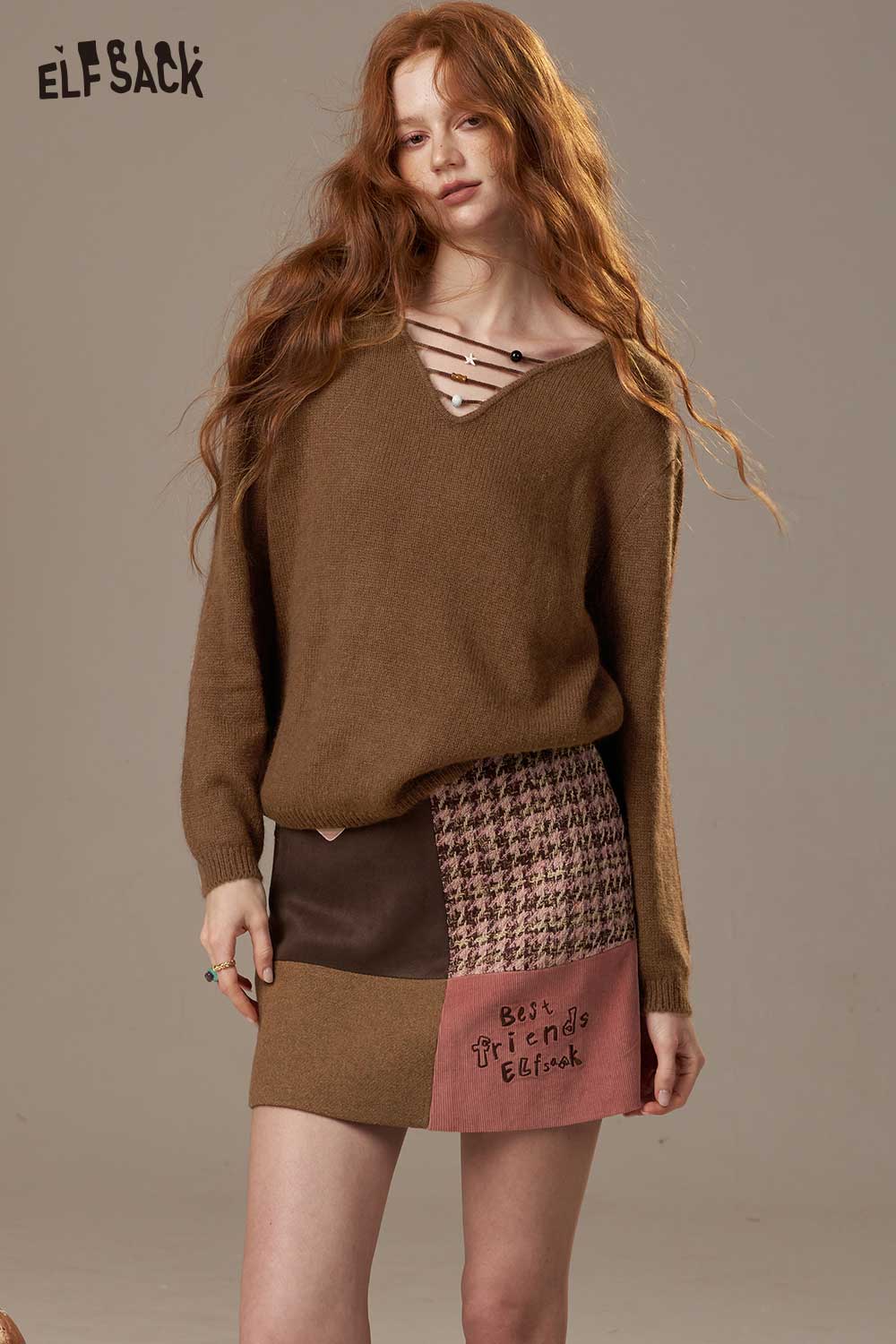 Soft Knit Lace-up Beaded V-Neck Loose Fit Sweater