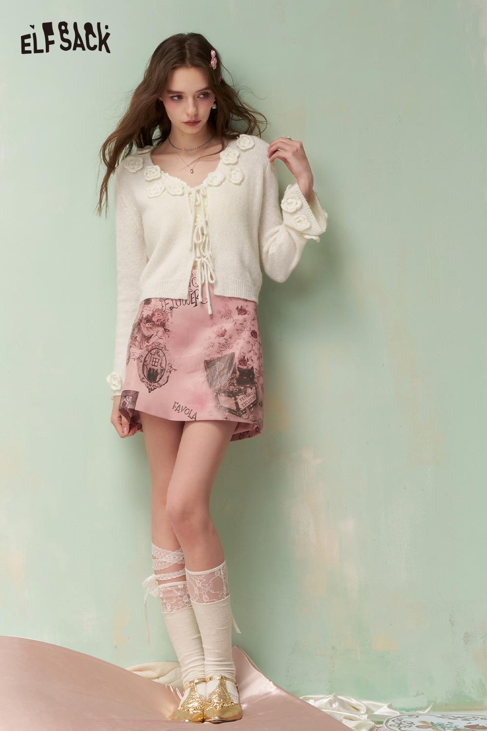 プレッピーな3Dリボン装飾のバラボタンカーディガン