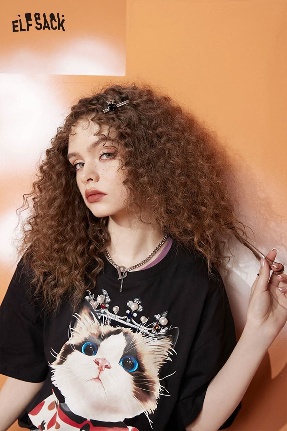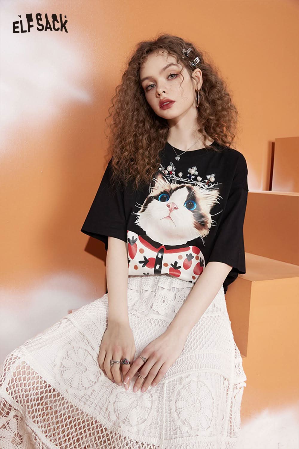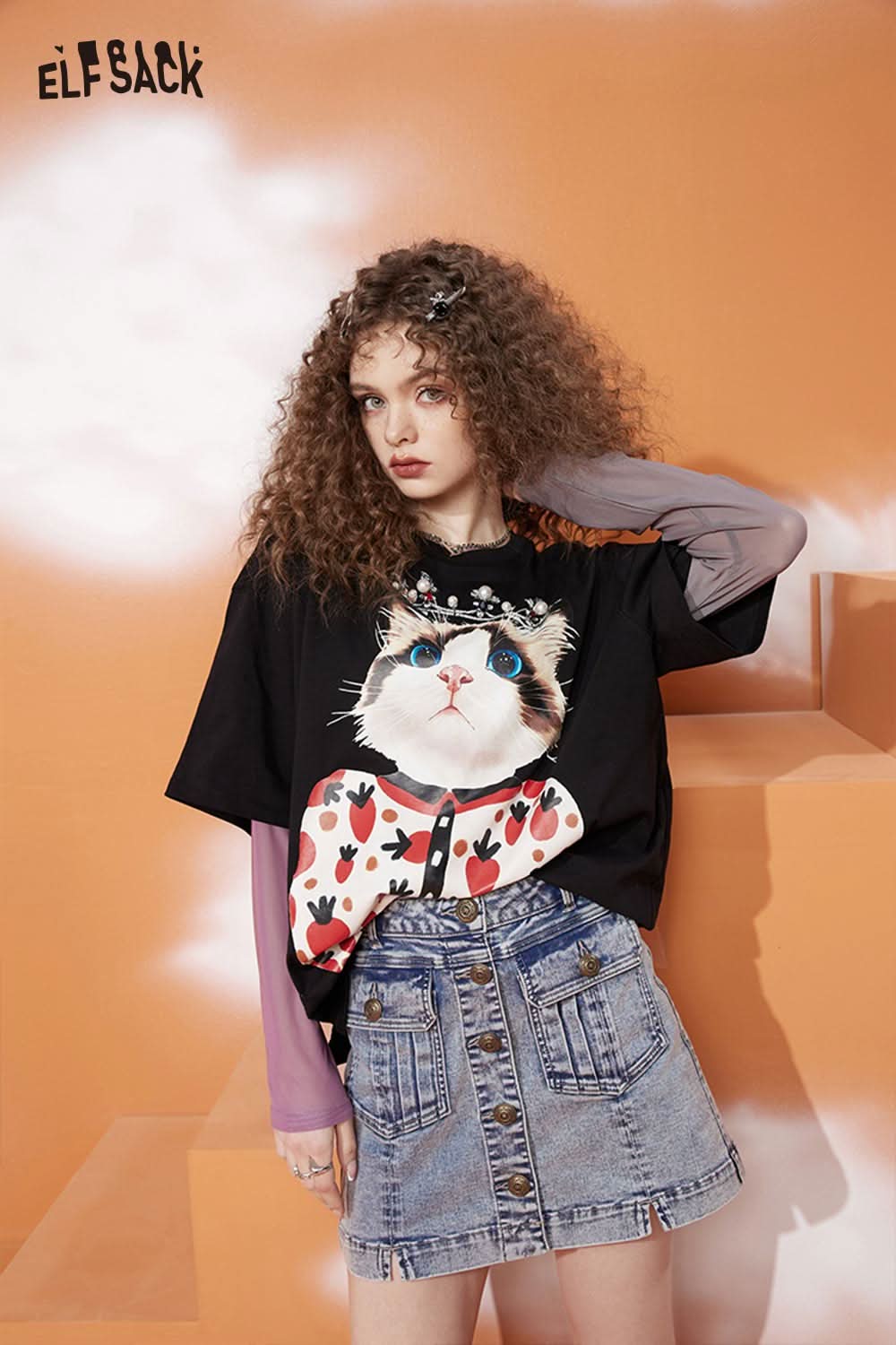 Cat Print Black Loose Casual Crewneck T-Shirt