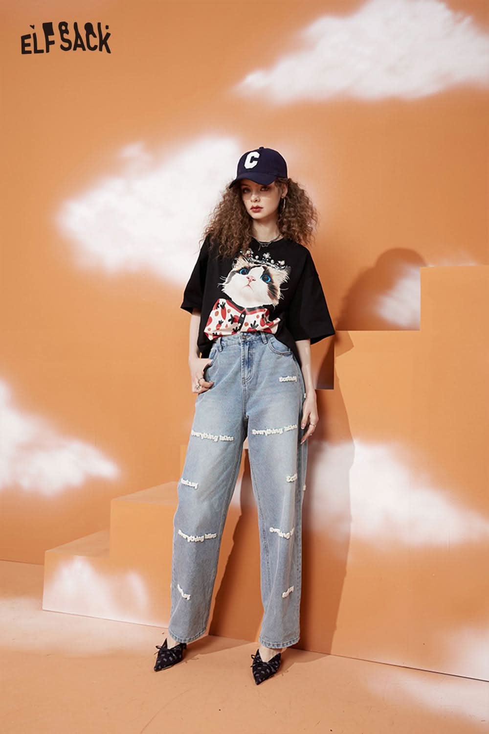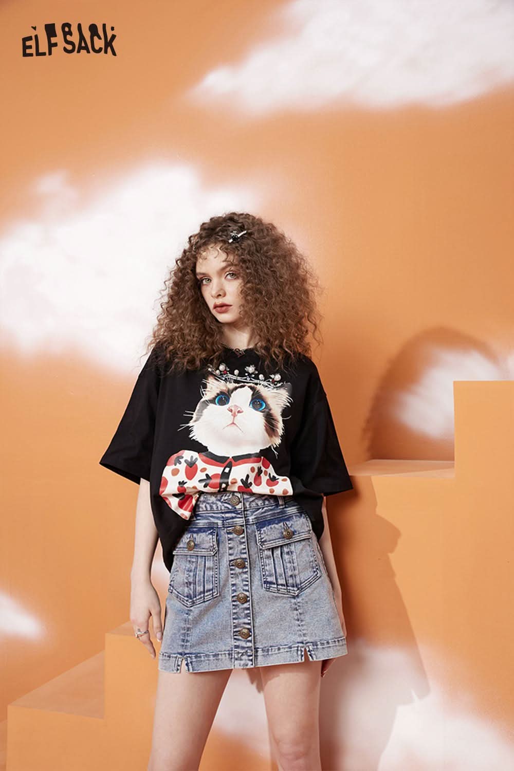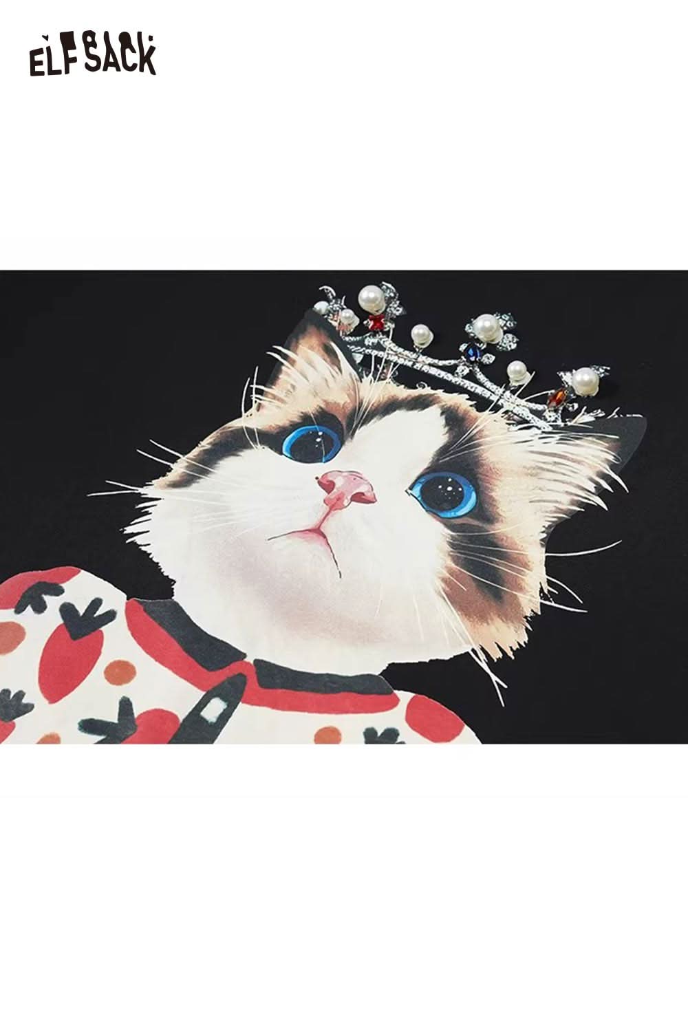 Cat Print Black Loose Casual Crewneck T-Shirt