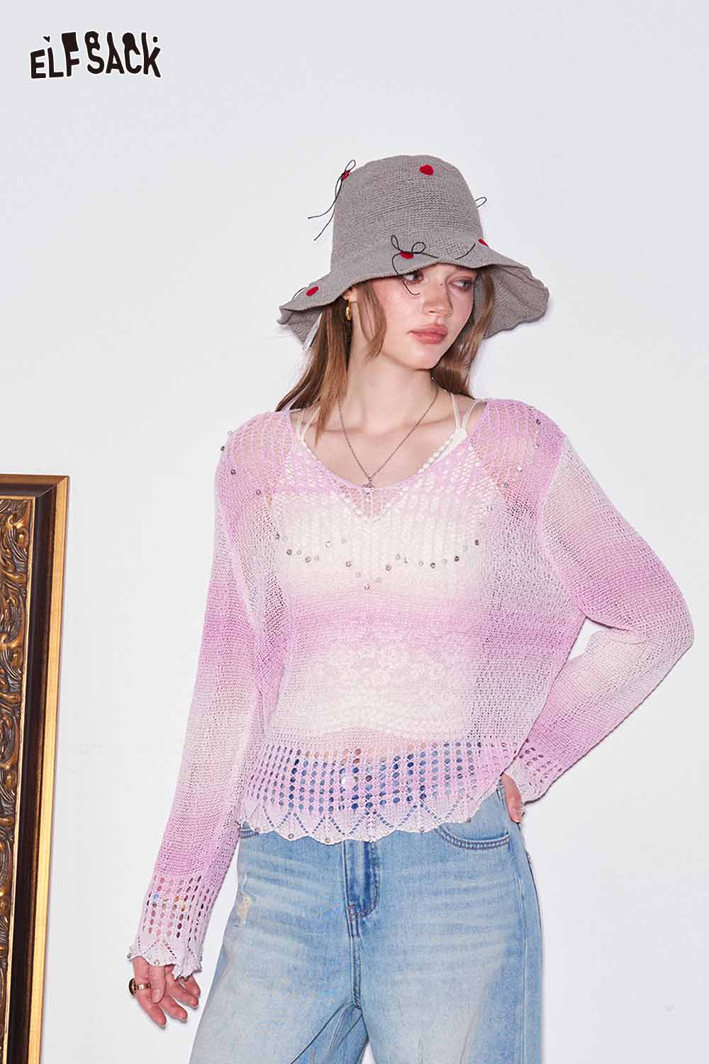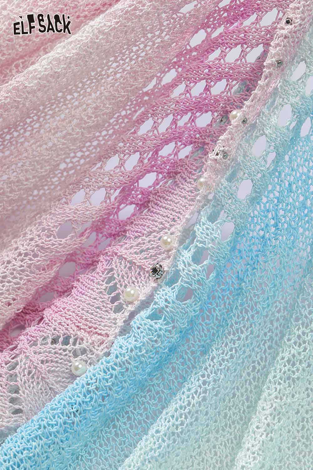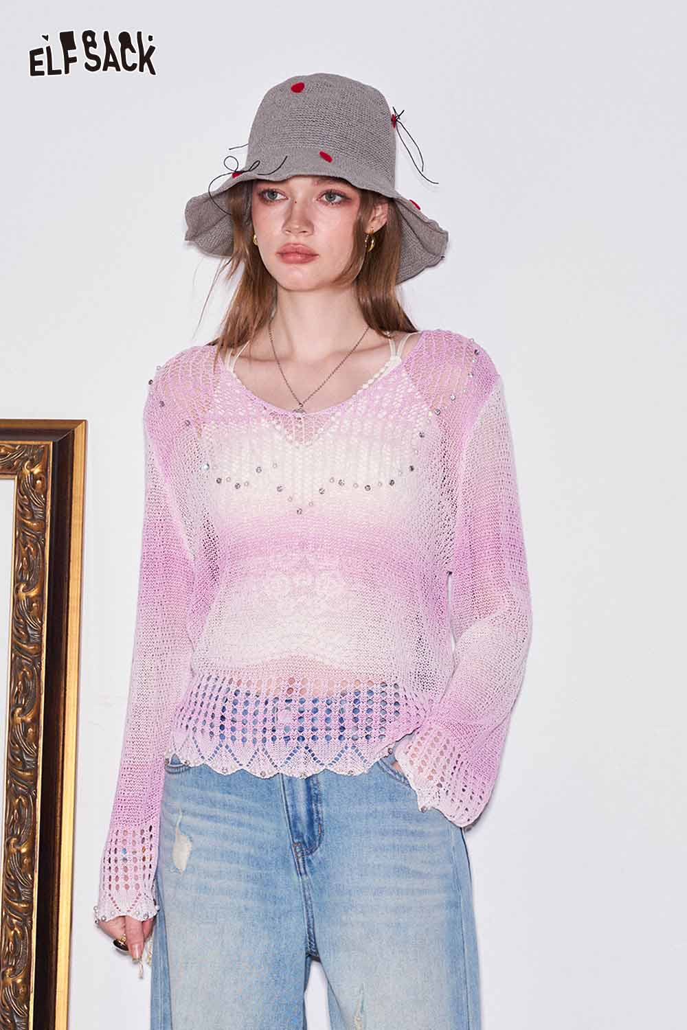 Gradient Pointelle Rhinestone Knit Sweater