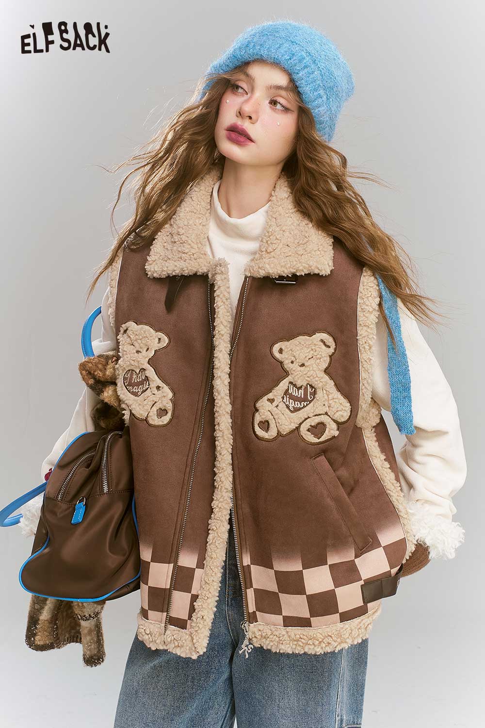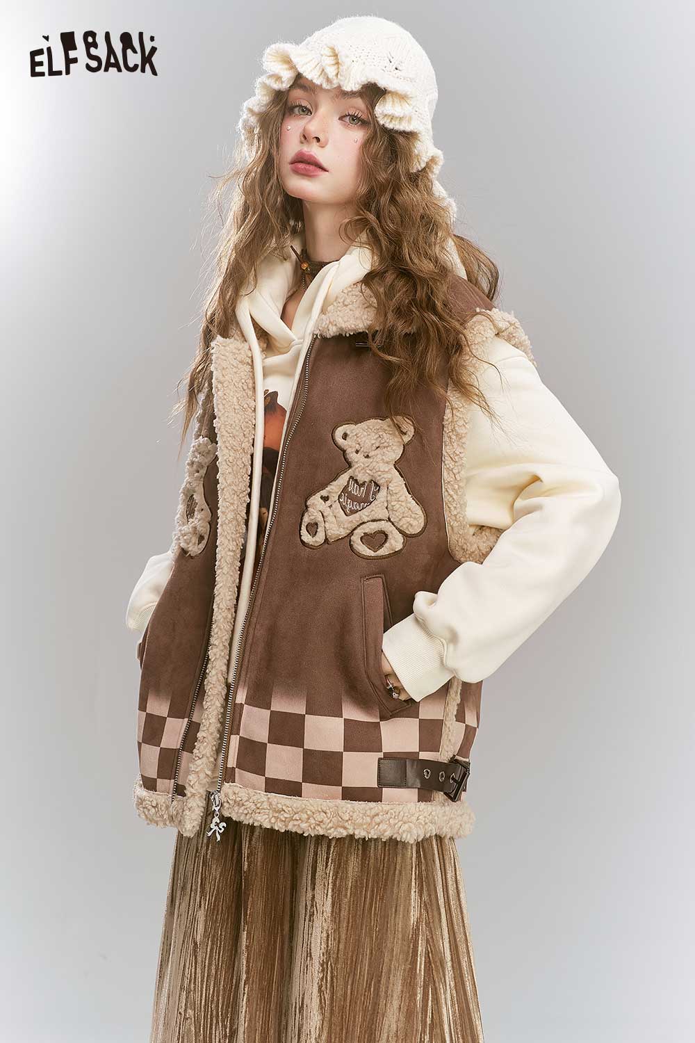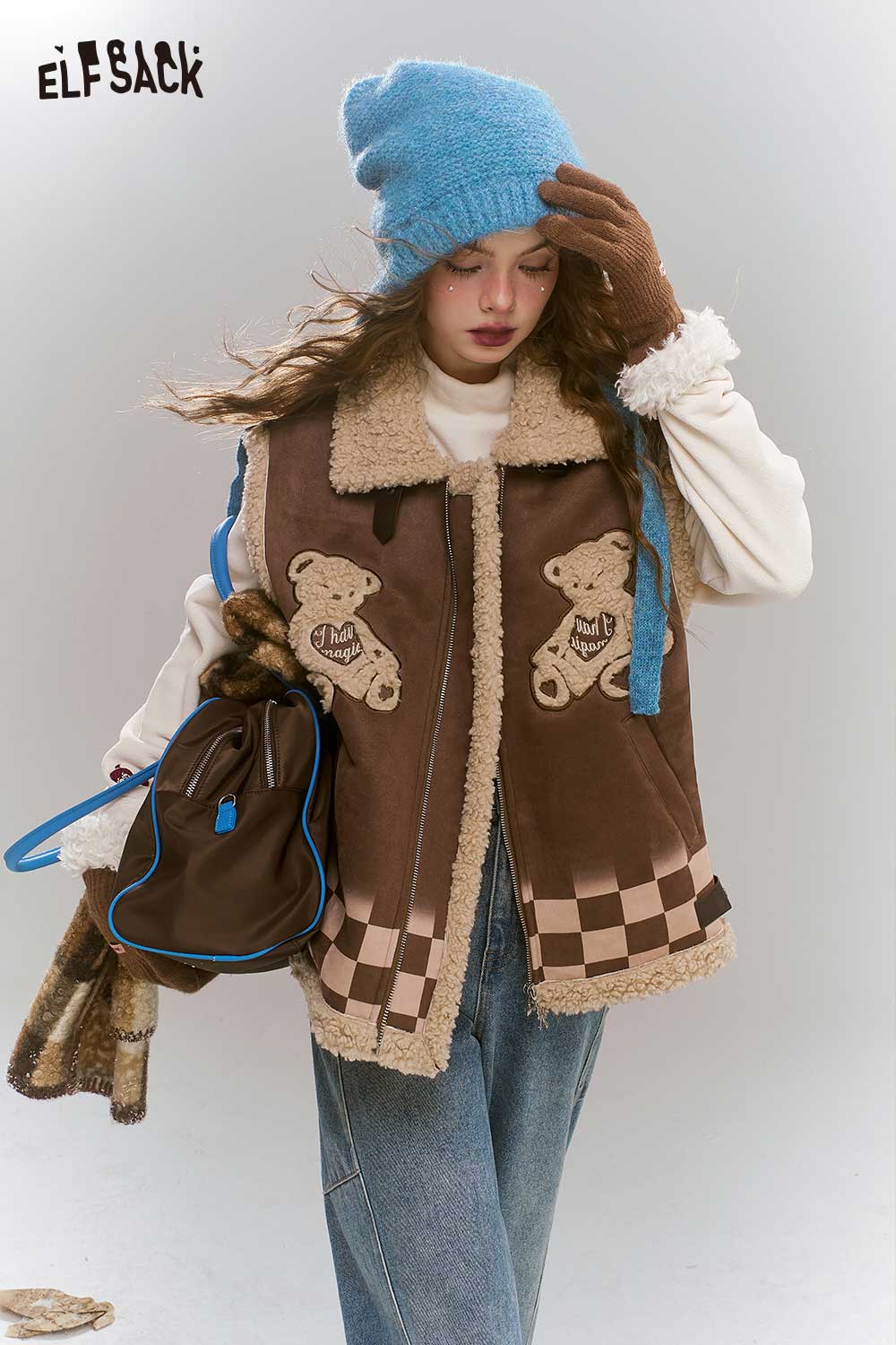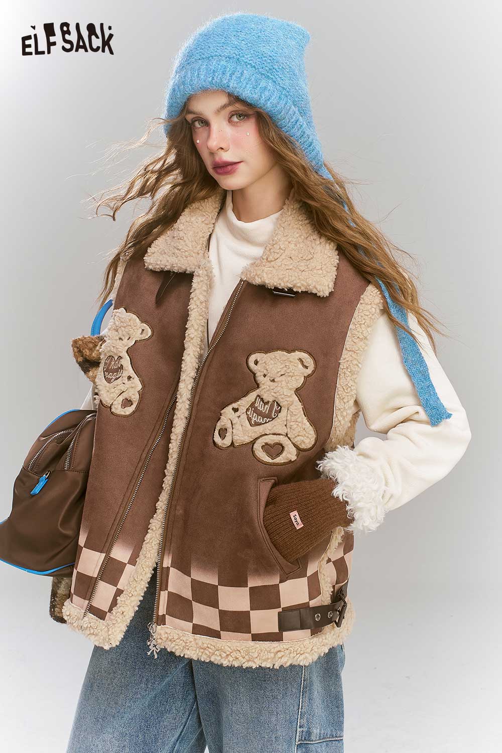 3D Plush Bear Faux Suede Checkerboard Patchwork Vest