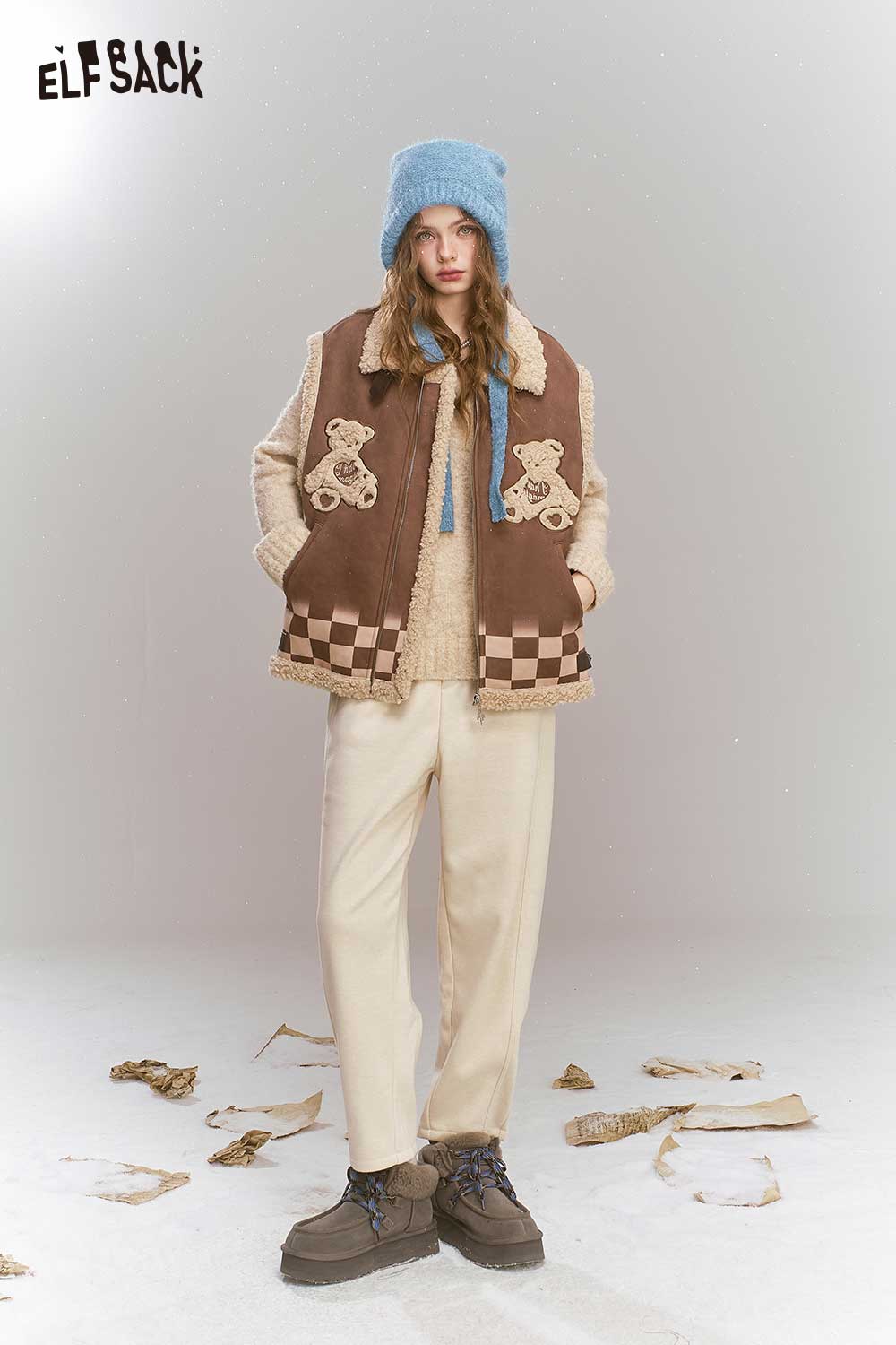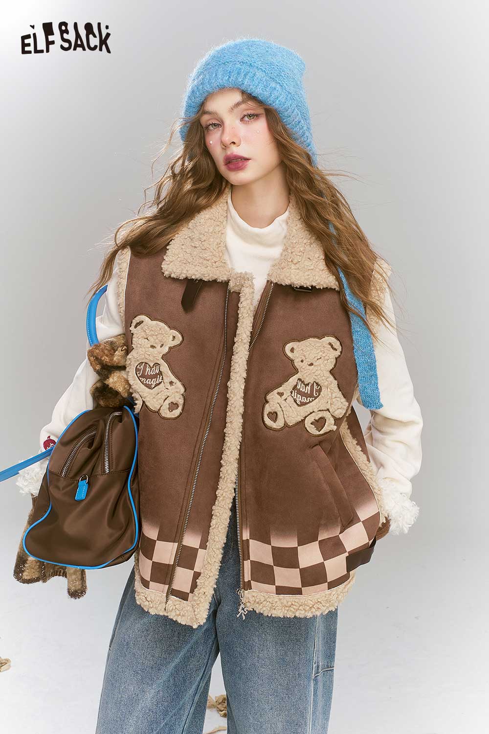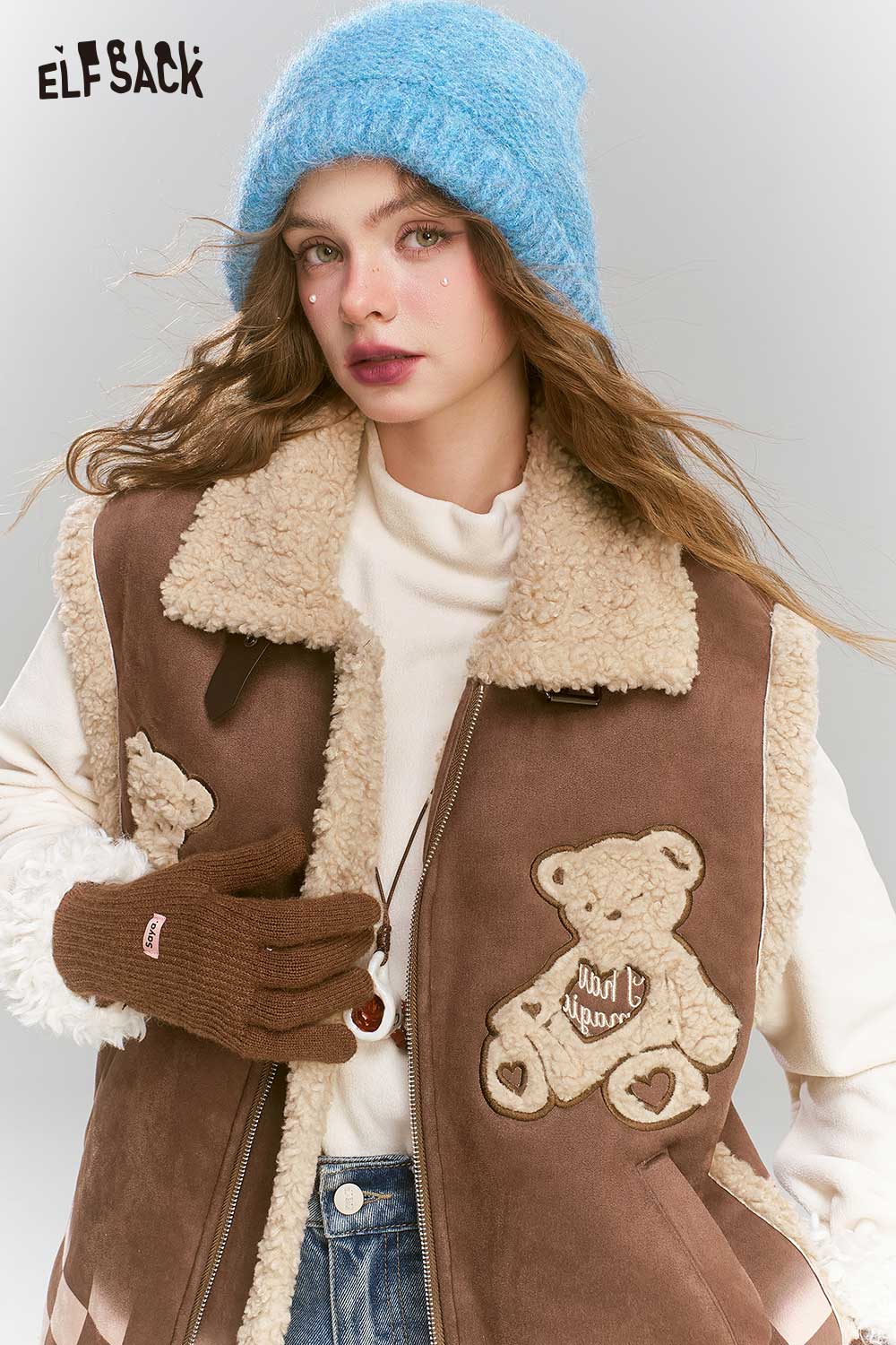 3D Plush Bear Faux Suede Checkerboard Patchwork Vest