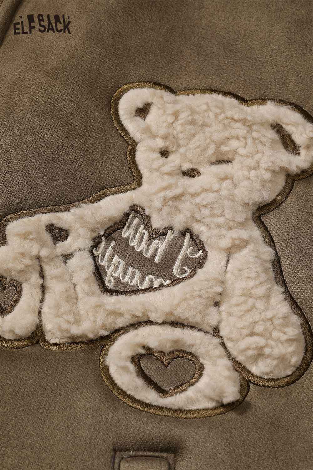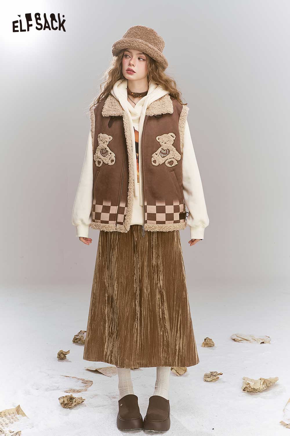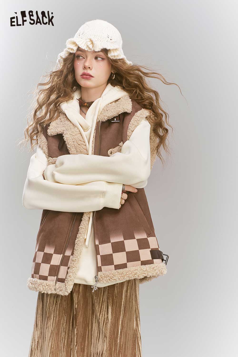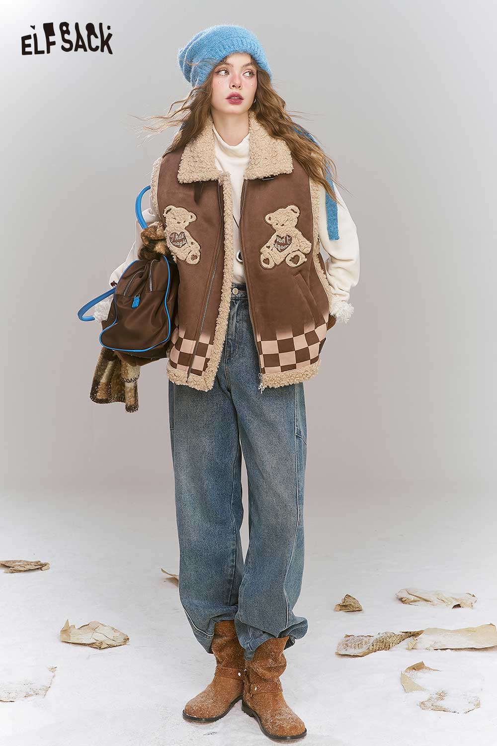 3D Plush Bear Faux Suede Checkerboard Patchwork Vest