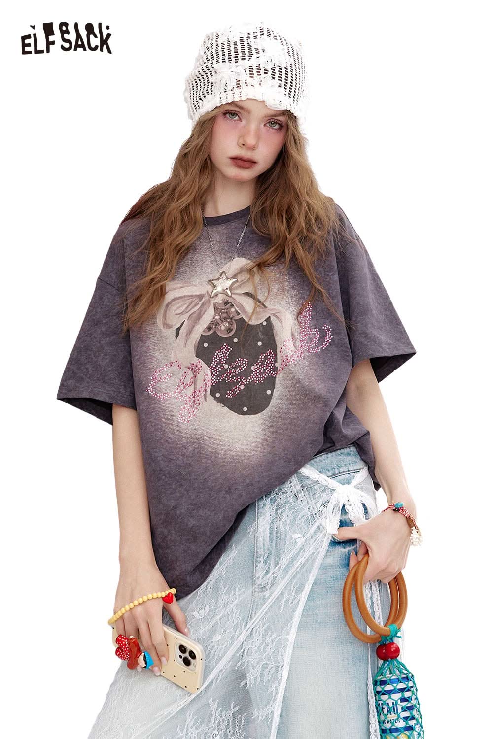 コットンジャージー ドロップショルダー フェイクレイヤード グラフィックプリントTシャツ