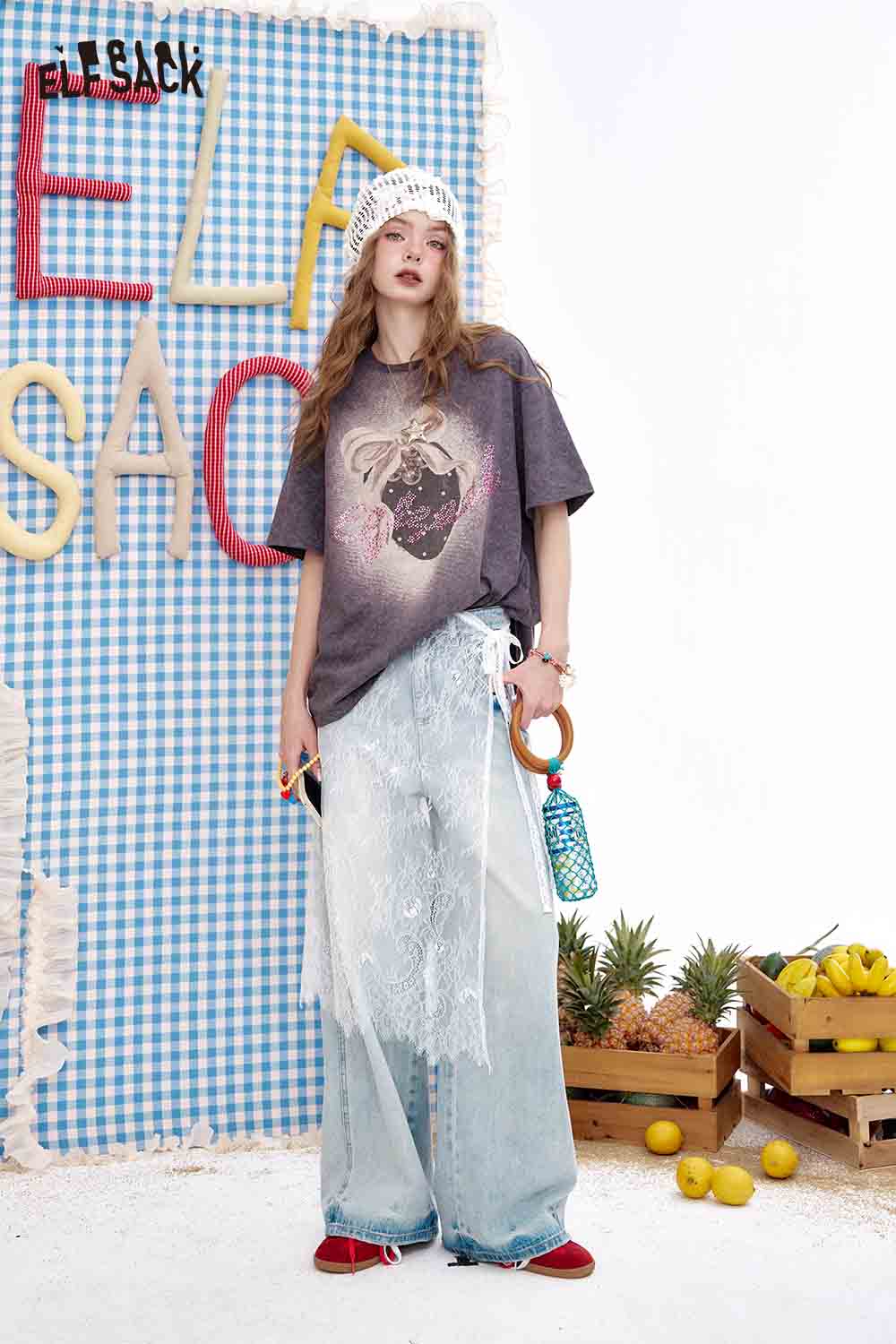 気まぐれなグラフィティカートゥーンプリントのワイドレッグジーンズ