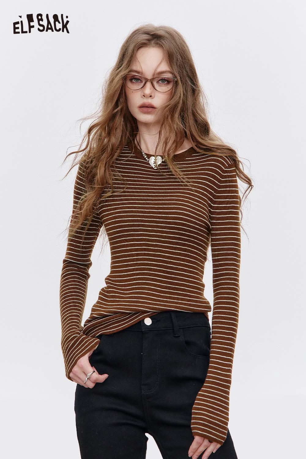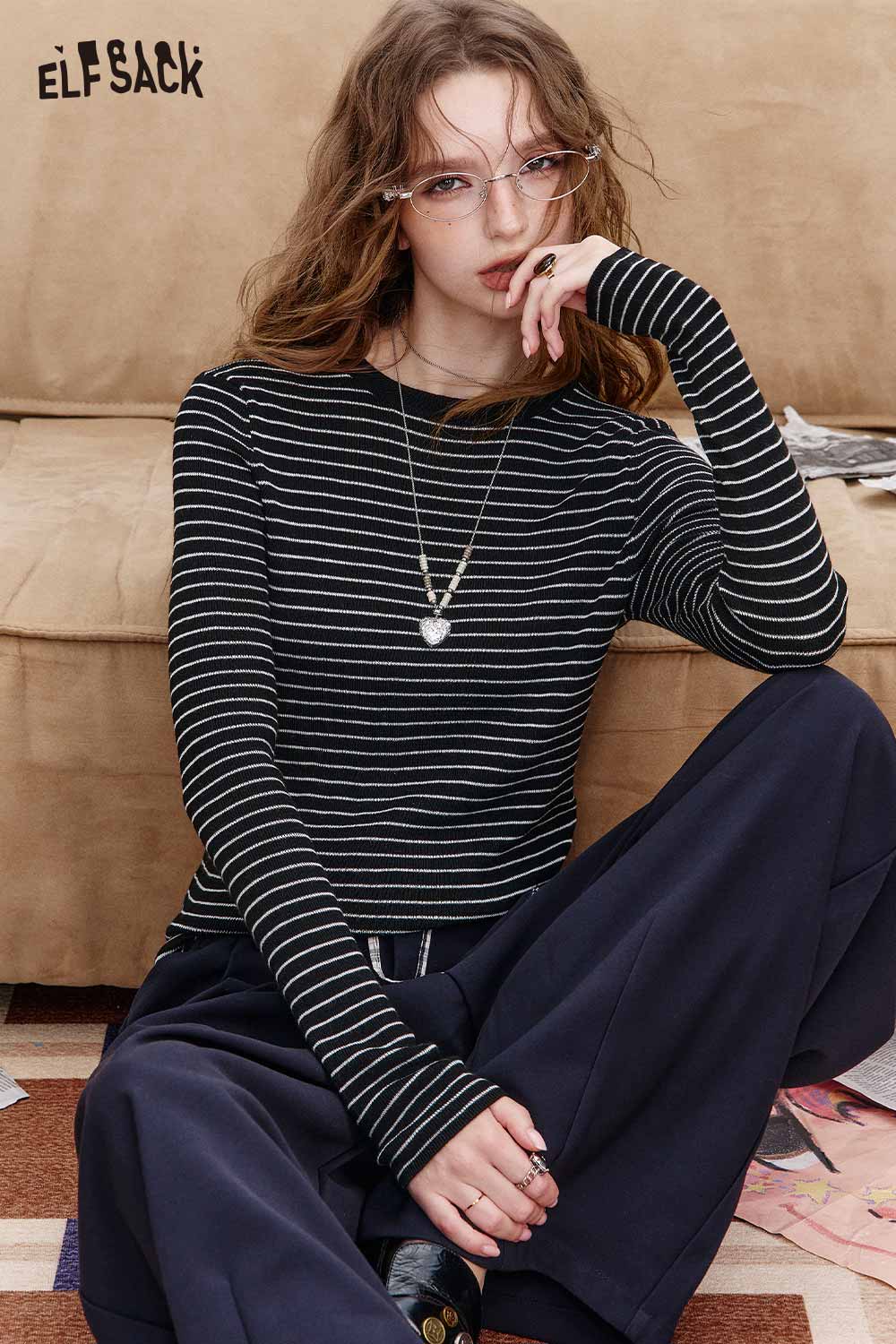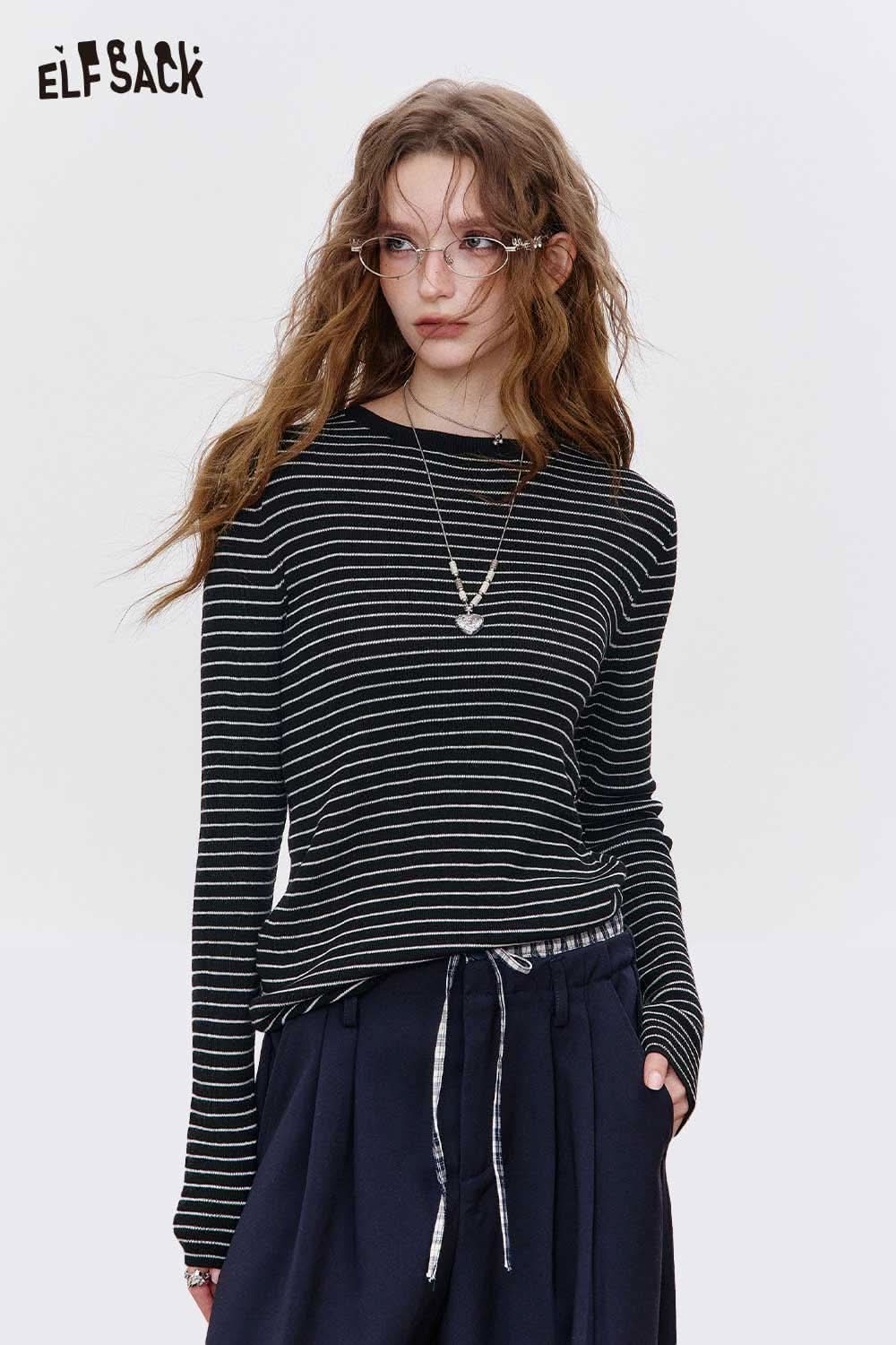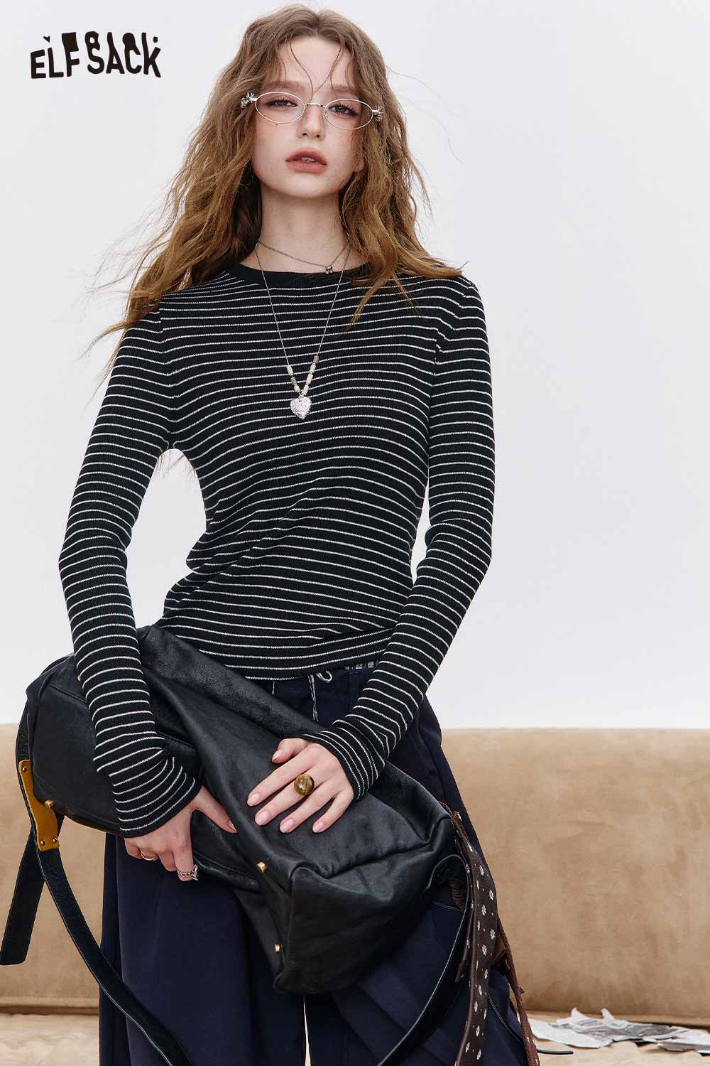 Breathable Cotton Blend Striped Design Essential Basic Long Sleeve Top