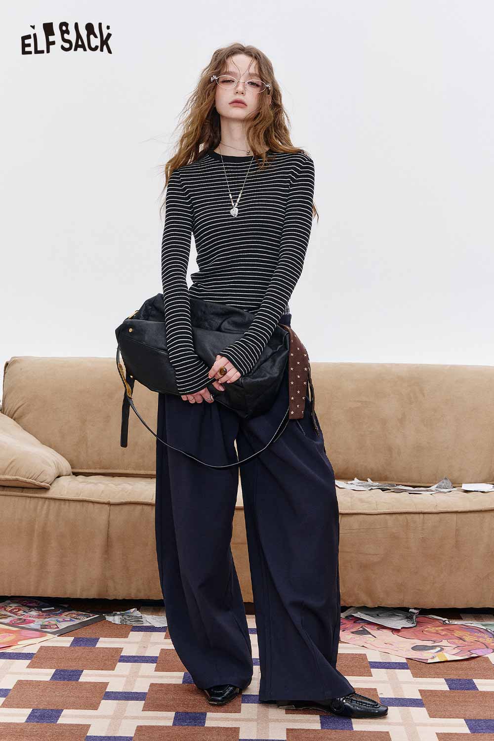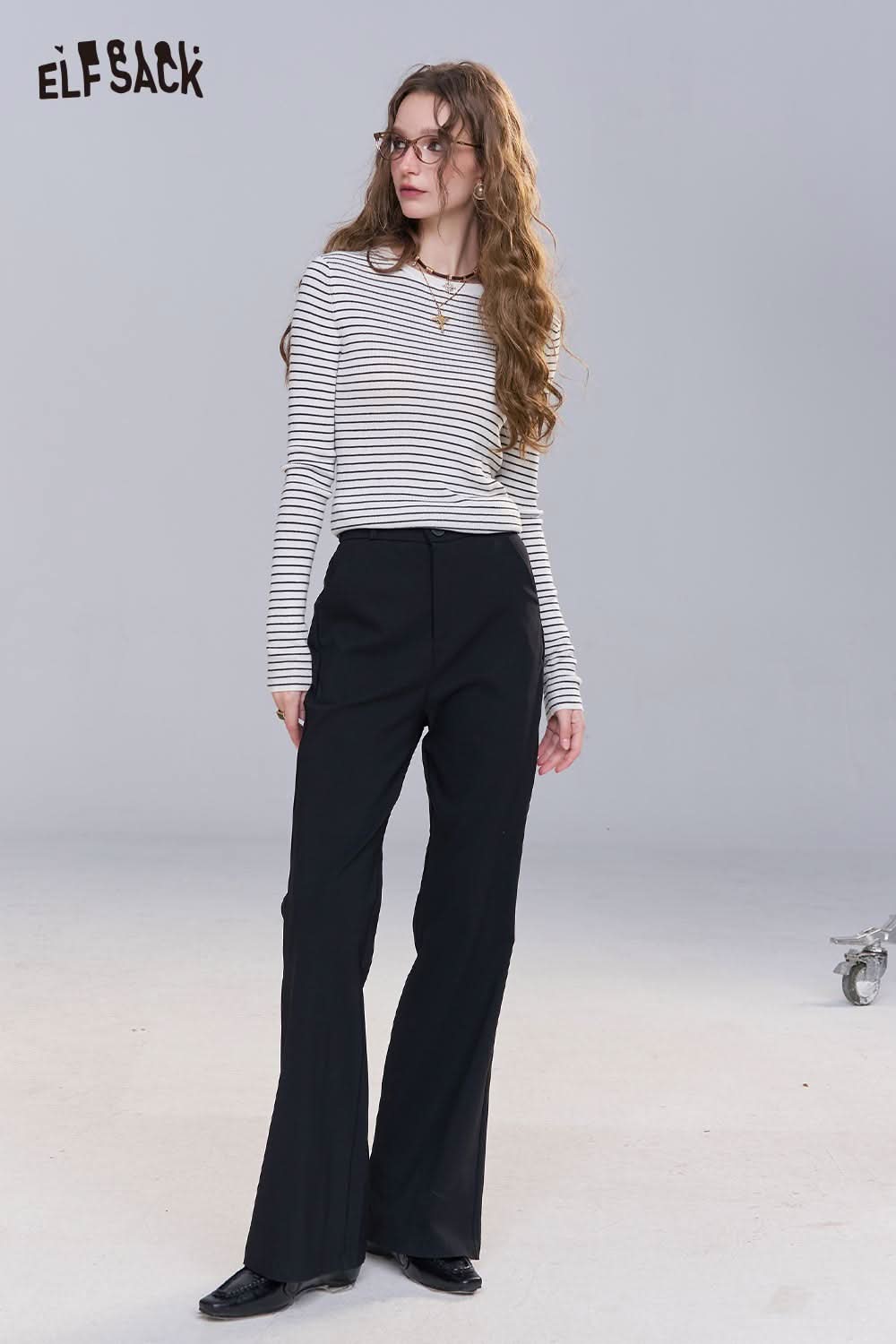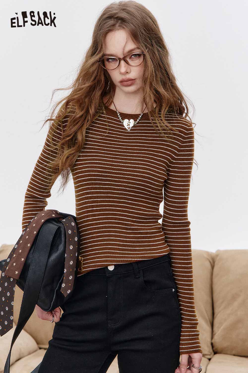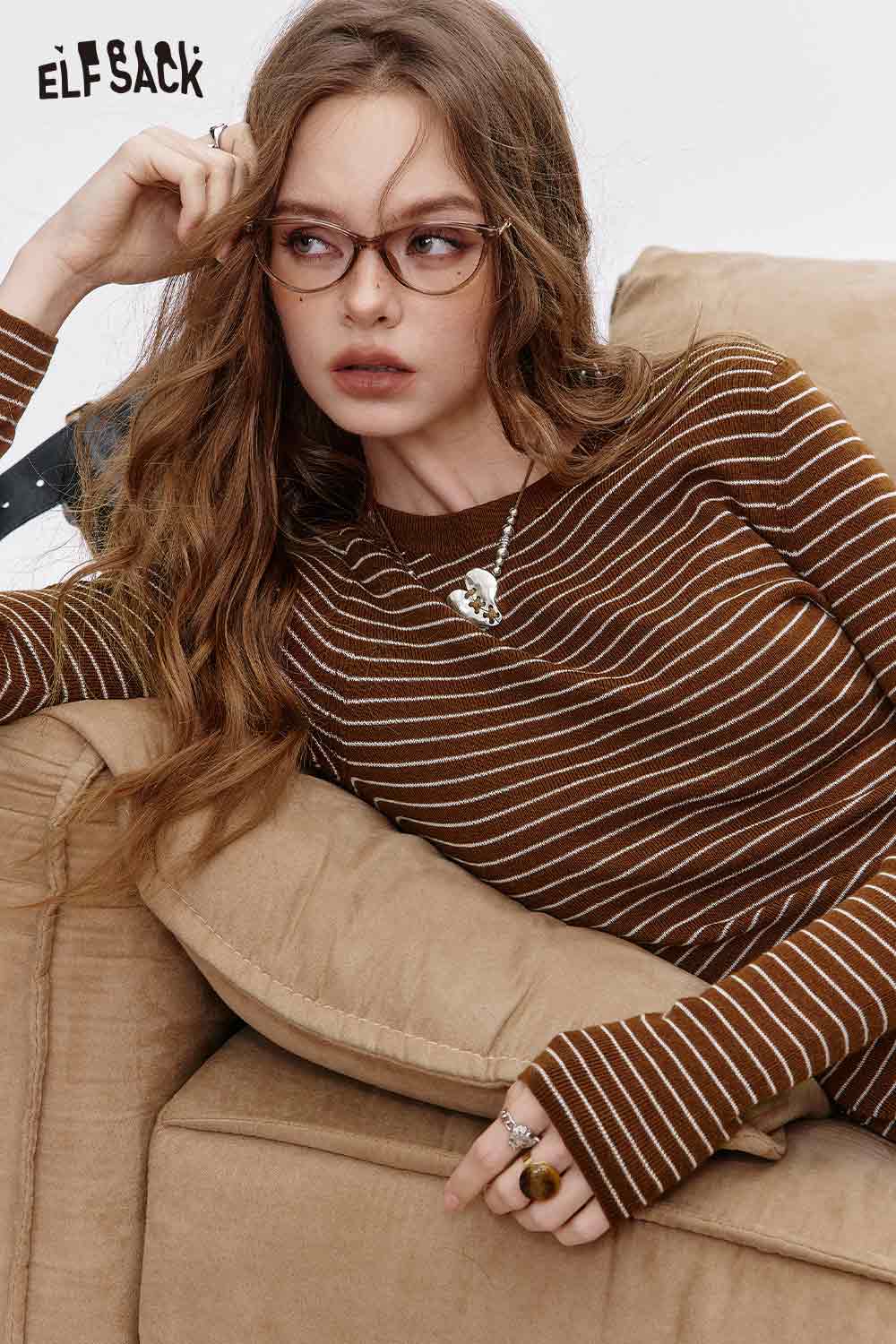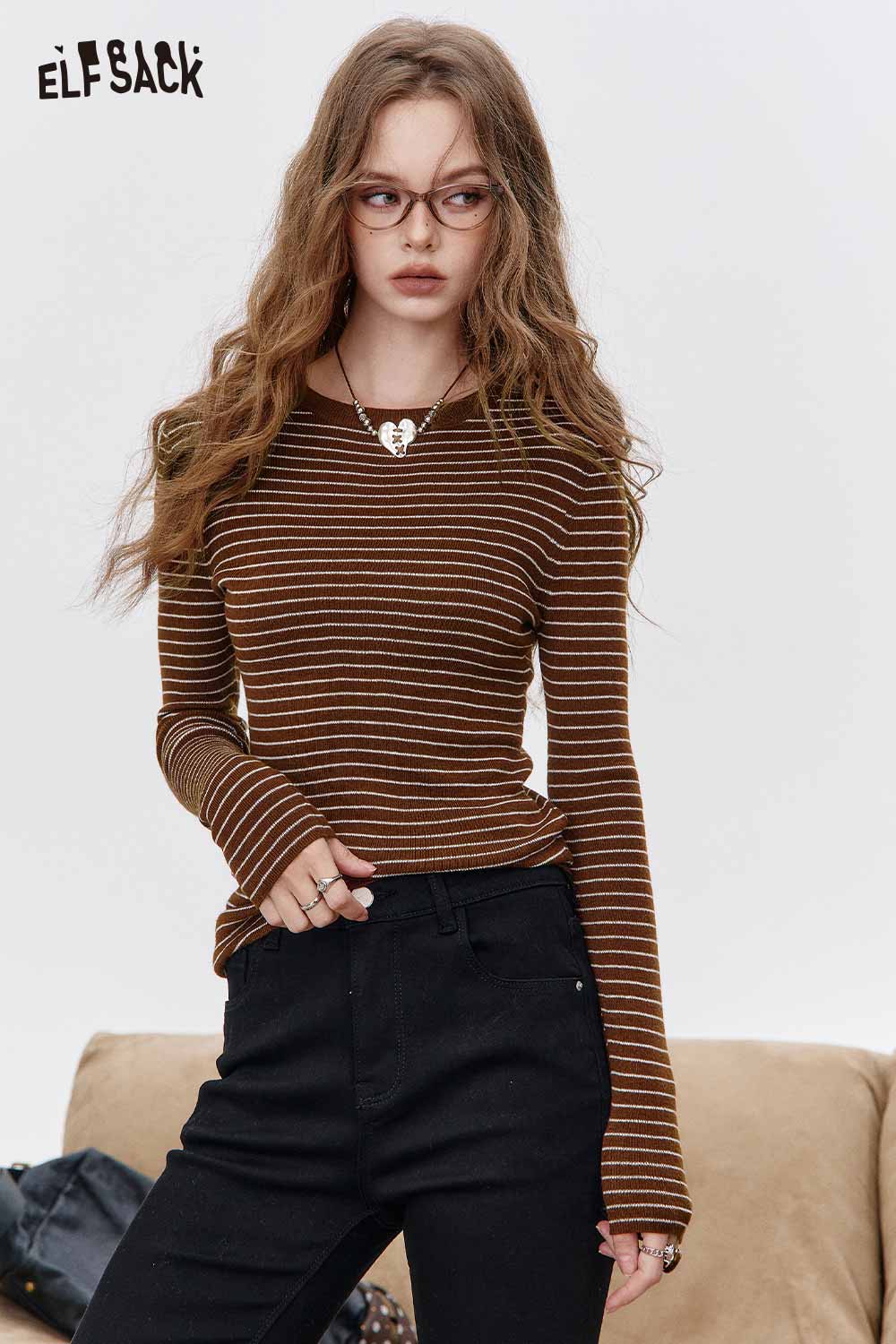 Breathable Cotton Blend Striped Design Essential Basic Long Sleeve Top