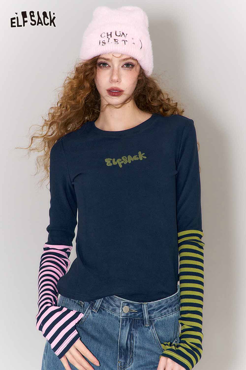 ELFSACK color block stripe sleeve t-shirt featuring vibrant striped long sleeves and a casual fit