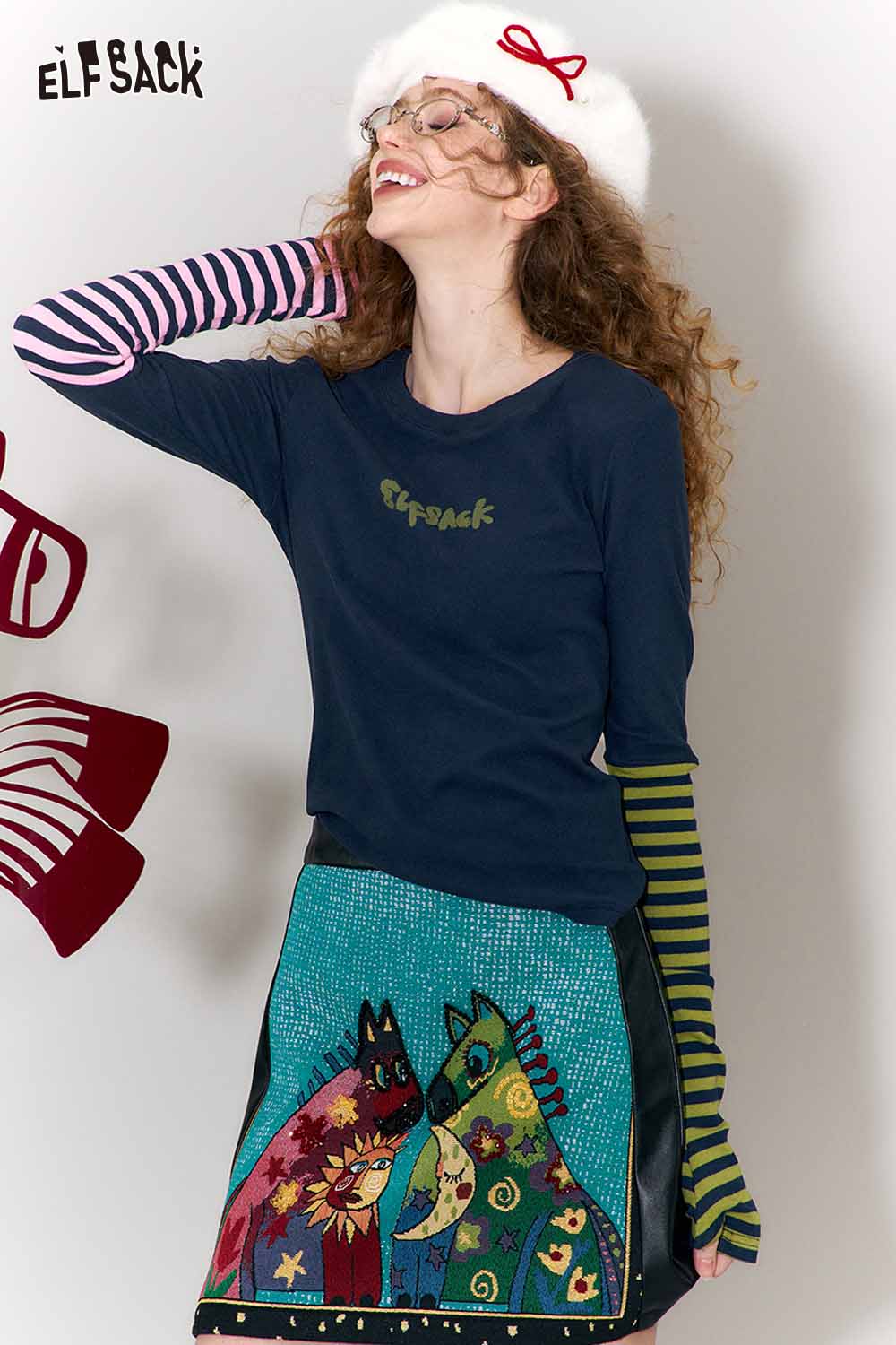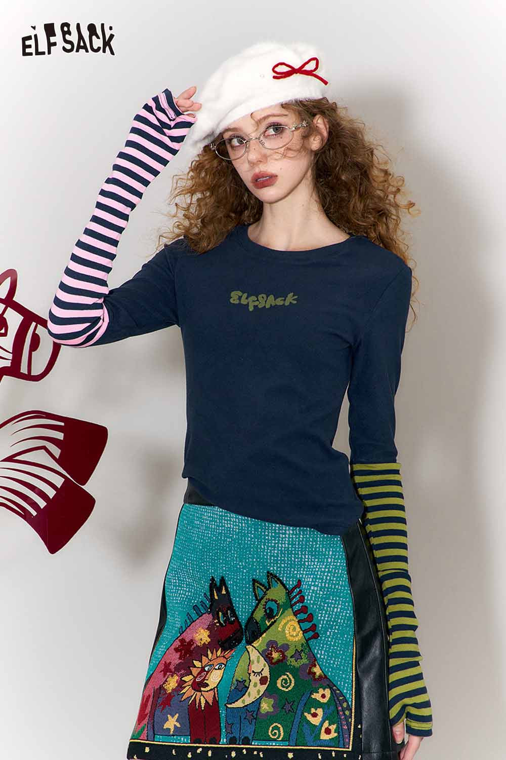 ELFSACK color block stripe sleeve t-shirt paired with a colorful artistic skirt for a trendy look
