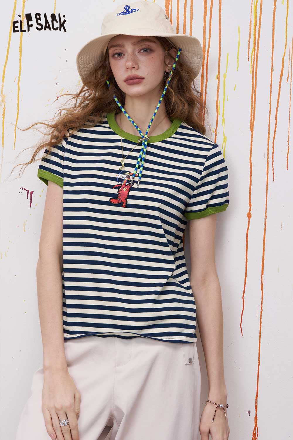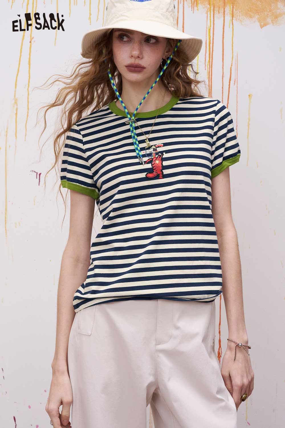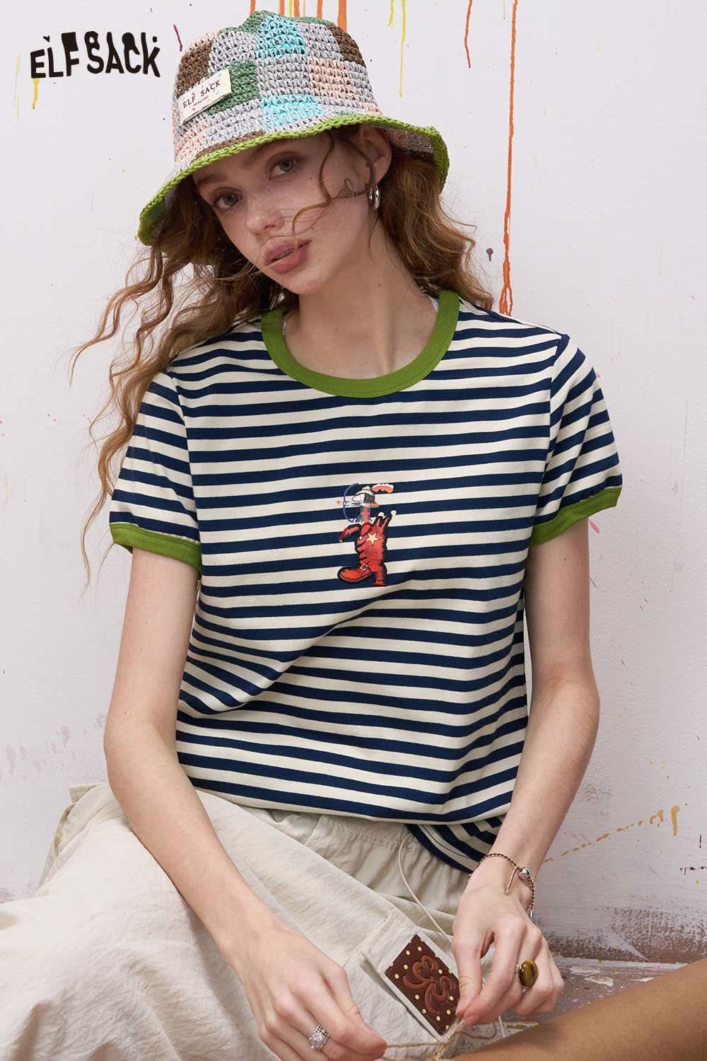 Striped Ringer T Shirt with Cartoon Embroidery