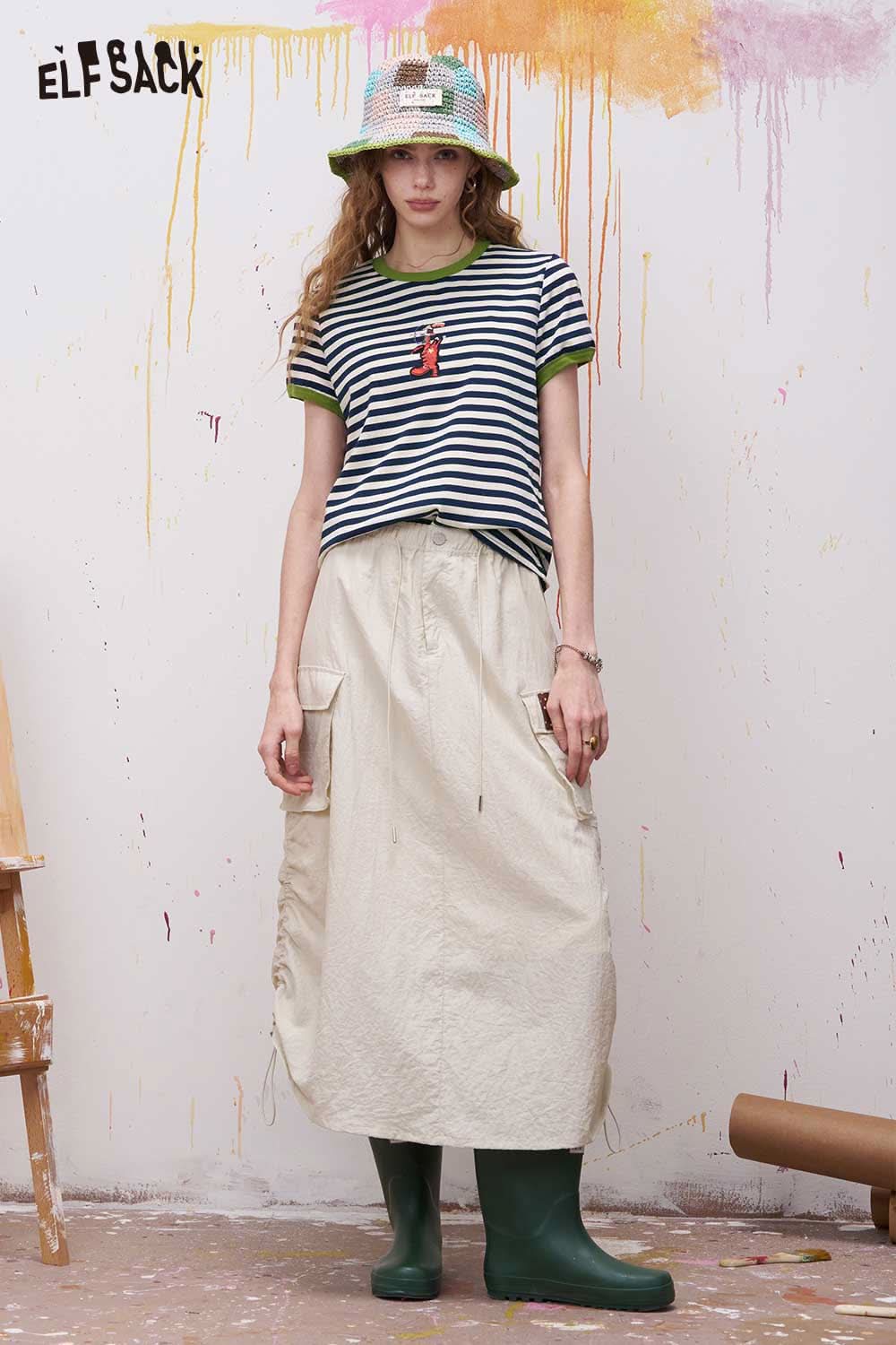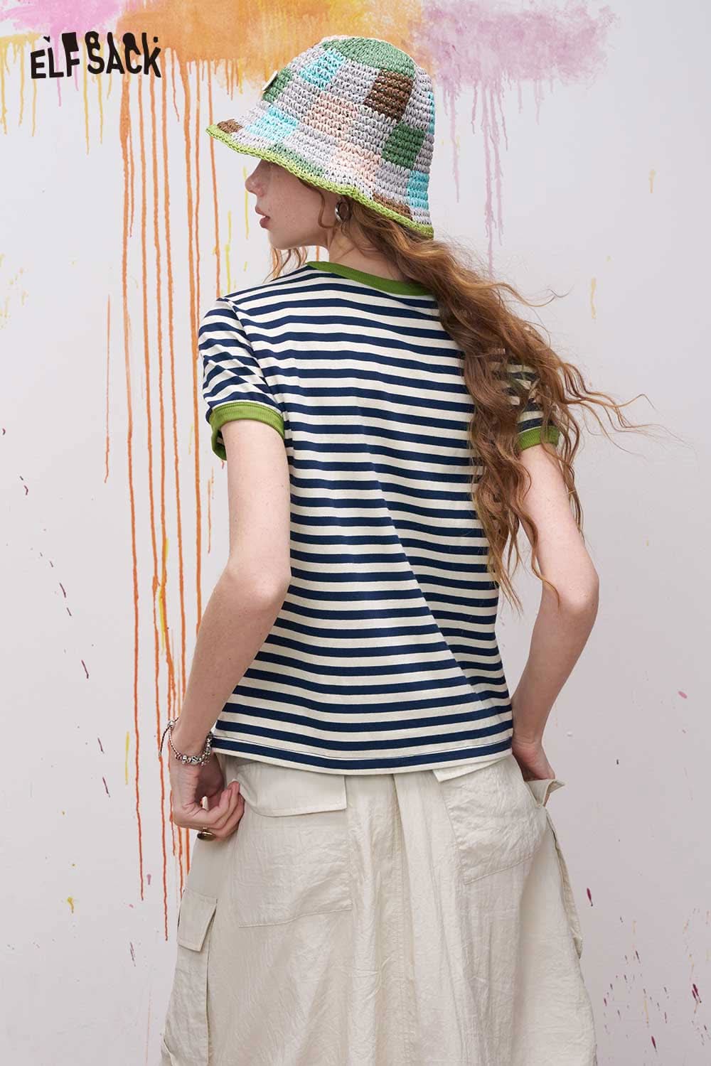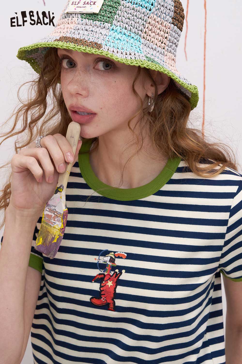 Striped Ringer T Shirt with Cartoon Embroidery