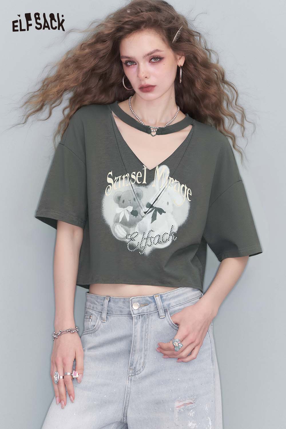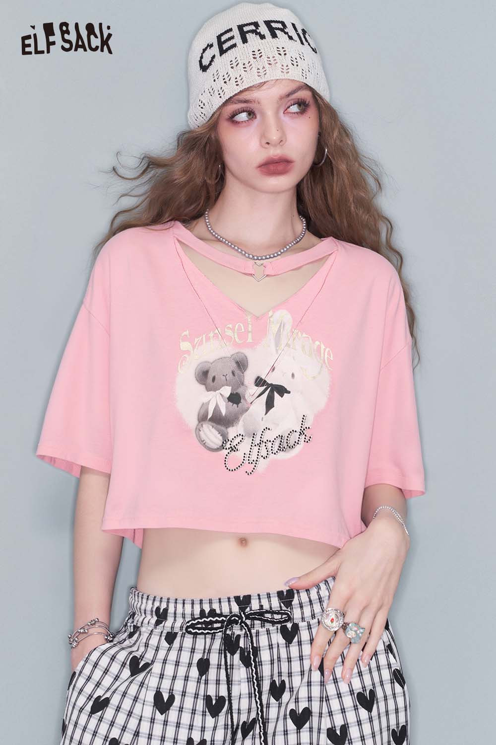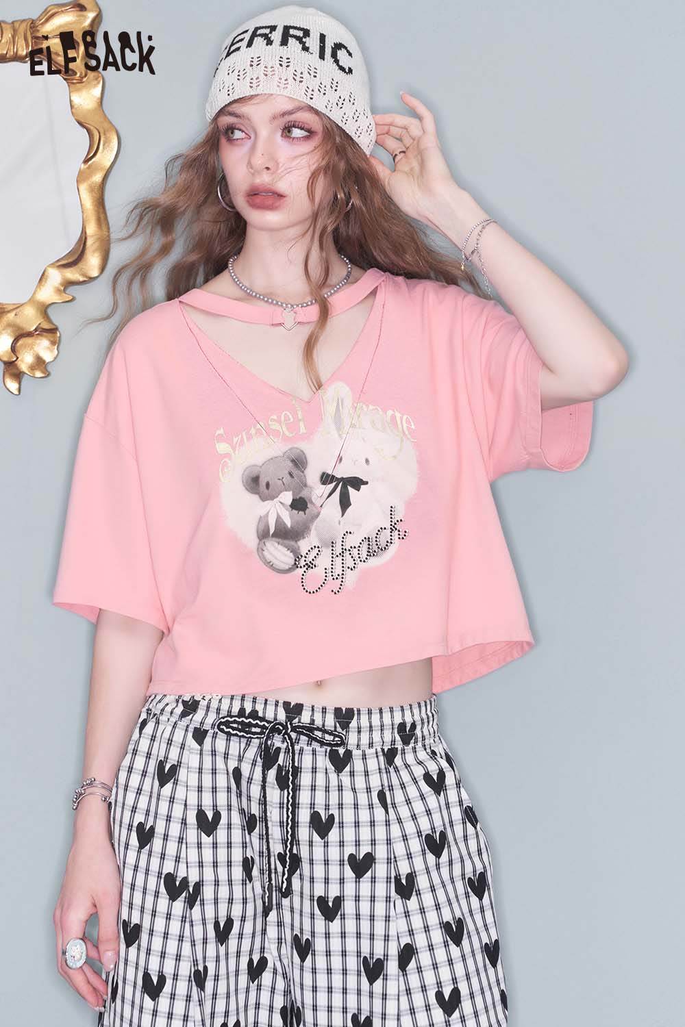 Loose Cropped Bear Print Halter Neck Short Sleeve Tee
