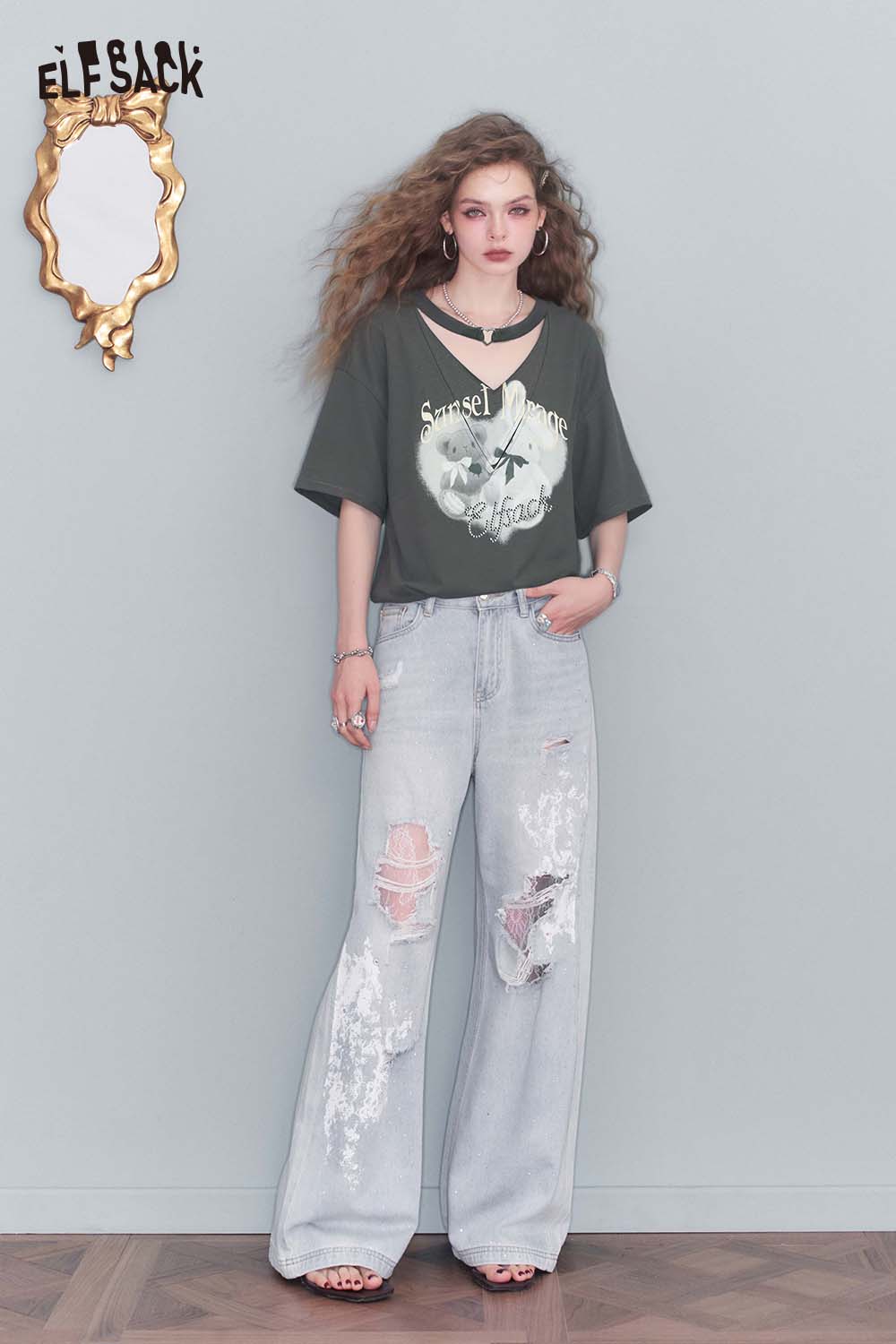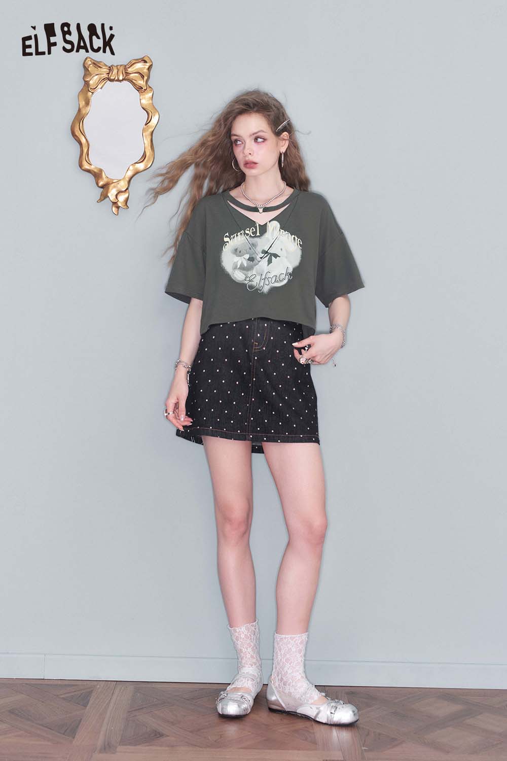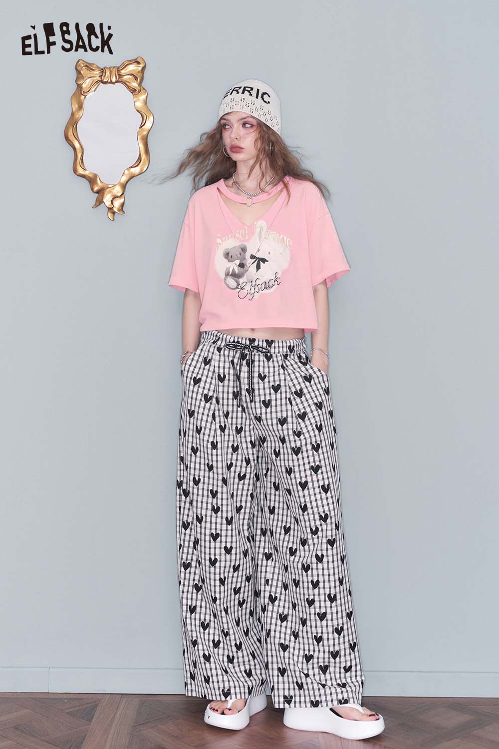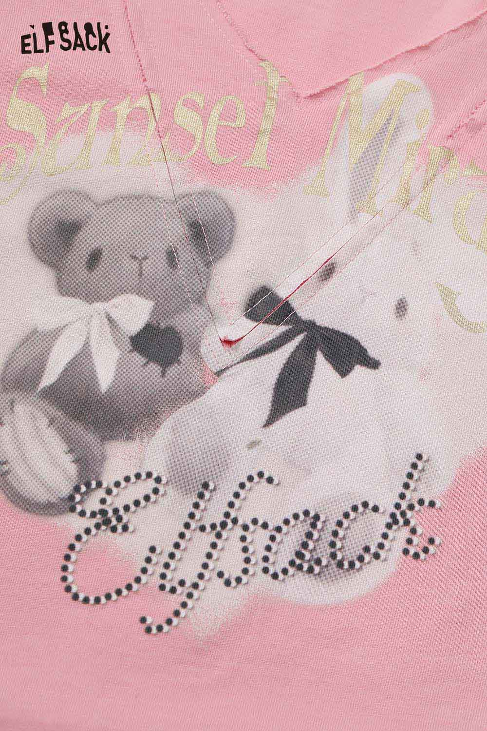 Loose Cropped Bear Print Halter Neck Short Sleeve Tee