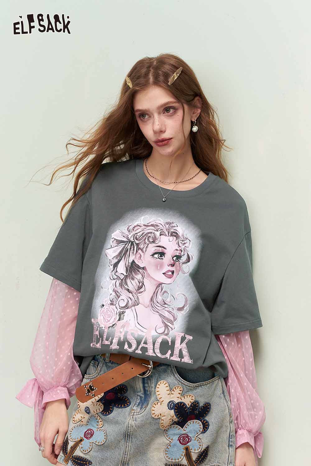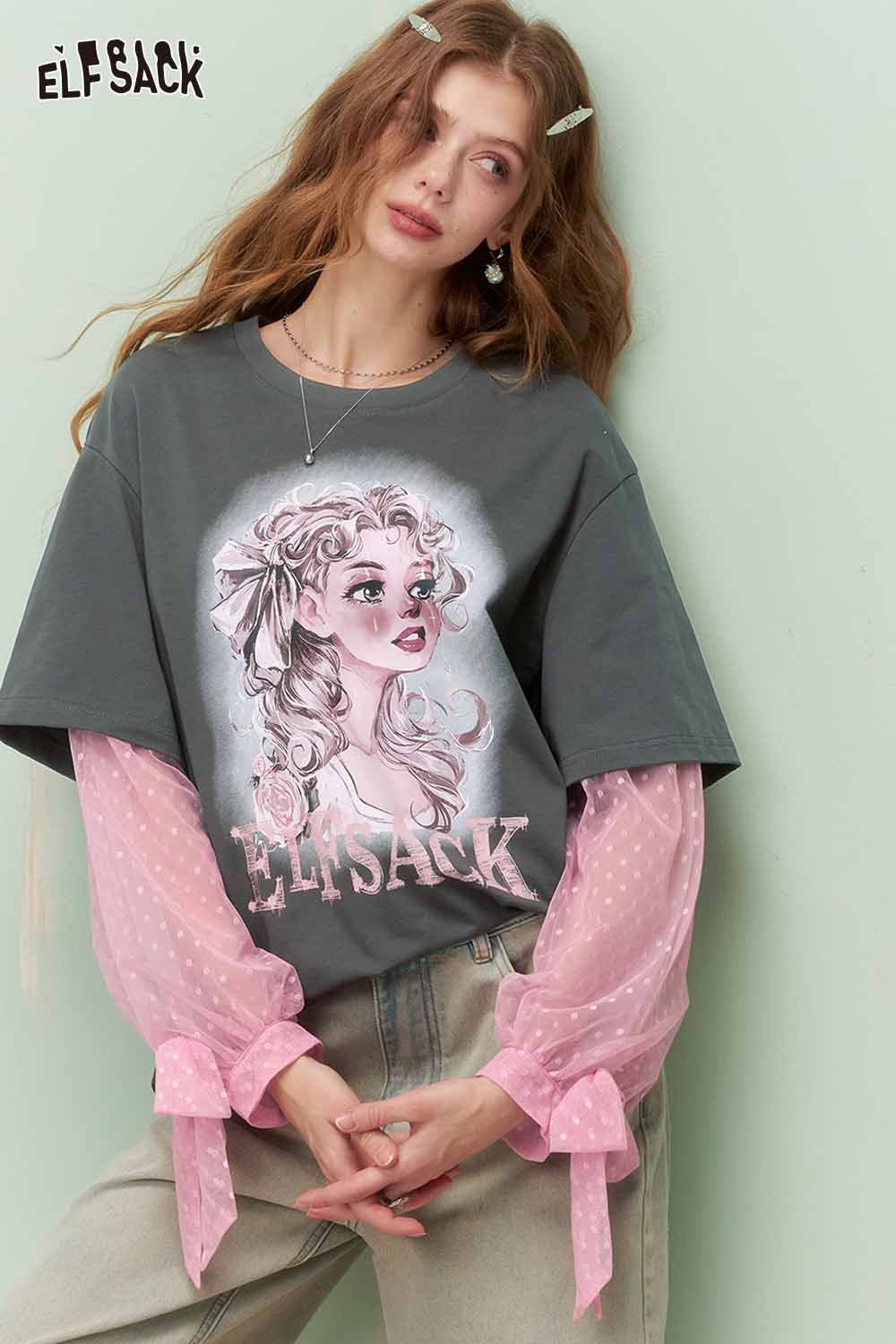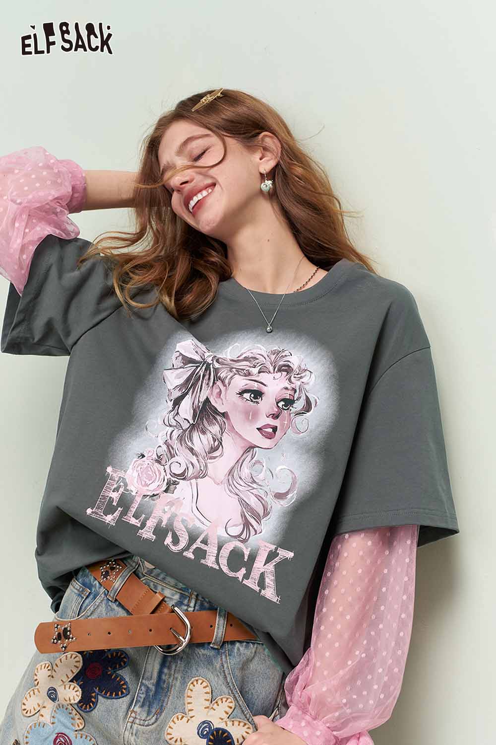 Sweet Cool Girly Contrast Sleeve Princess Print Long Sleeve Tshirt