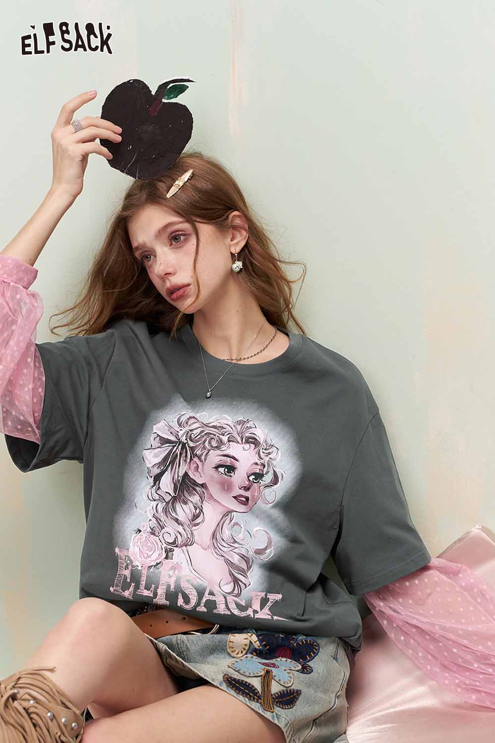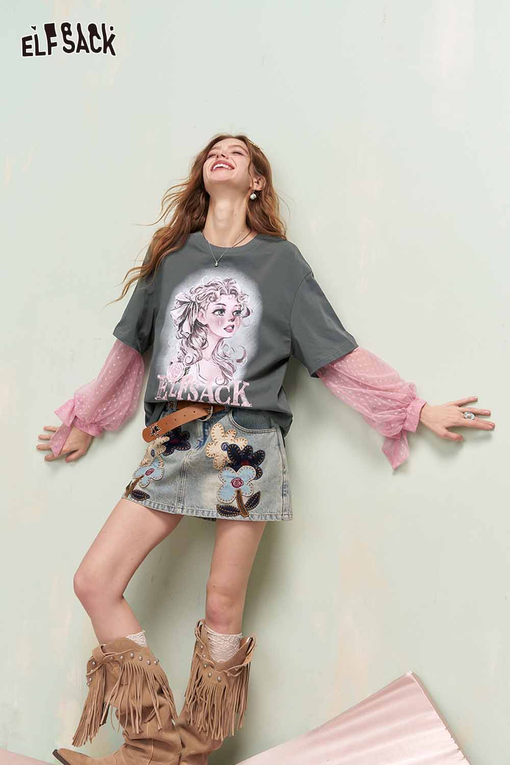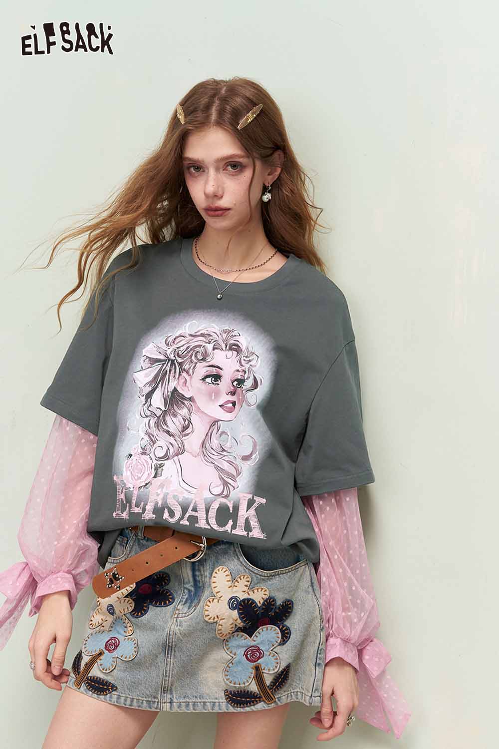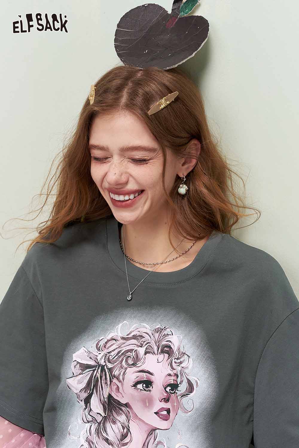 Sweet Cool Girly Contrast Sleeve Princess Print Long Sleeve Tshirt