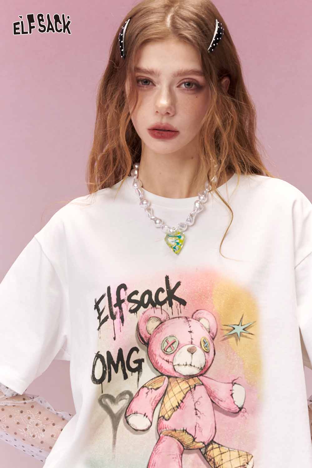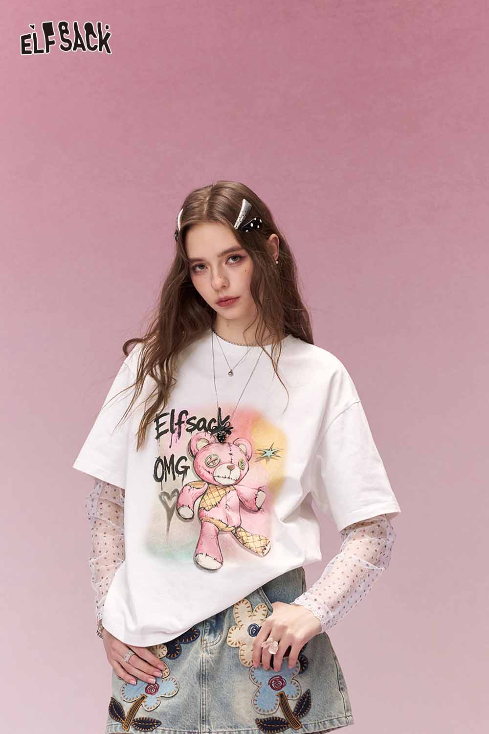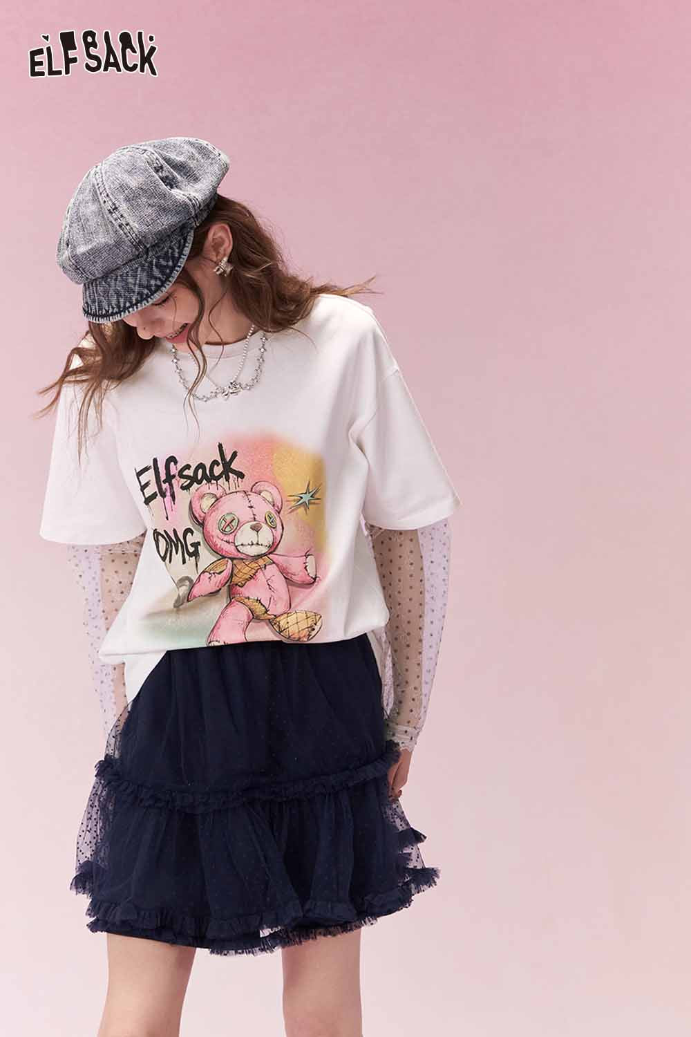 ELFSACK bear print polka dot lace t-shirt featuring a cute cartoon bear design on a white fabric