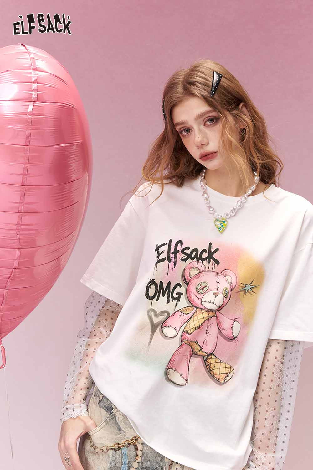 ELFSACK bear print polka dot lace t-shirt featuring a cute teddy bear design and colorful accents
