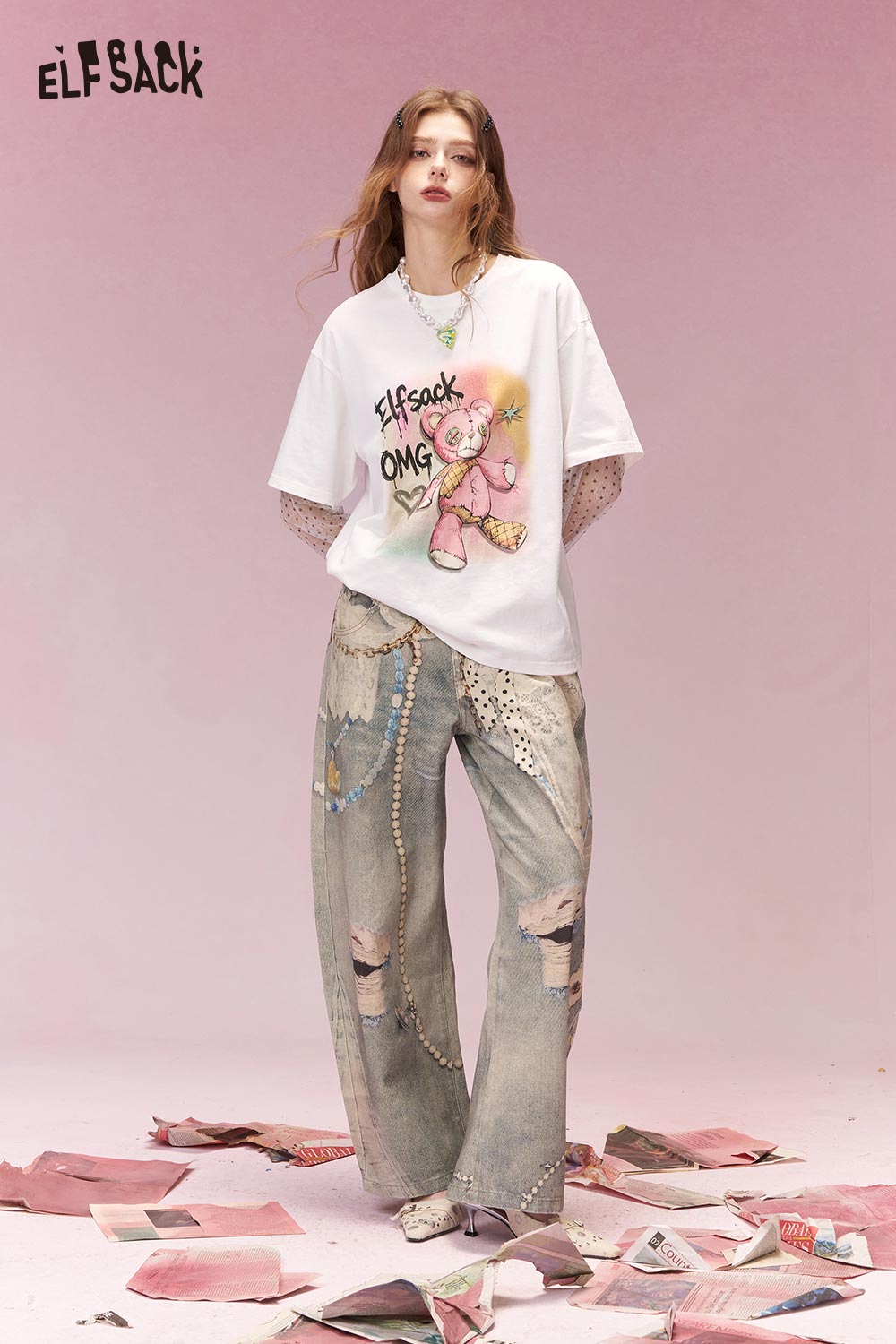 ELFSACK bear print polka dot lace t-shirt styled with oversized jeans for a trendy look