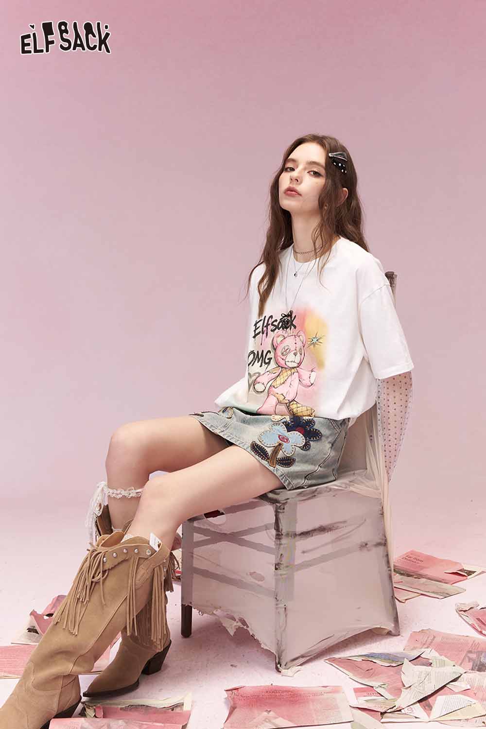ELFSACK bear print polka dot lace t-shirt styled with a denim skirt and knee-high boots