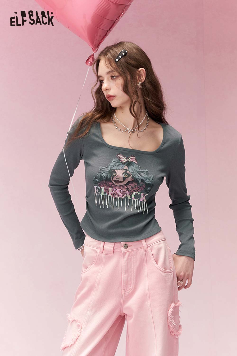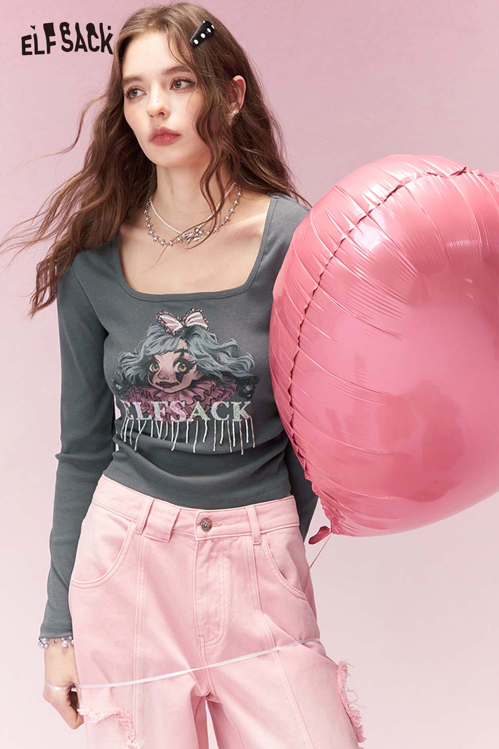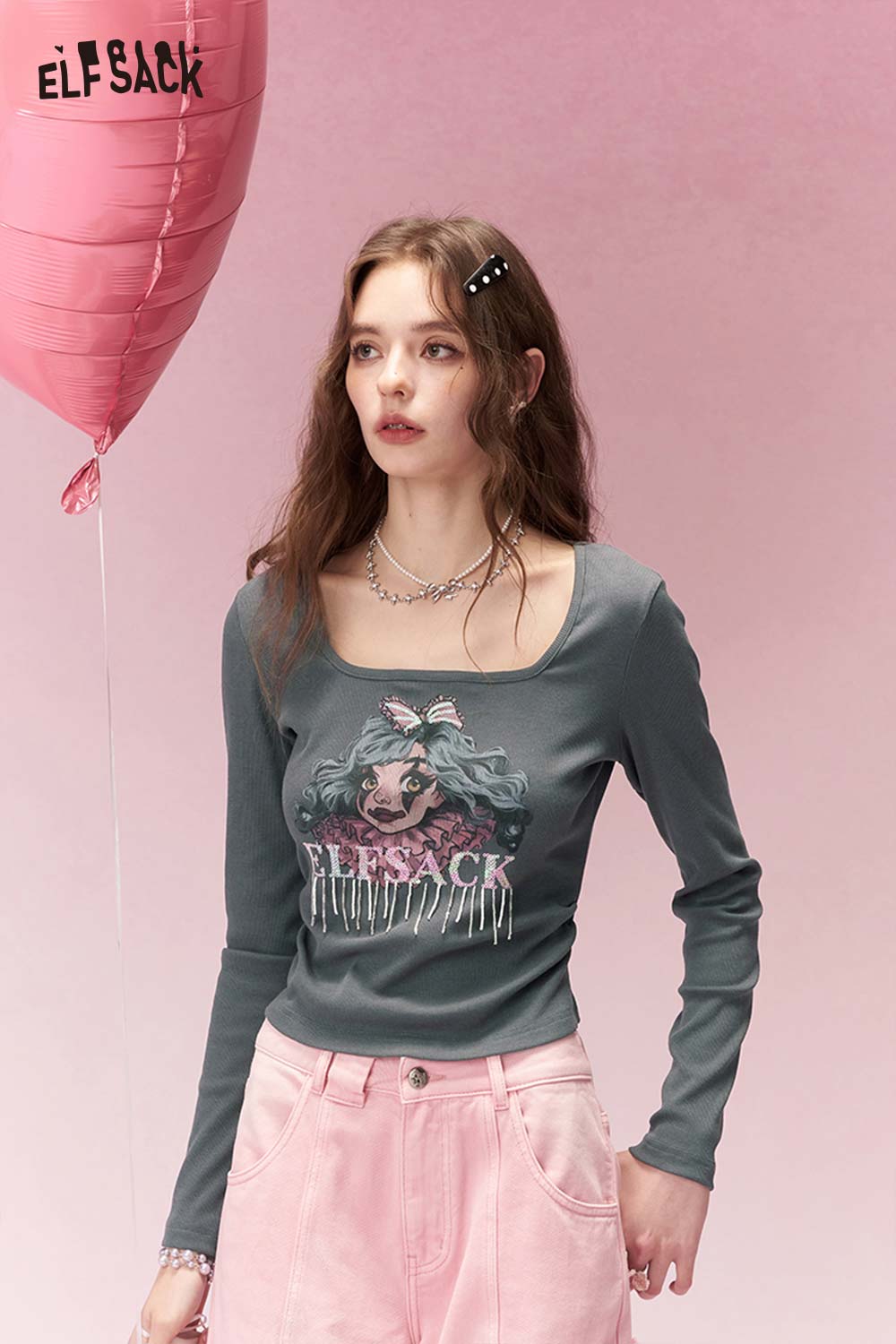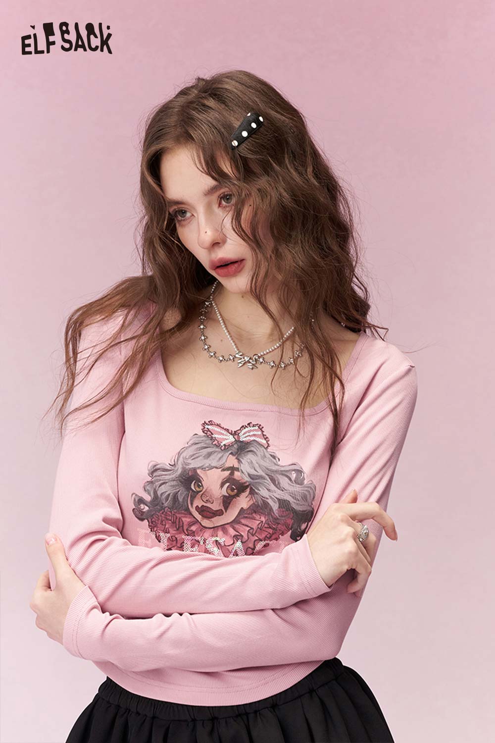 クールなピエロガールプリントスクエアネックシャーリングロングスリーブTシャツ